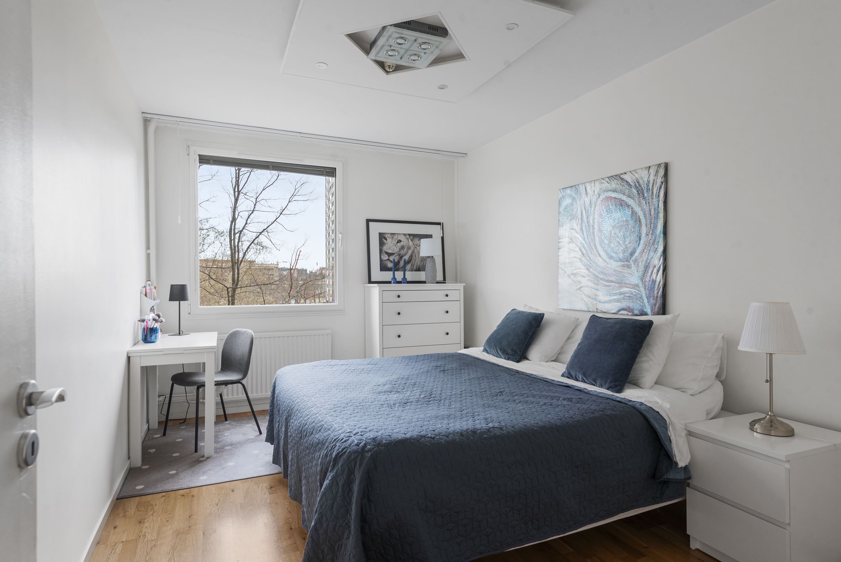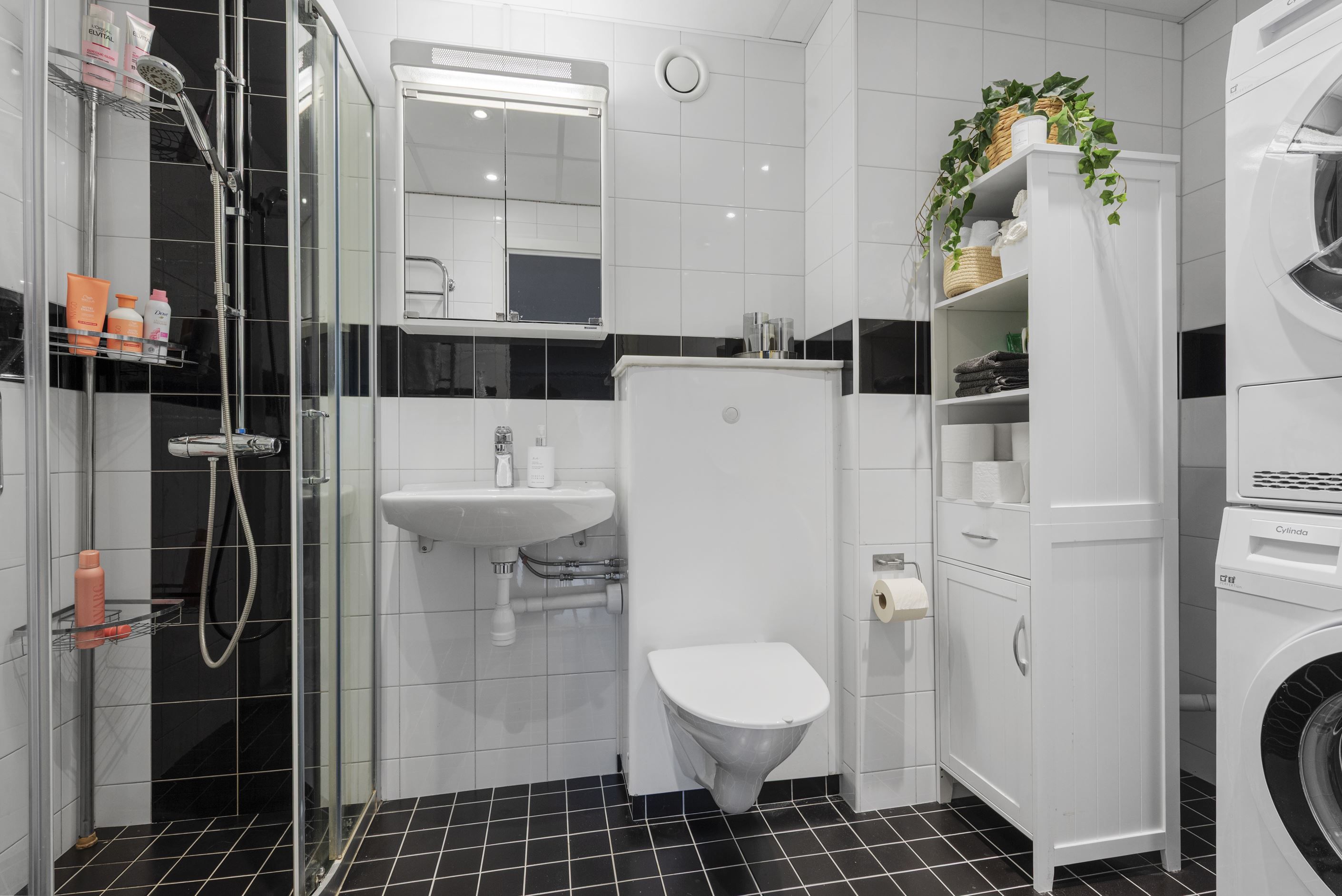Här finns tre bra sovrum med plats för säng och övriga möbler – perfekt för barnfamiljen, hemmakontoret eller gästrummet. Det helkaklade badrummet renoverades 2016 och erbjuder dusch, tvättmaskin och torktumlare samt stilrent svart klinkergolv med golvvärme.