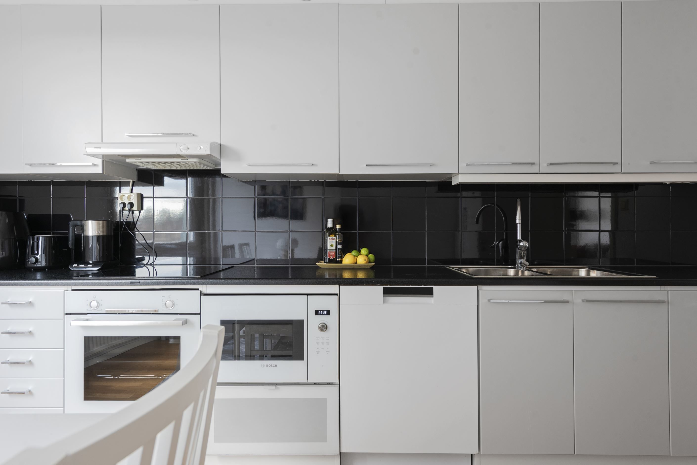 Köket är smakfullt med ljusgrå skåpluckor, svart kakel och bänkskiva i svart laminat. Maskinparken är modern och inkluderar inbyggd spishäll, ugn och mikro från 2025 samt fullhöjd kyl och frys från 2024.