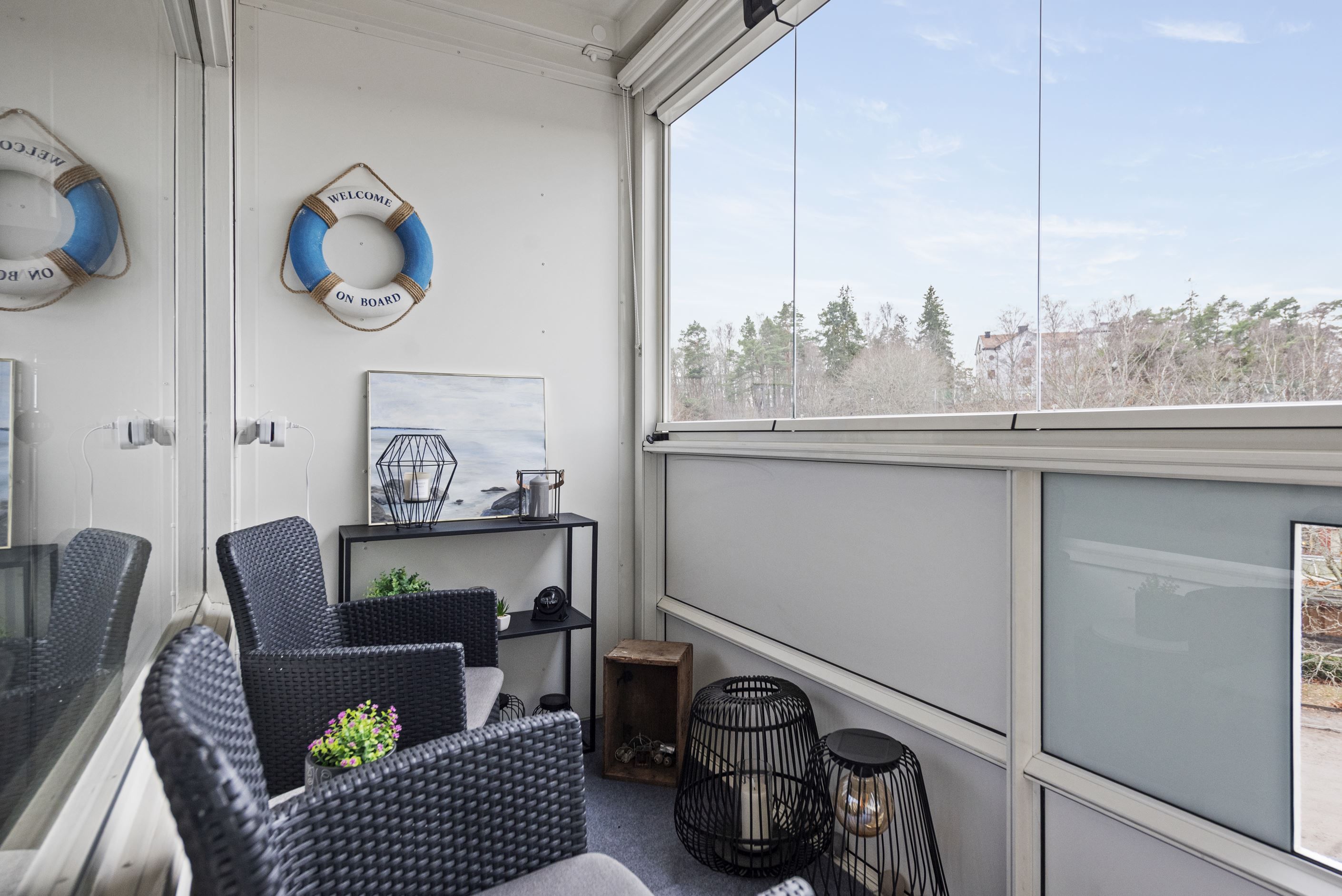 De sociala ytorna är generösa och inbjudande. Vardagsrummet har gott om plats för både soffgrupp och matbord, och härifrån nås den härliga inglasade balkongen – en extra oas att använda större delen av året.