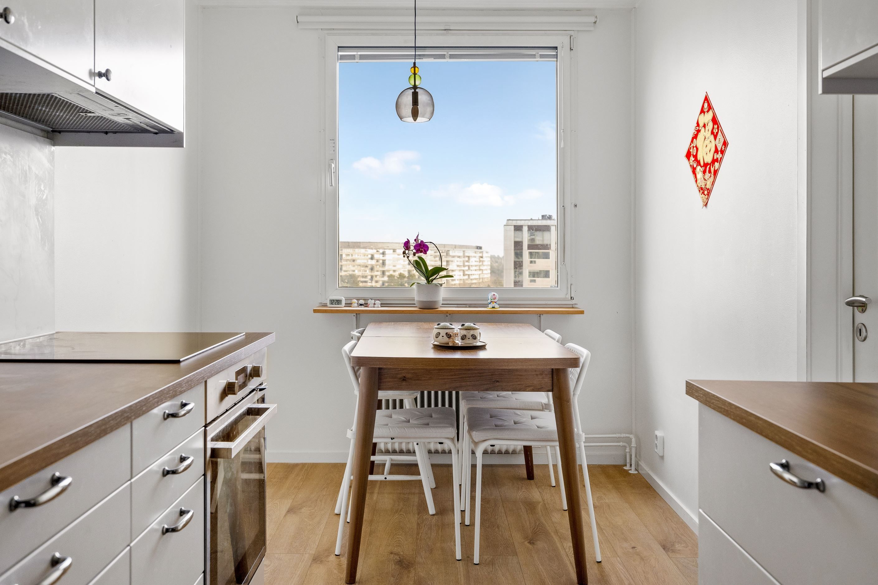 Från lägenheten har du magnifik utsikt över innergård, grindtorp och Täby centrum.