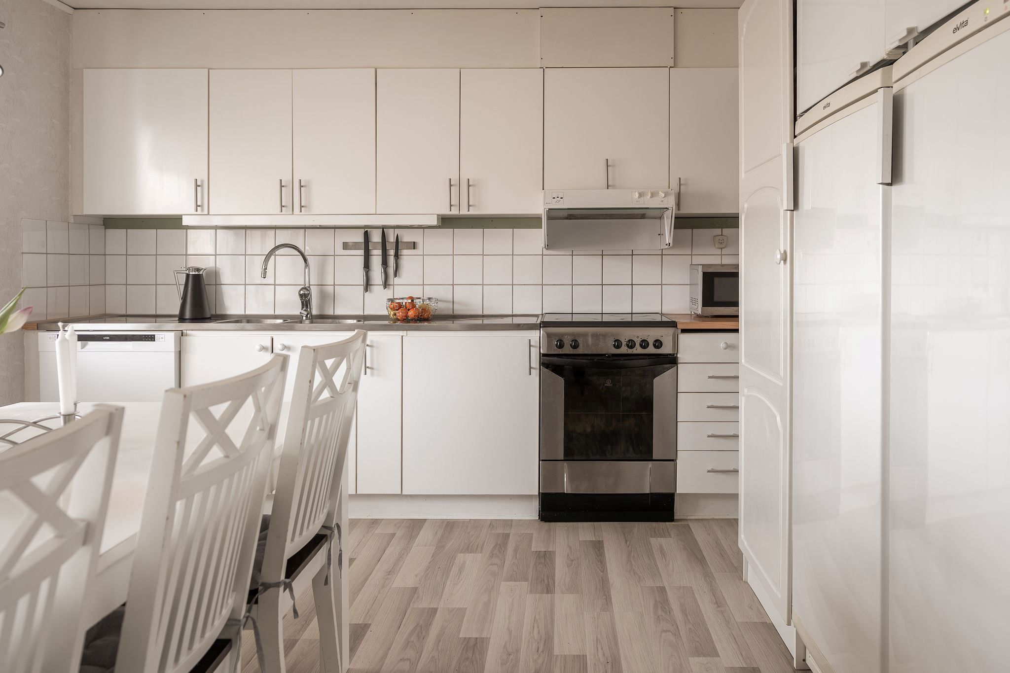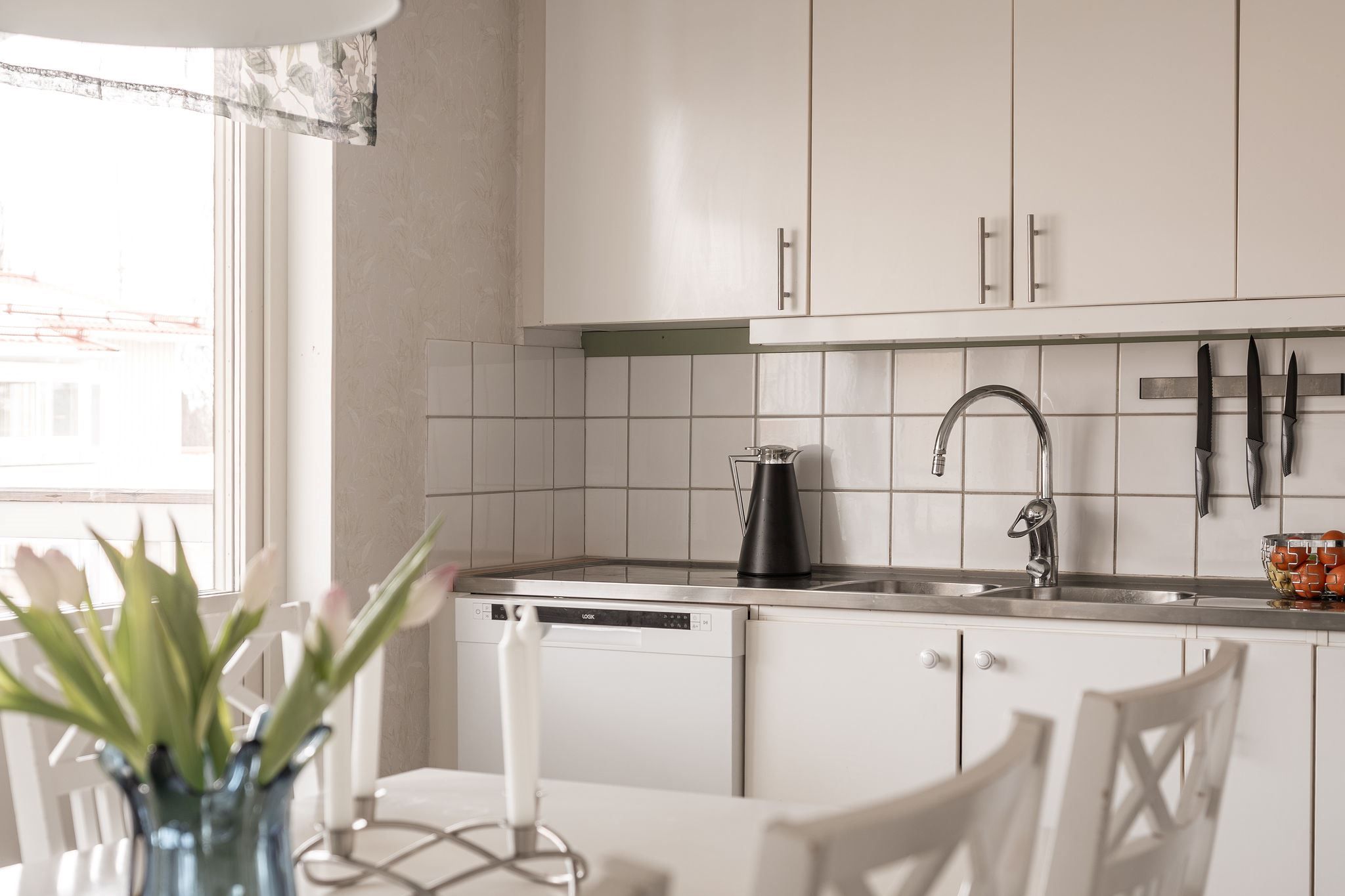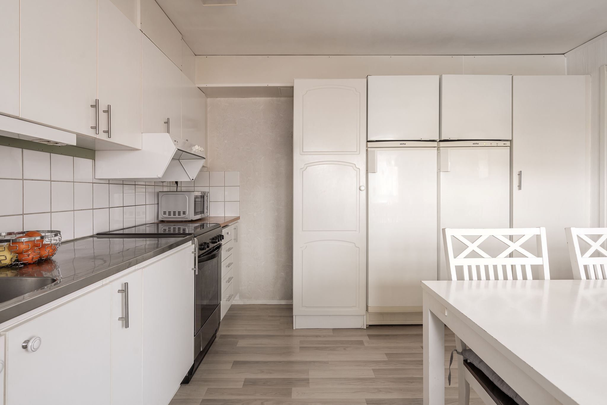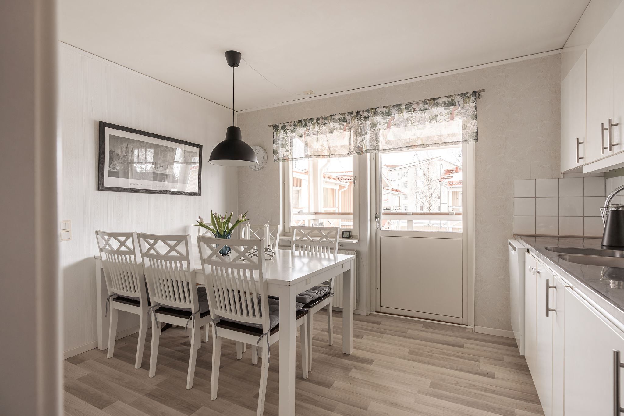 Köket är generöst tilltaget och erbjuder gott om plats för matbord, perfekt för trevliga middagar med nära och kära. Balkongen ligger i anslutning till köket. Belägen mot innergården.