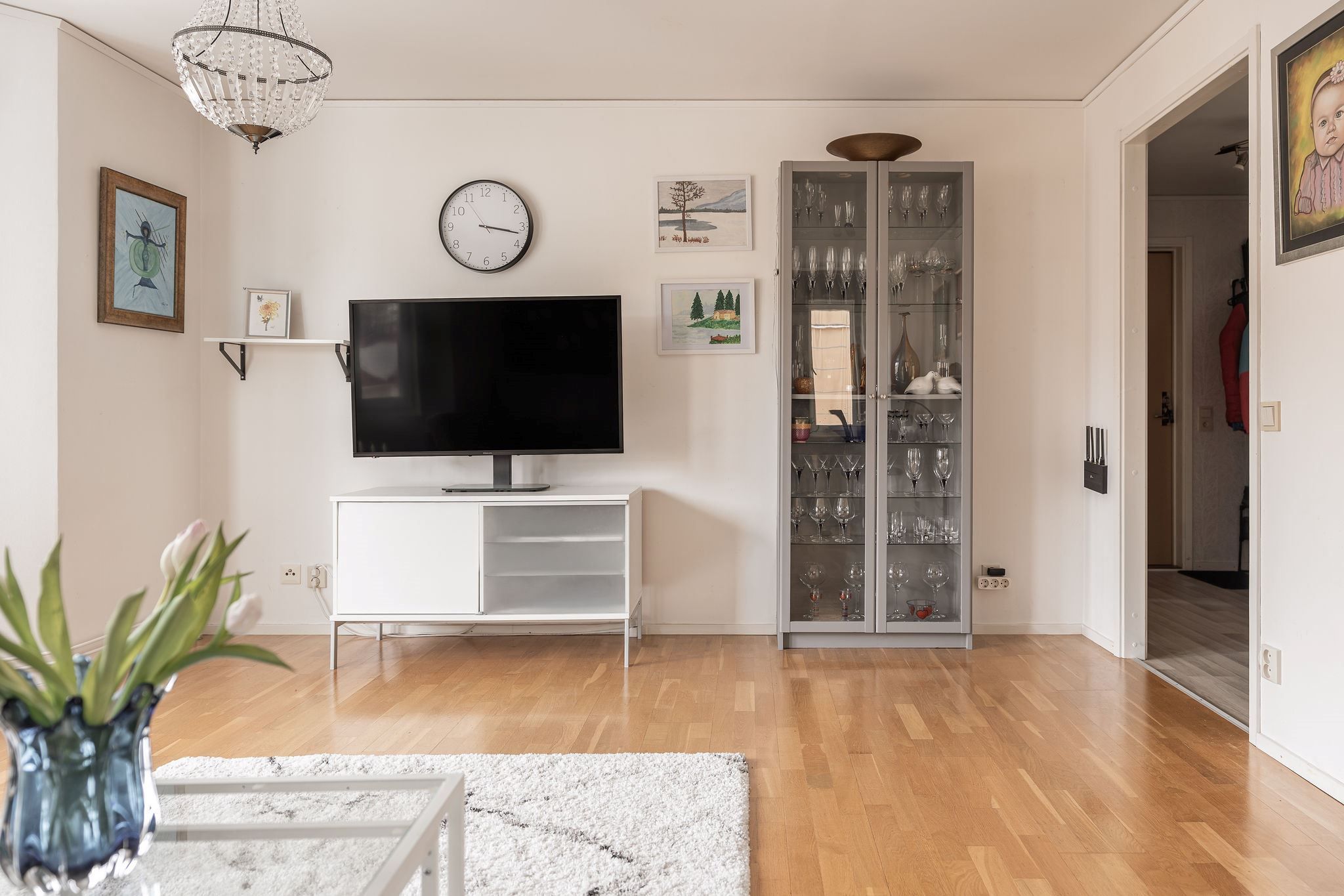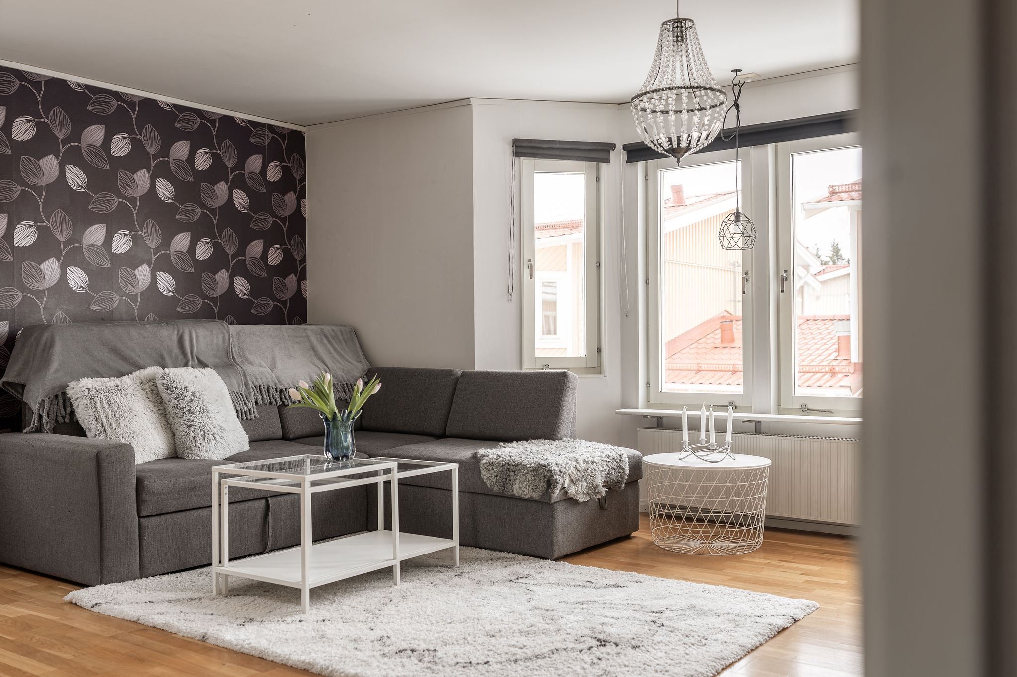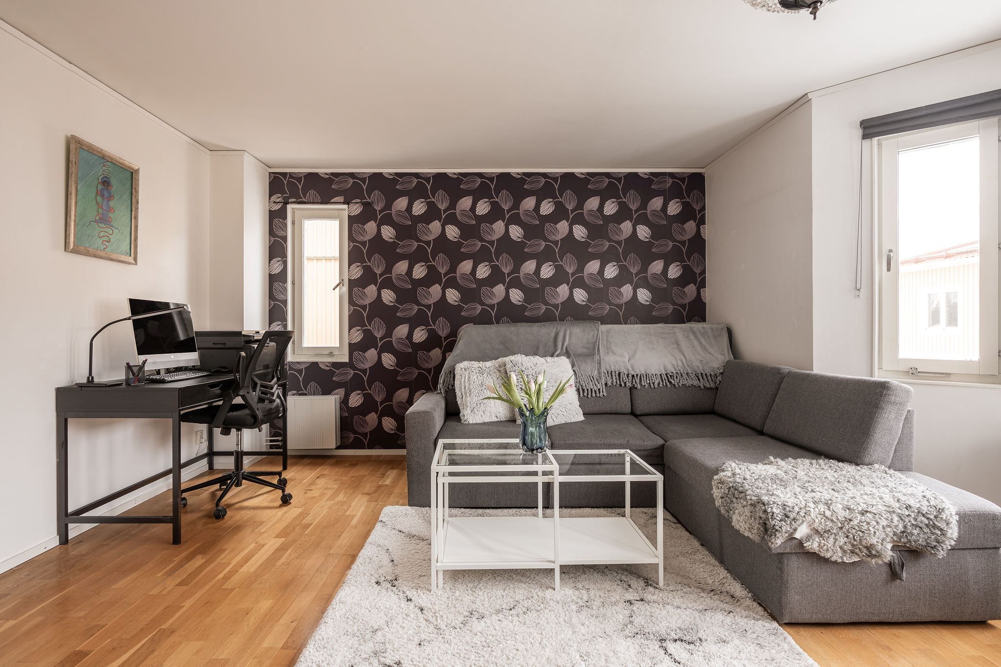 Lägenheten har ett mysigt vardagsrum med ett charmigt burspråk som ger karaktär och extra ljus.
