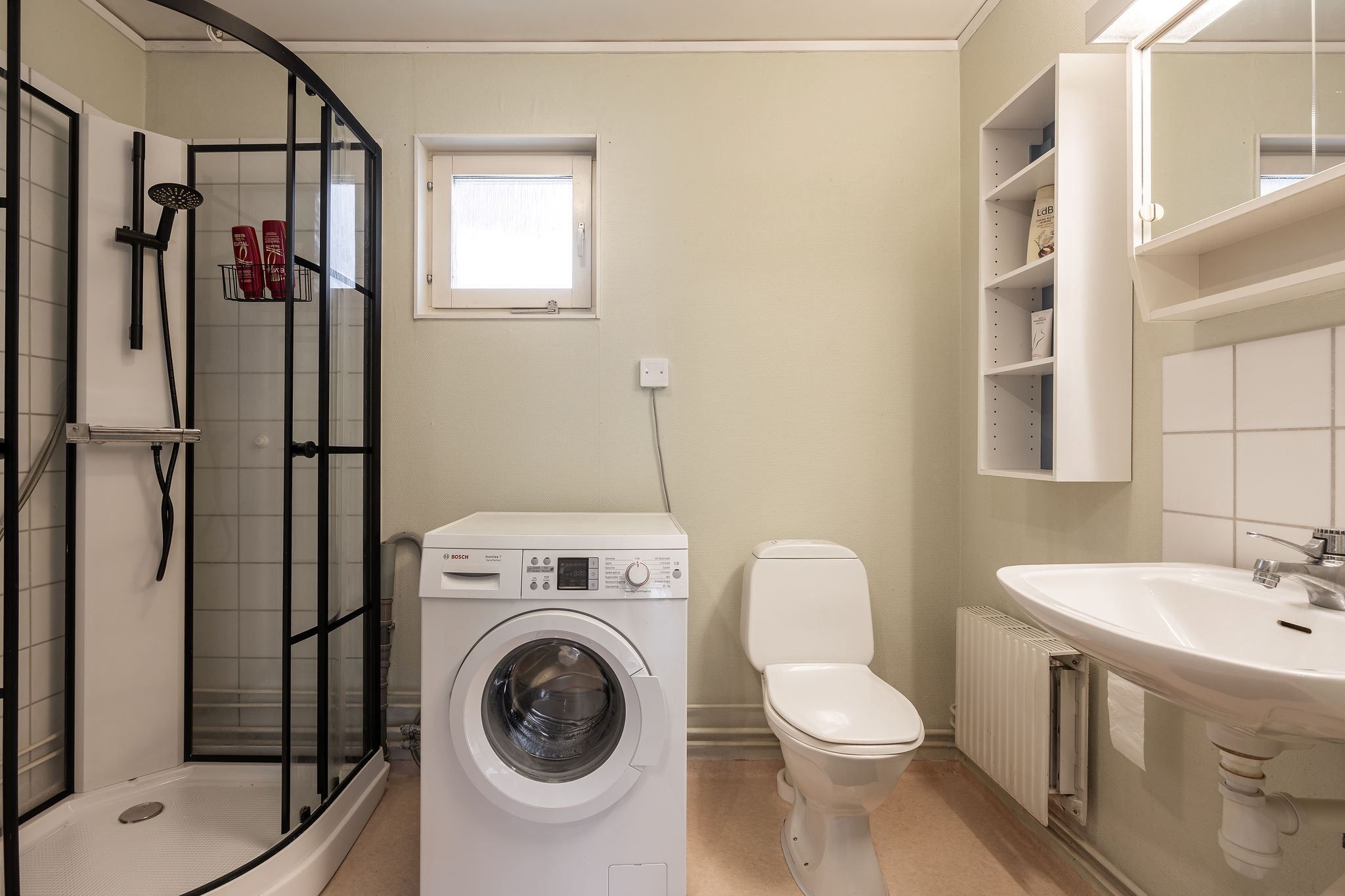 Badrummet har en dusch och egen tvättmaskin för bekvämlighet i vardagen.