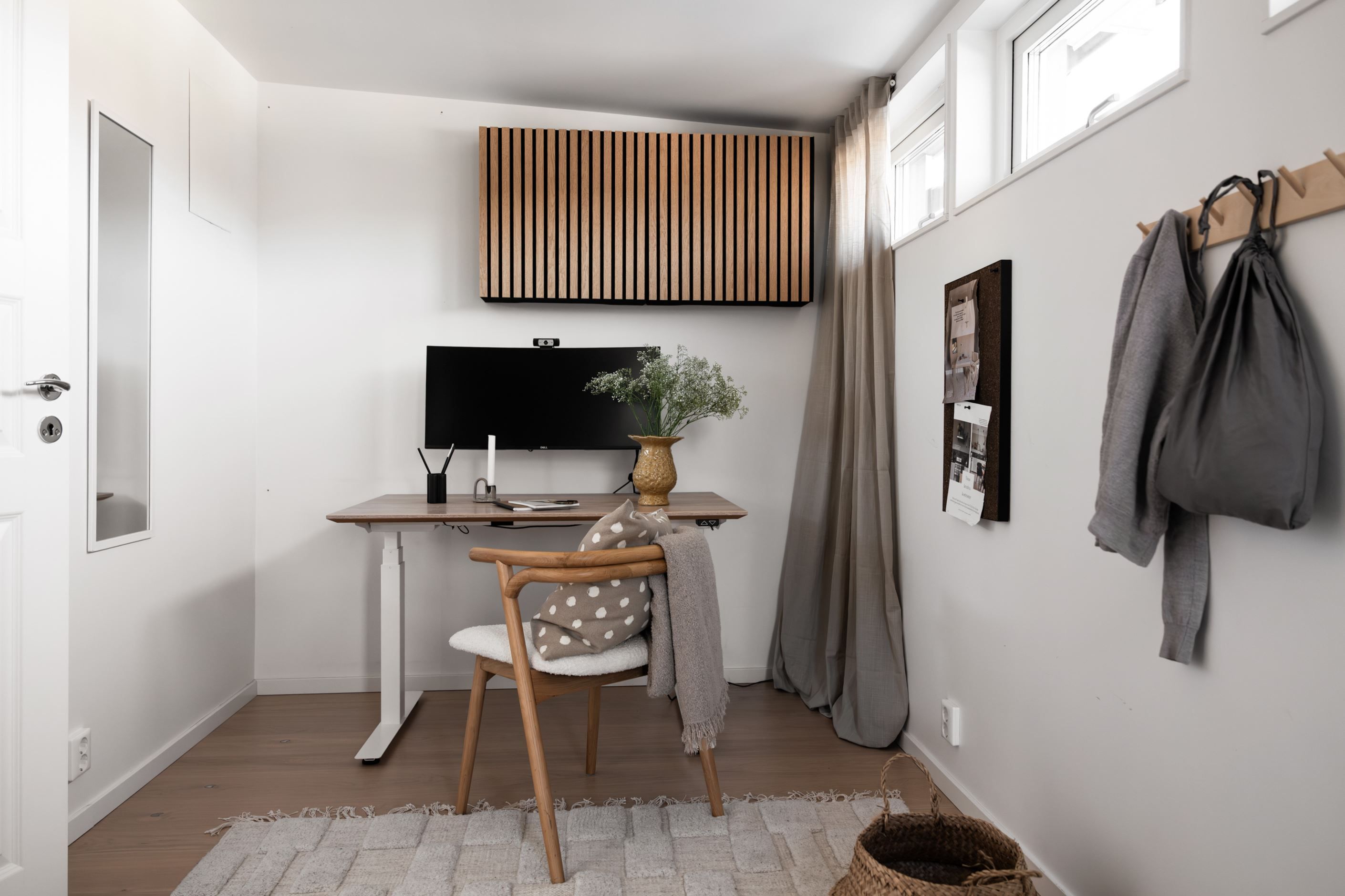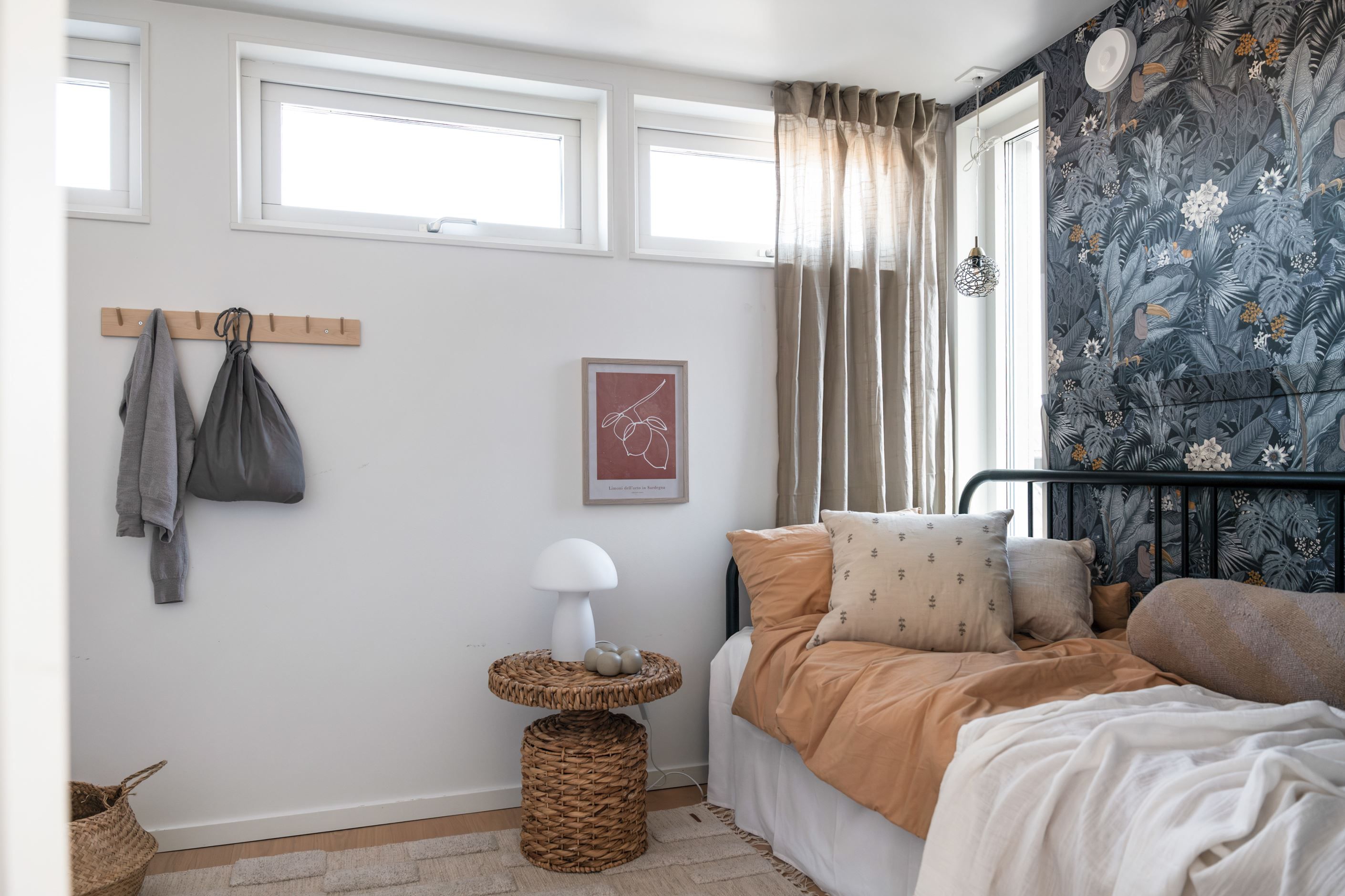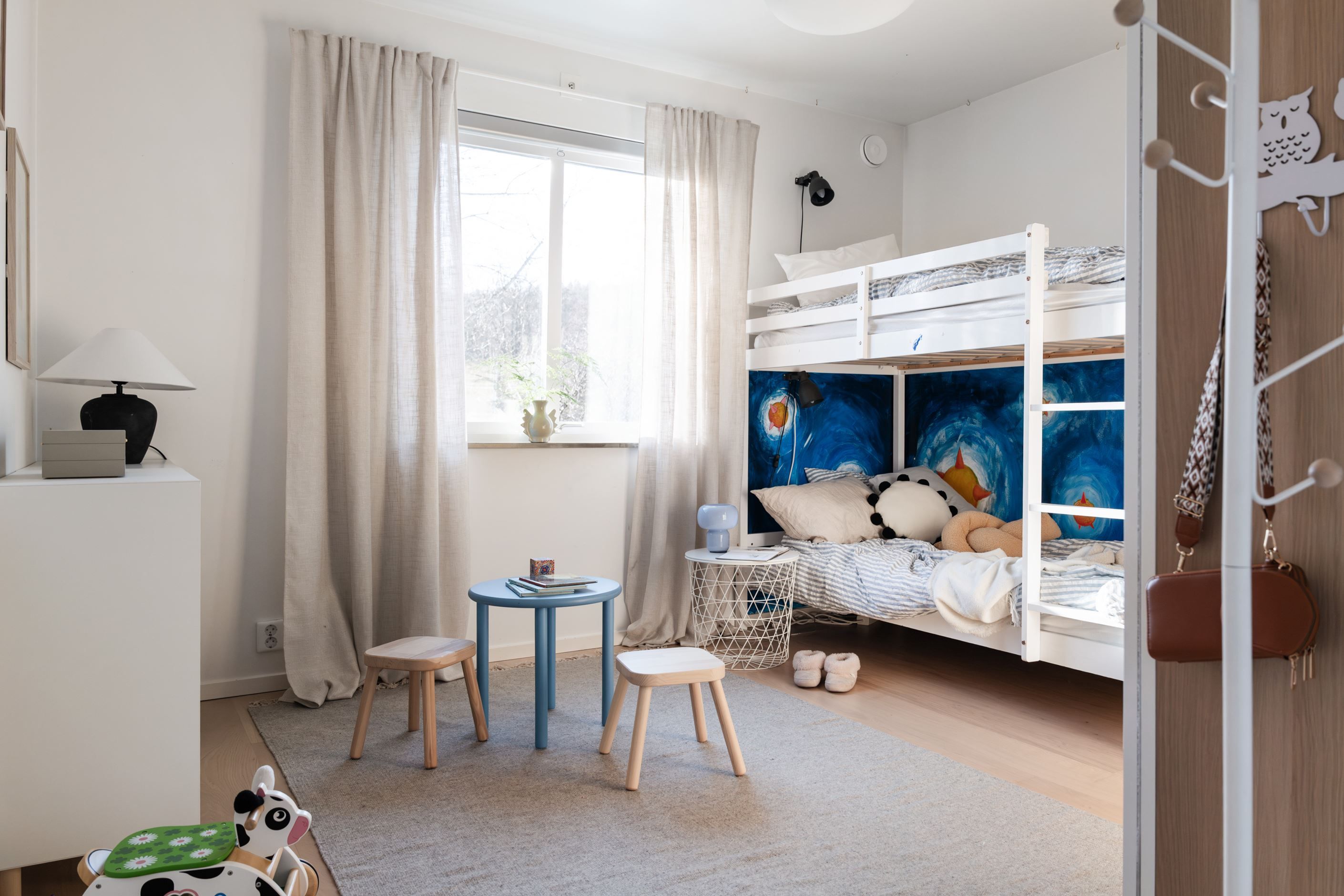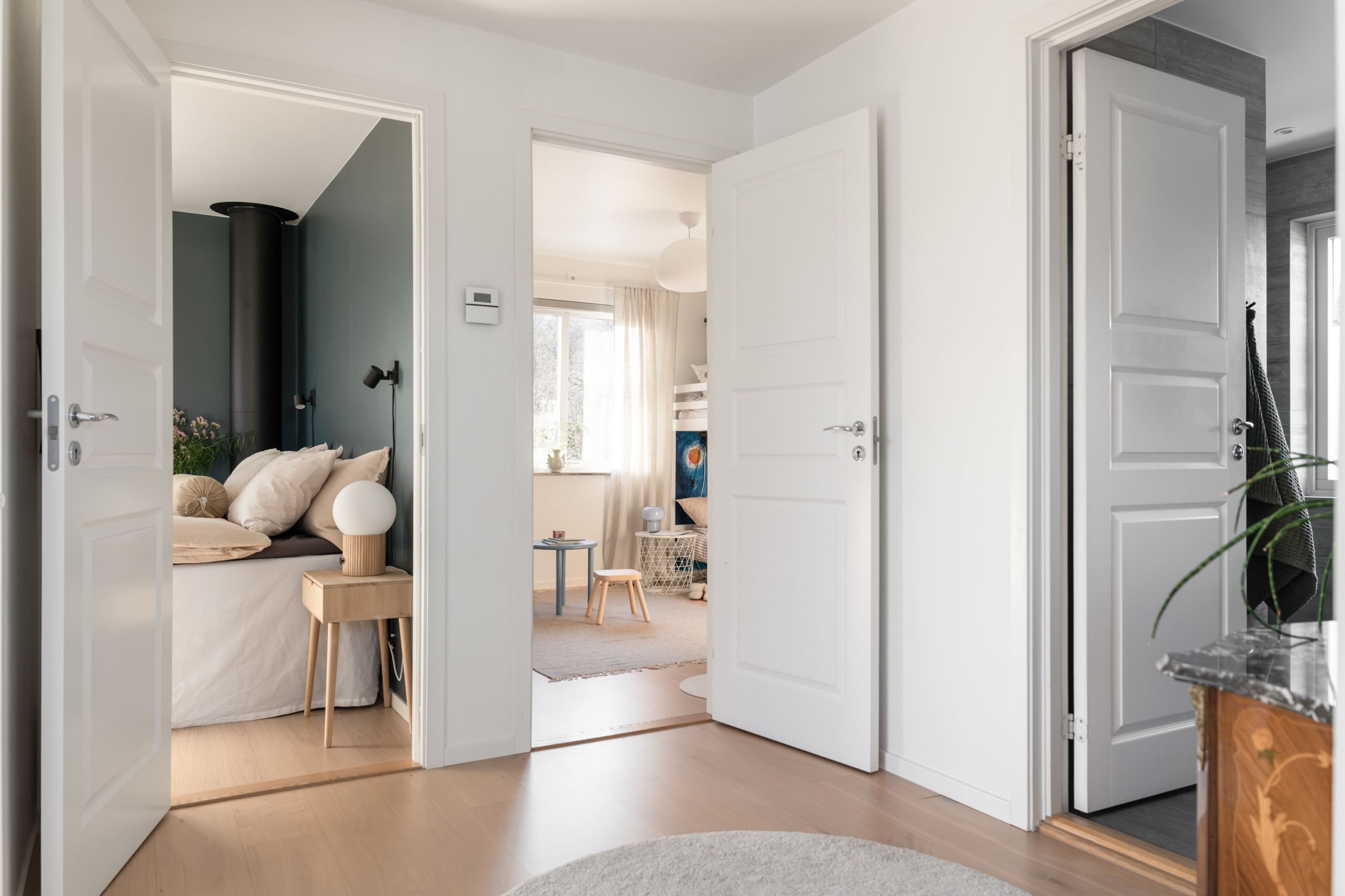 En trappa upp väntar privatlivet. Ovanvåningen rymmer tre rymliga sovrum, alla genomgående och varsamt renoverade med fingertoppskänsla för färg och form. Här finns ytterligare ett fräscht badrum med dusch, vilket underlättar vardagslogistiken för hela familjen.