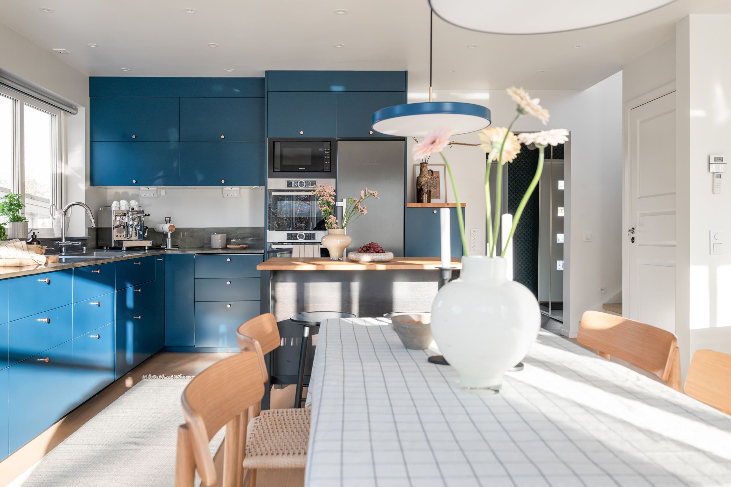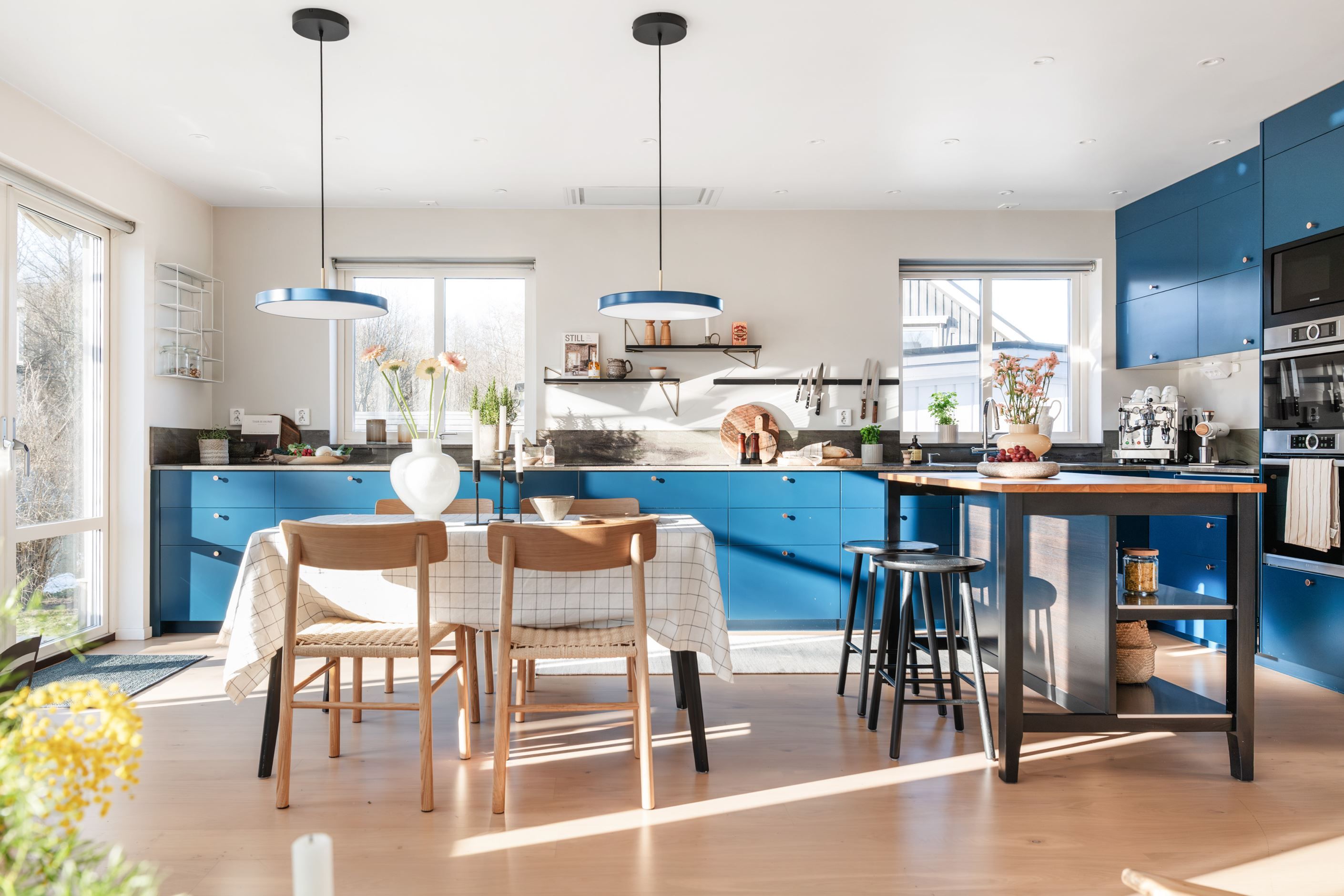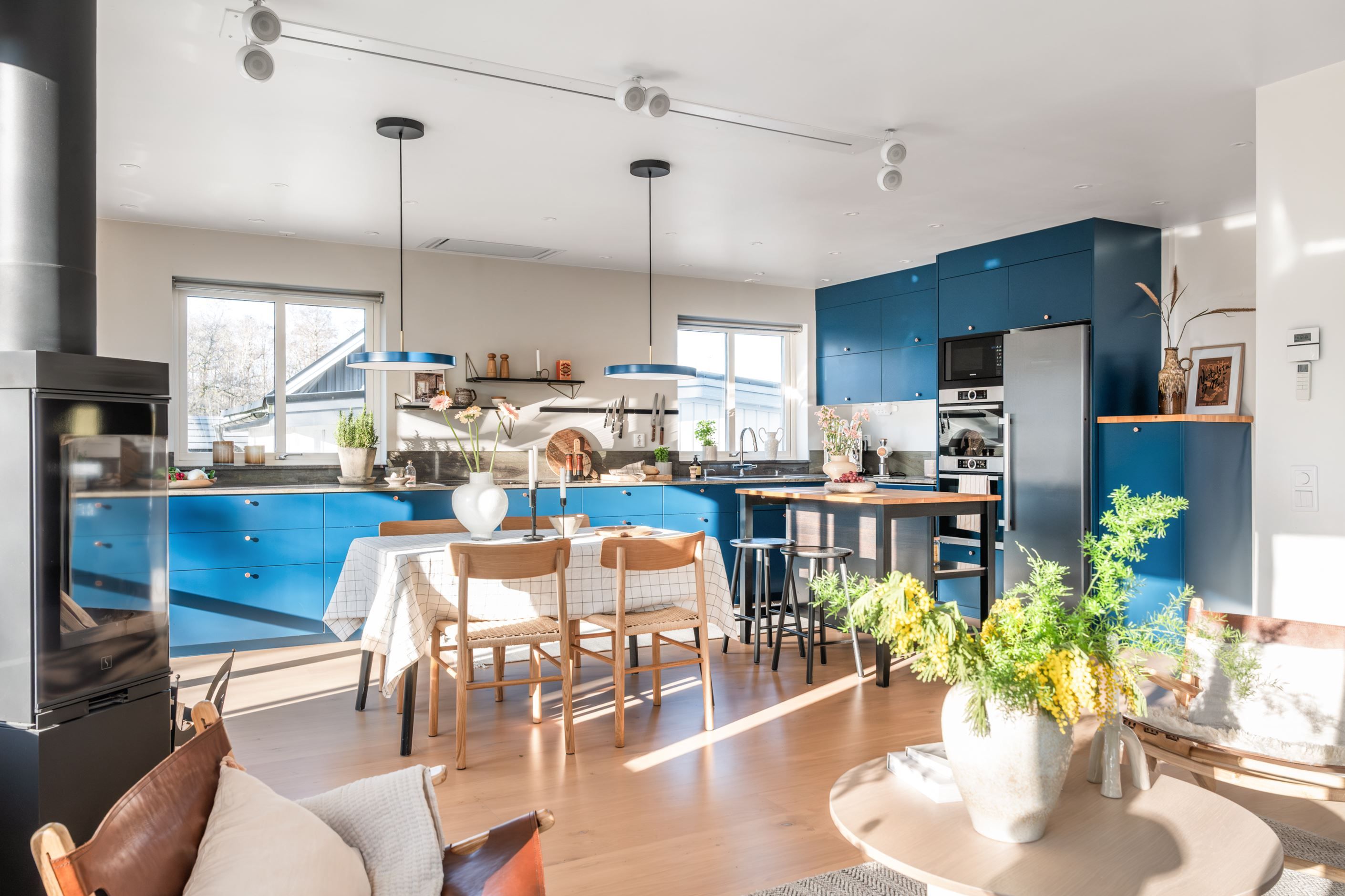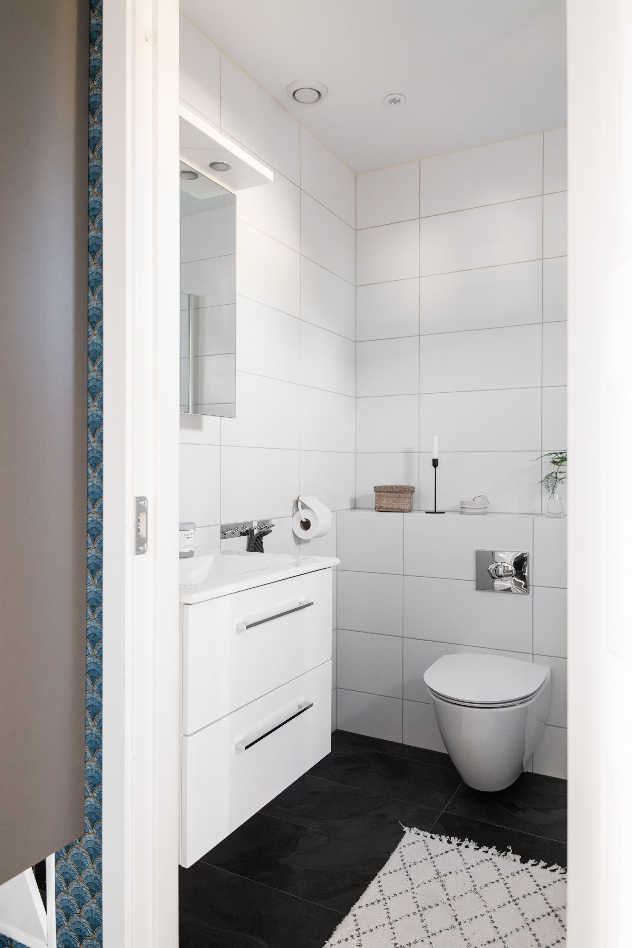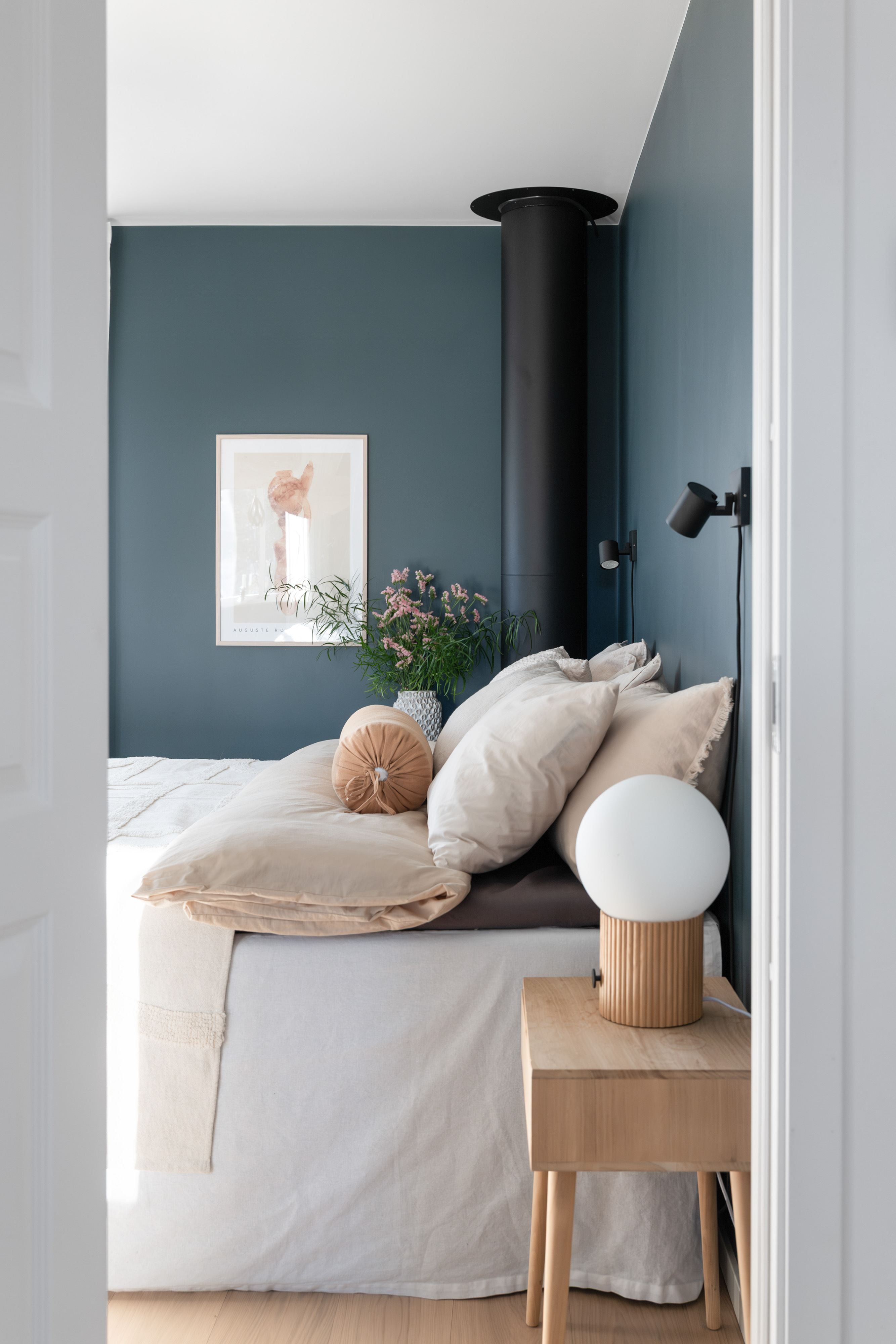 En trappa upp väntar privatlivet. Ovanvåningen rymmer tre rymliga sovrum, alla genomgående och varsamt renoverade med fingertoppskänsla för färg och form. Här finns ytterligare ett fräscht badrum med dusch, vilket underlättar vardagslogistiken för hela familjen.