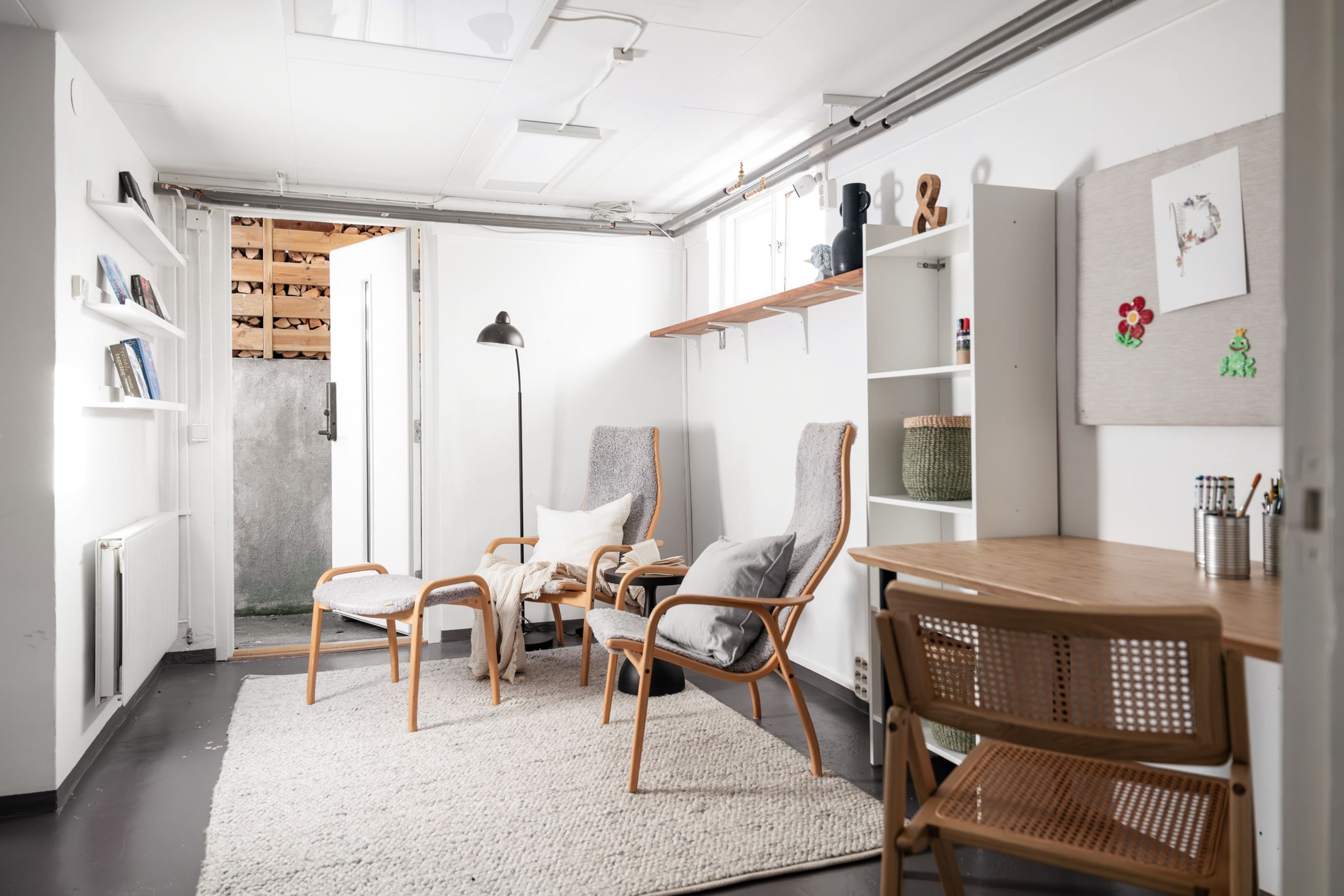 Källaren är rymlig och här finns en stor tvättstuga, hobbyrum samt ett rum att använda efter behov som tv-rum/kontor eller gästrum. Här finns även gott om förvaring samt en sval matkällare.