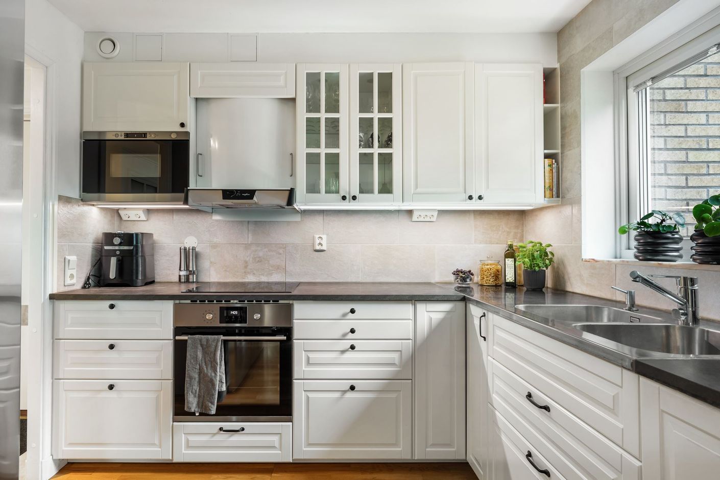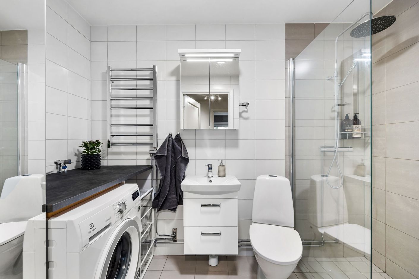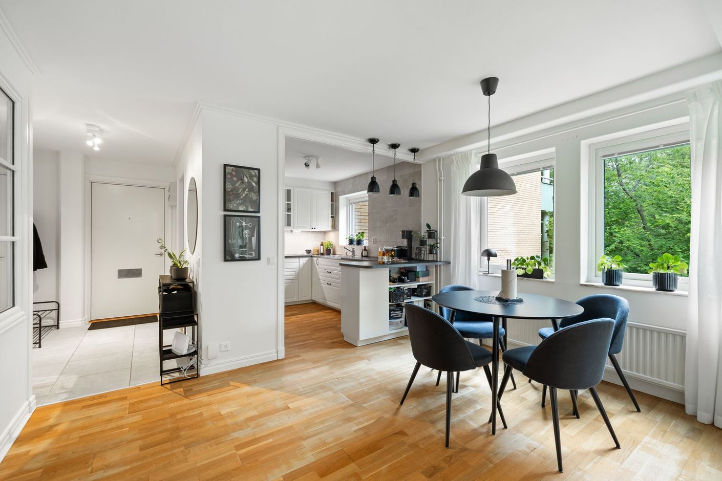 Den halvöppna planlösningen mellan kök och matplats skapar ett socialt flöde som vidare öppnar upp mot vardagsrummet. Här släpper stora fönsterpartier in rikligt med dagsljus och bidrar till en ljus och luftig känsla. Badrummet är helkaklat, rymligt och välutrustat med både god förvaring och tvättmaskin – en praktisk och uppskattad lösning i vardagen.