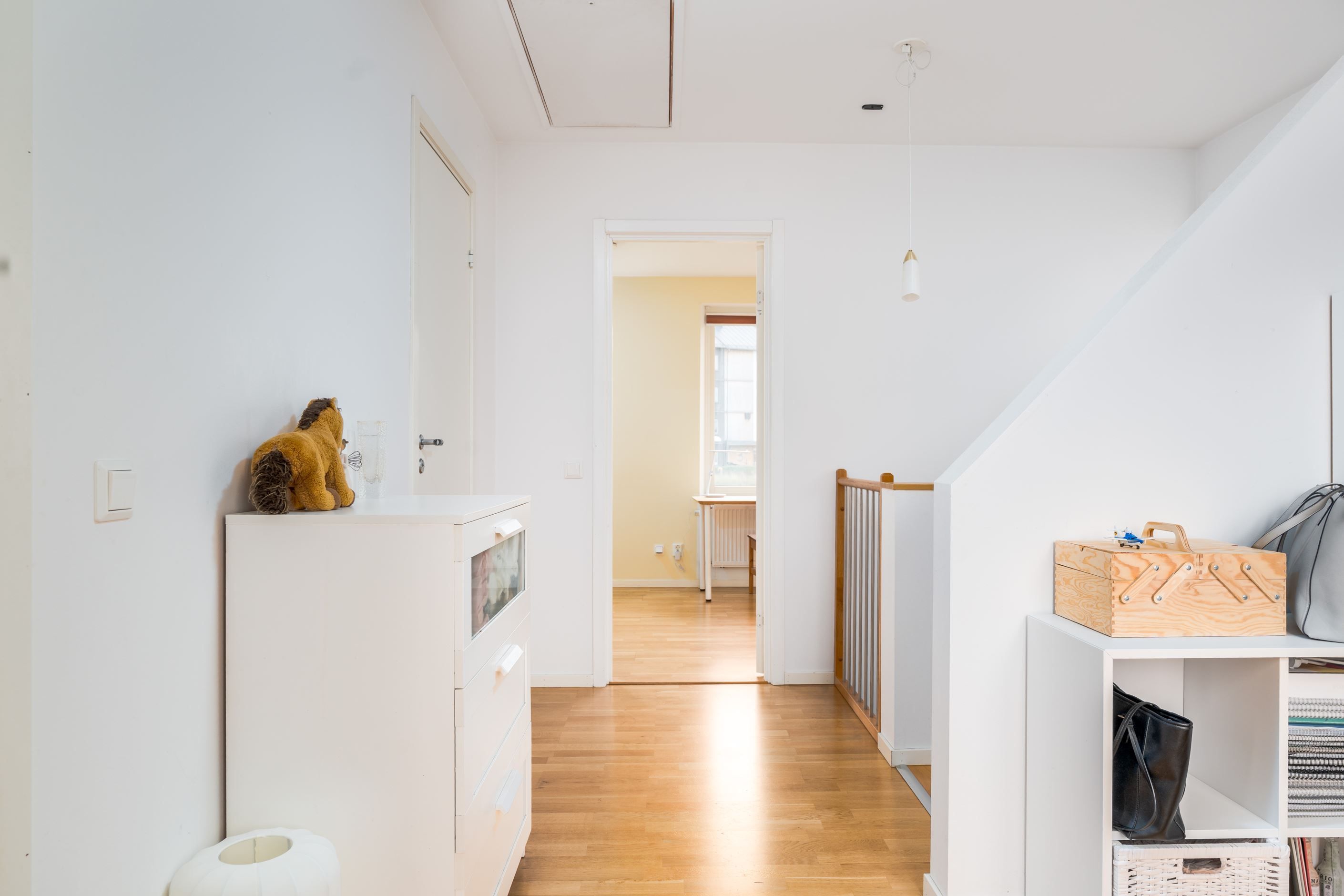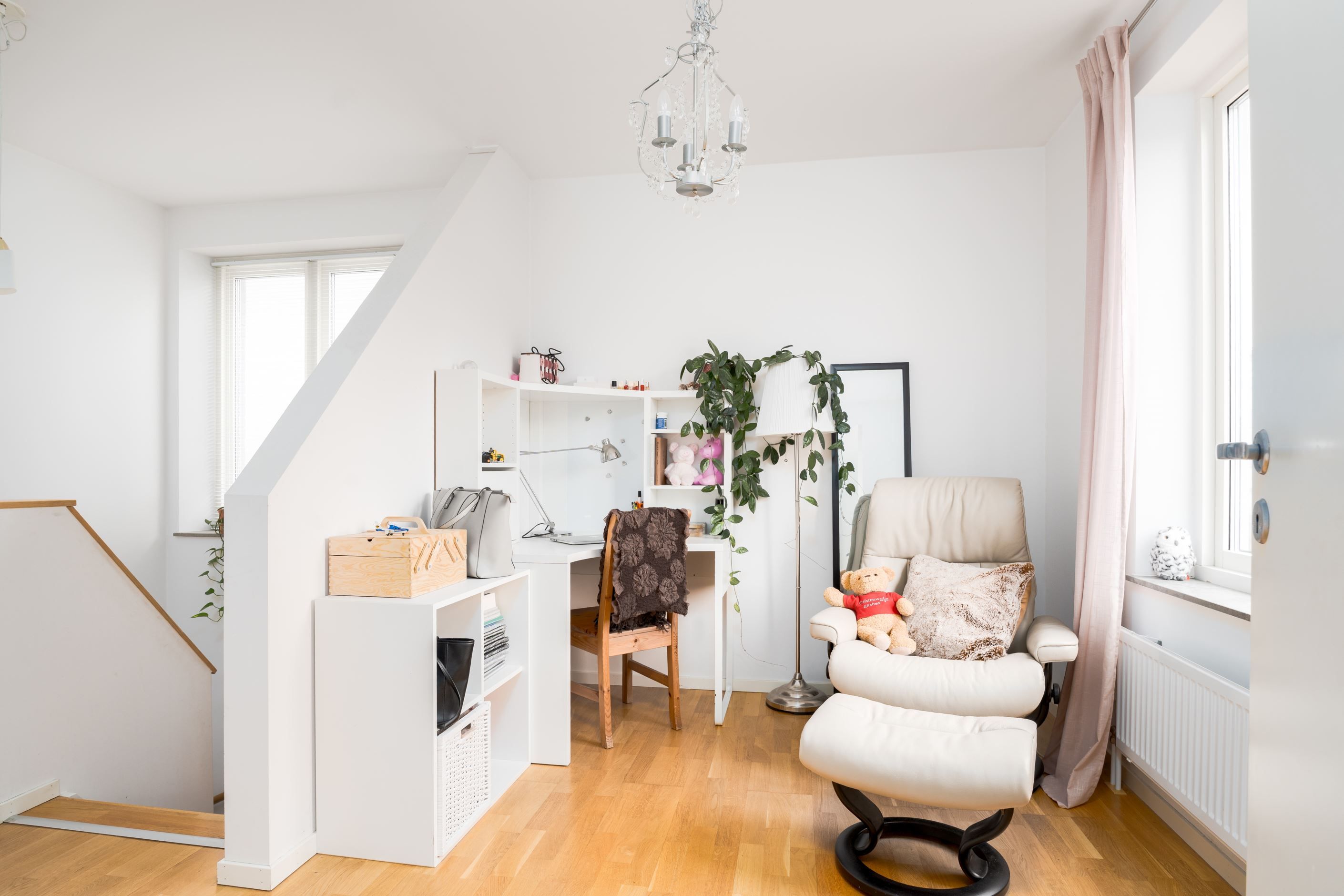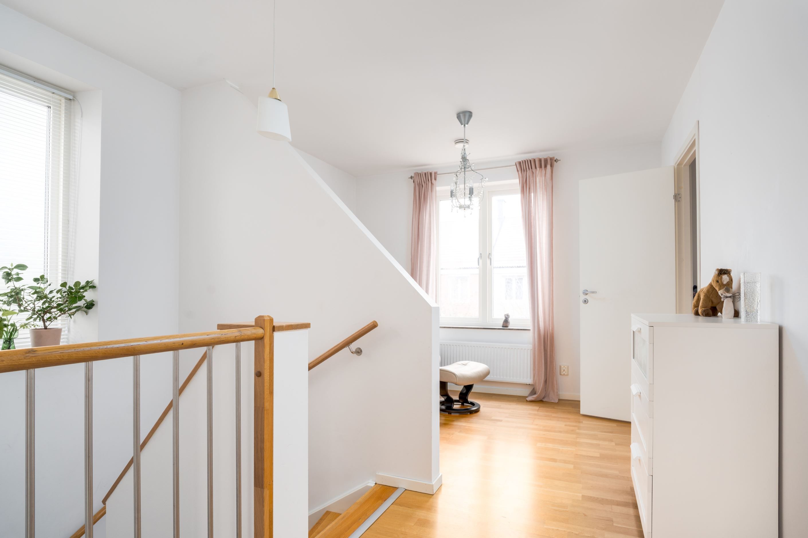 På övre plan finns två fina sovrum, ett rymligt allrum som enkelt kan göras om till ytterligare sovrum samt ett helkaklat badrum med badkar. På entréplan finns ett stilrent duschrum med tvättmaskin och torktumlare samt en ljus och välkomnande hall med gott om avhängningsmöjligheter.