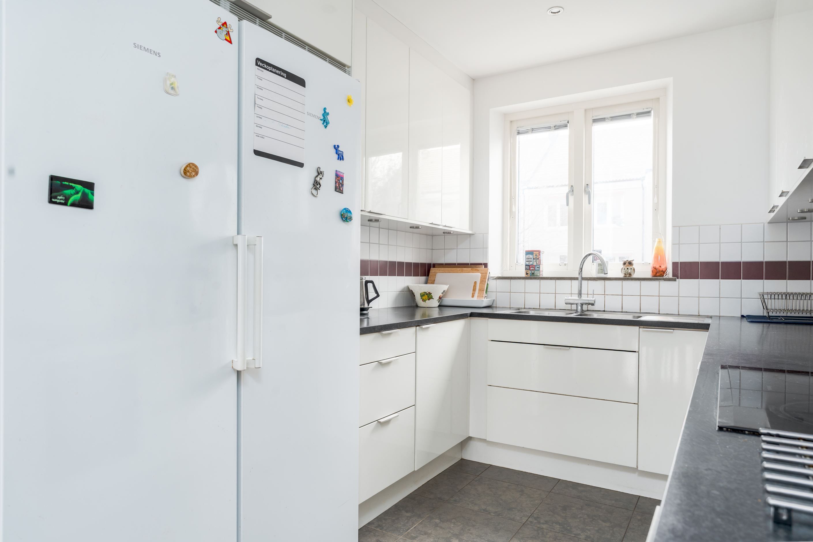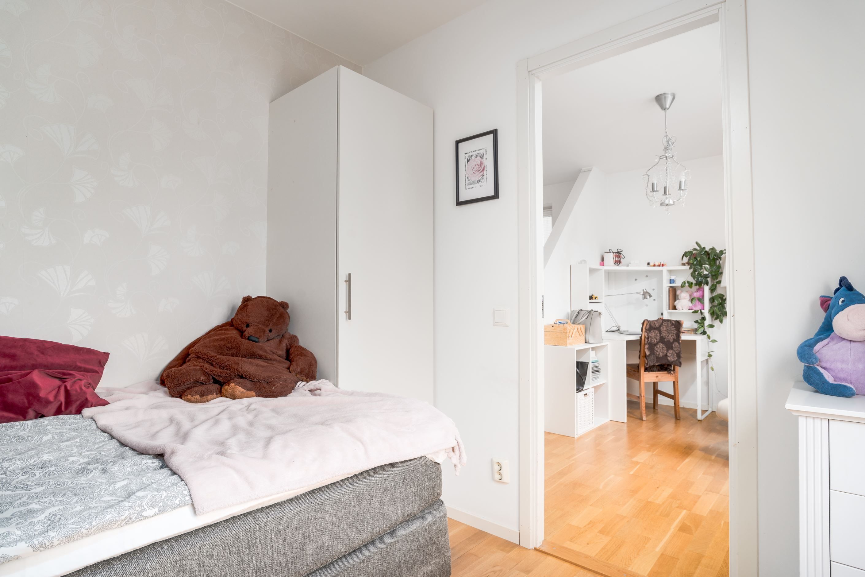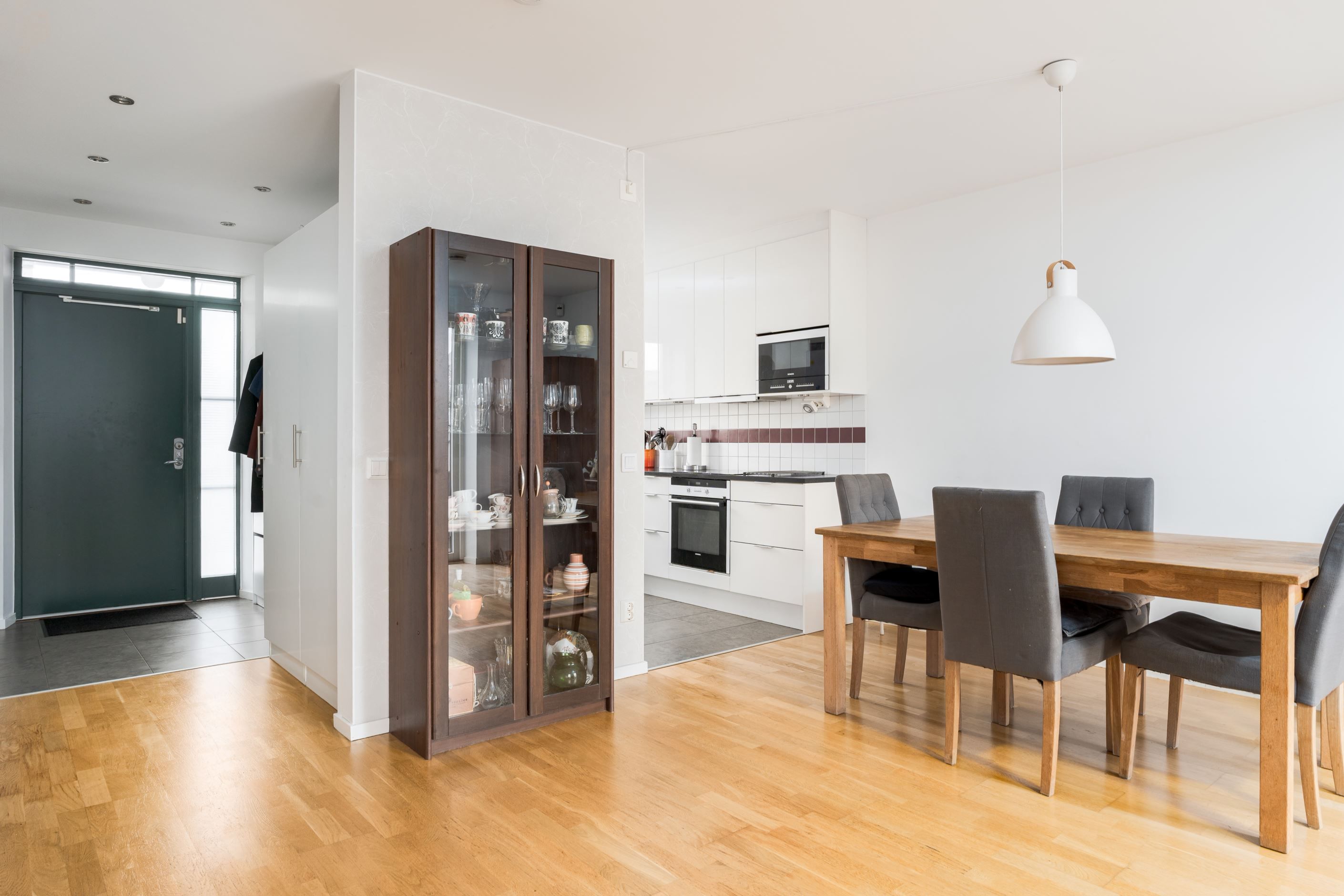 Bostaden är genomtänkt planerad för familjeliv med plats för både lek och umgänge. Det ljusa vardagsrummet har utgång till en solig altan i söderläge, perfekt för middagar och avkoppling. Köket är fullt utrustat med gott om förvaring och en trevlig matplats, och den öppna planlösningen mot vardagsrummet skapar en både social och funktionell miljö.