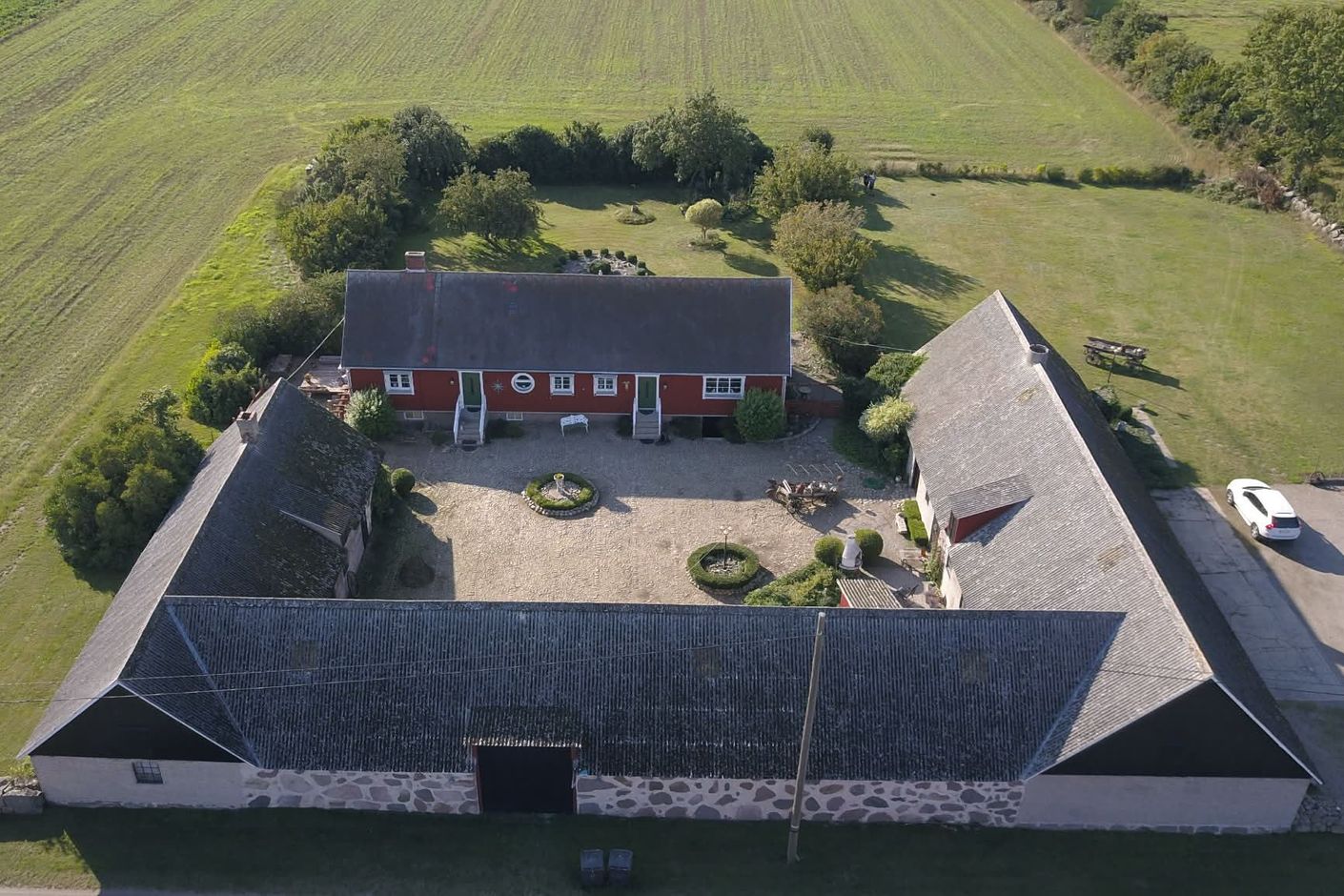 Gårdsbilden är lika klassisk som inbjudande. De stora, vackra 1800-talslängorna ramar in en skyddad och trivsam innergård som skapar en privat oas mitt i det öppna landskapet. Här kan man njuta av lugna morgnar, långa sommarkvällar och sociala tillställningar i en miljö som andas genuin gårdskaraktär. Längorna har nyligen murats om och målades så sent som 2024, vilket ger ett mycket välvårdat intryck samtidigt som den historiska känslan är bevarad.