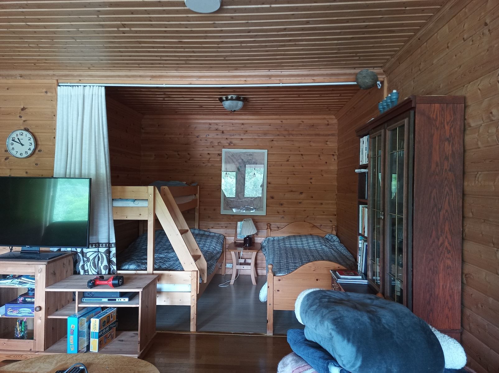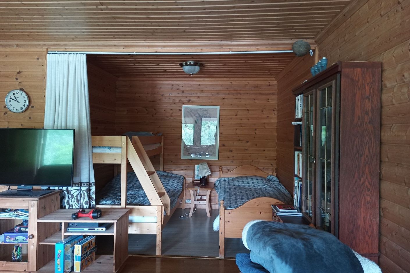 Huvudbyggnaden rymmer vardagsrum med sovalkov, kök, matsal, två sovrum och toalett. I vardagsrummet finns en entré från den vidbyggda altanen på framsidan. Vardagsrummet har parkettgolv, träpanelväggar, luftvärmepump och en eldstad. Här finns även en alkov som erbjuder yta för exempelvis ytterligare sovplatser.