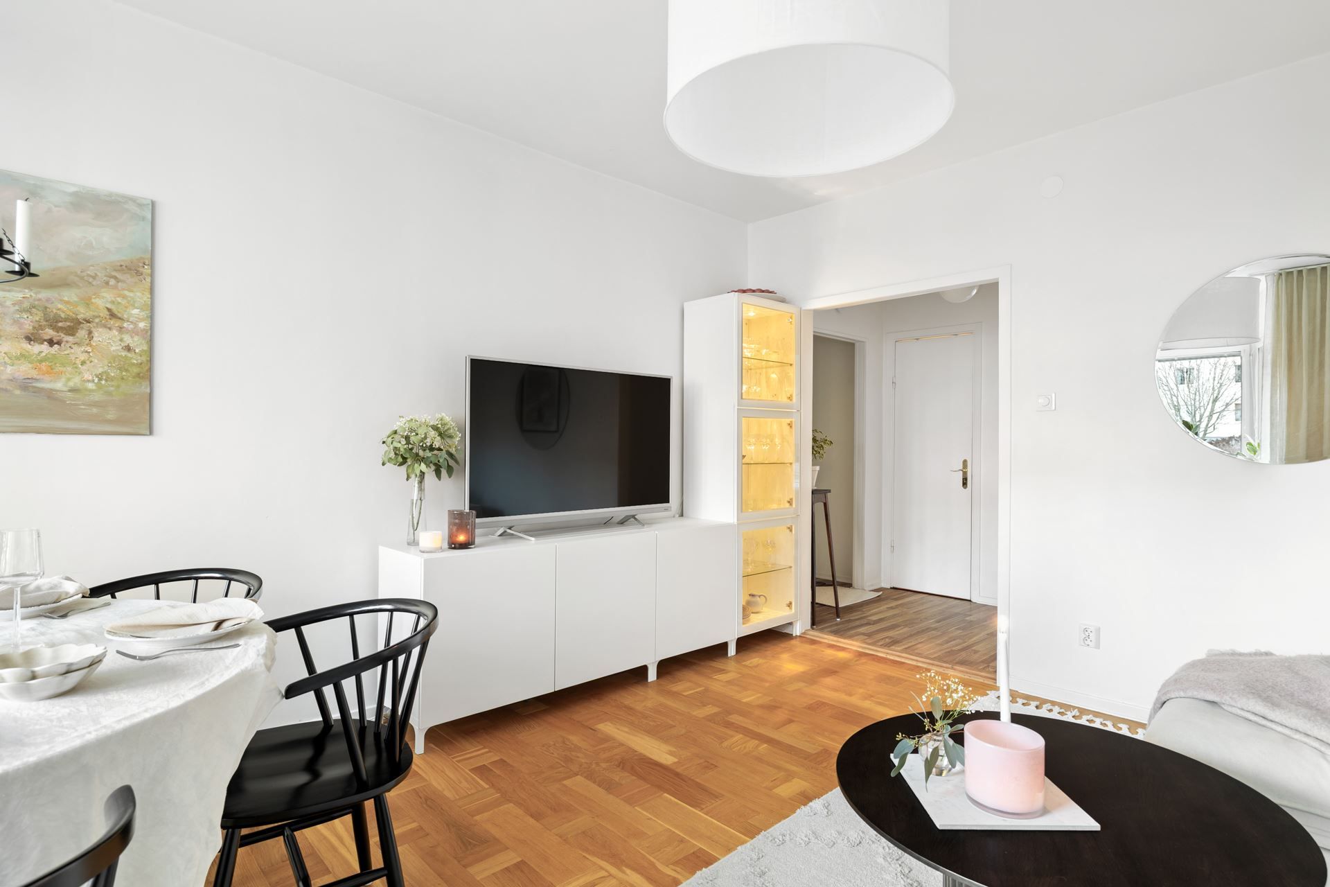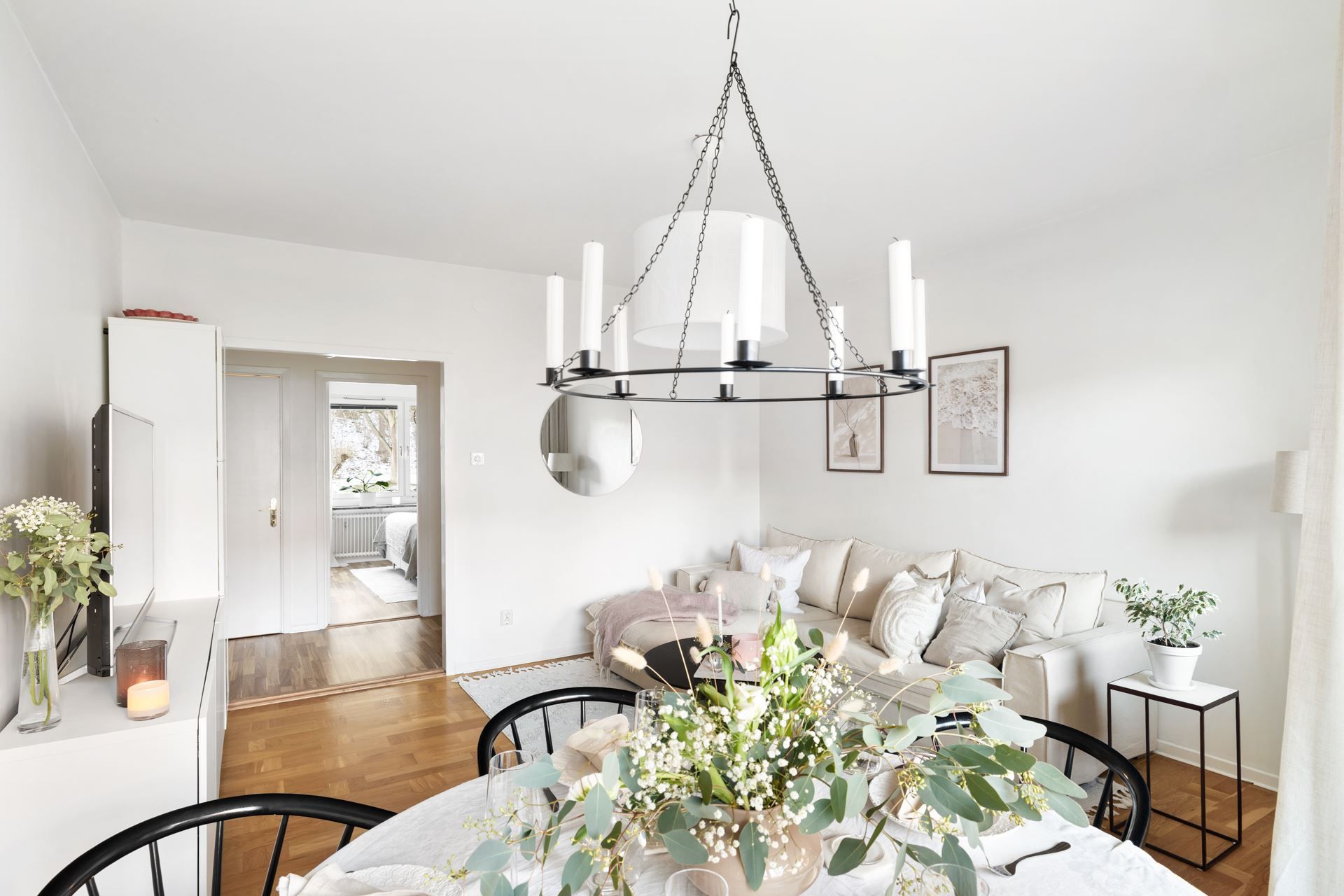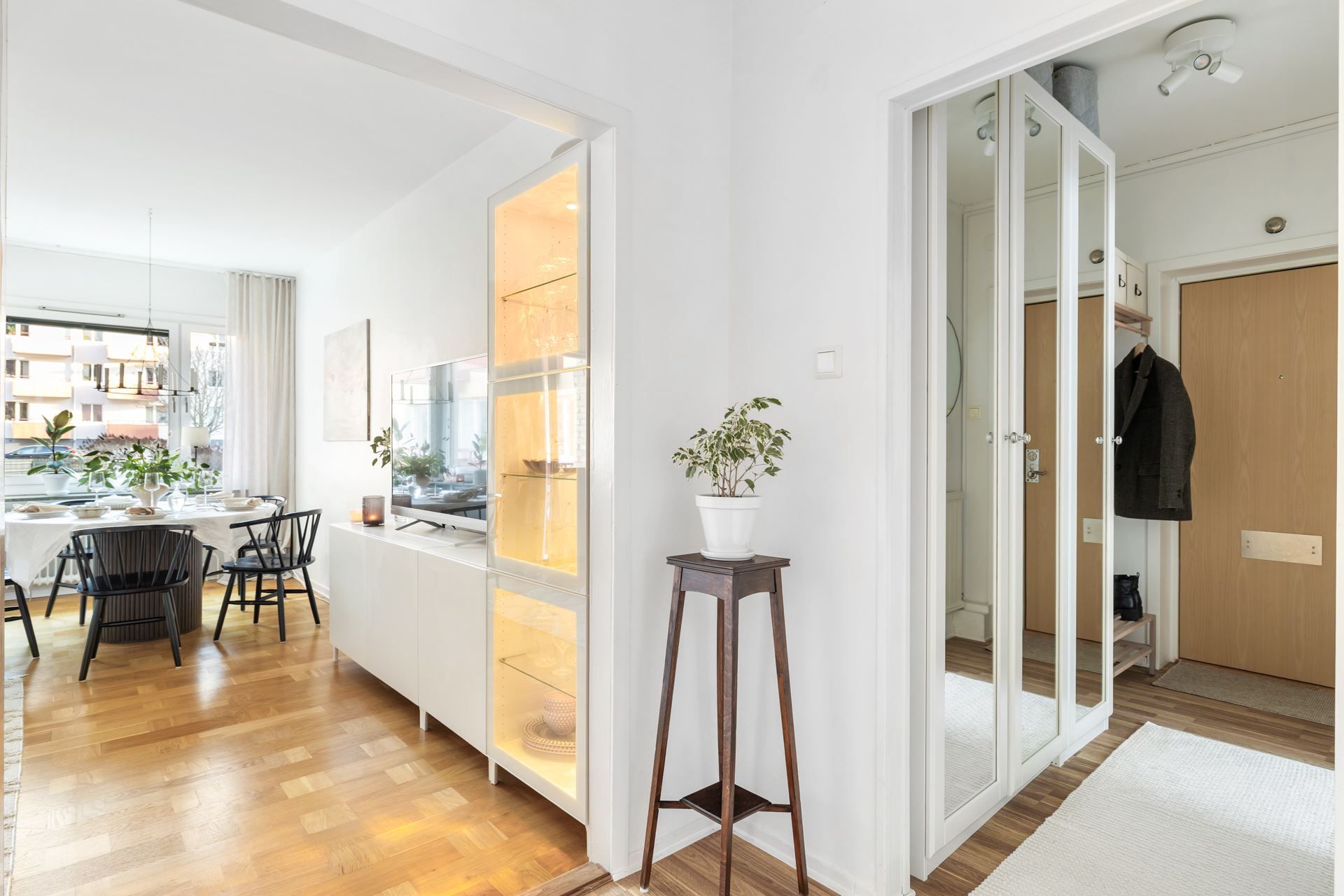 Bostadens 55,5 kvm är smart planerade och placerade en halvtrappa upp, vilket ger ett härligt ljusinsläpp samtidigt som du bor med minimal insyn. Redan i hallen möts du av gott om avhängningsmöjligheter och en välkomnande känsla. Intill ligger det mysiga köket där bevarad charm kombineras med bra arbetsytor och en matplats för fyra.