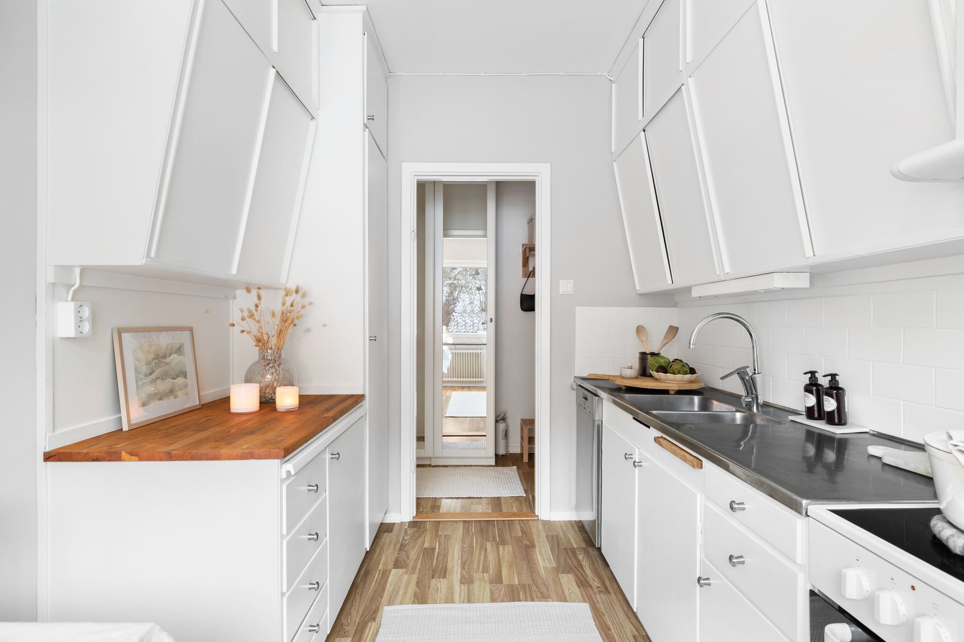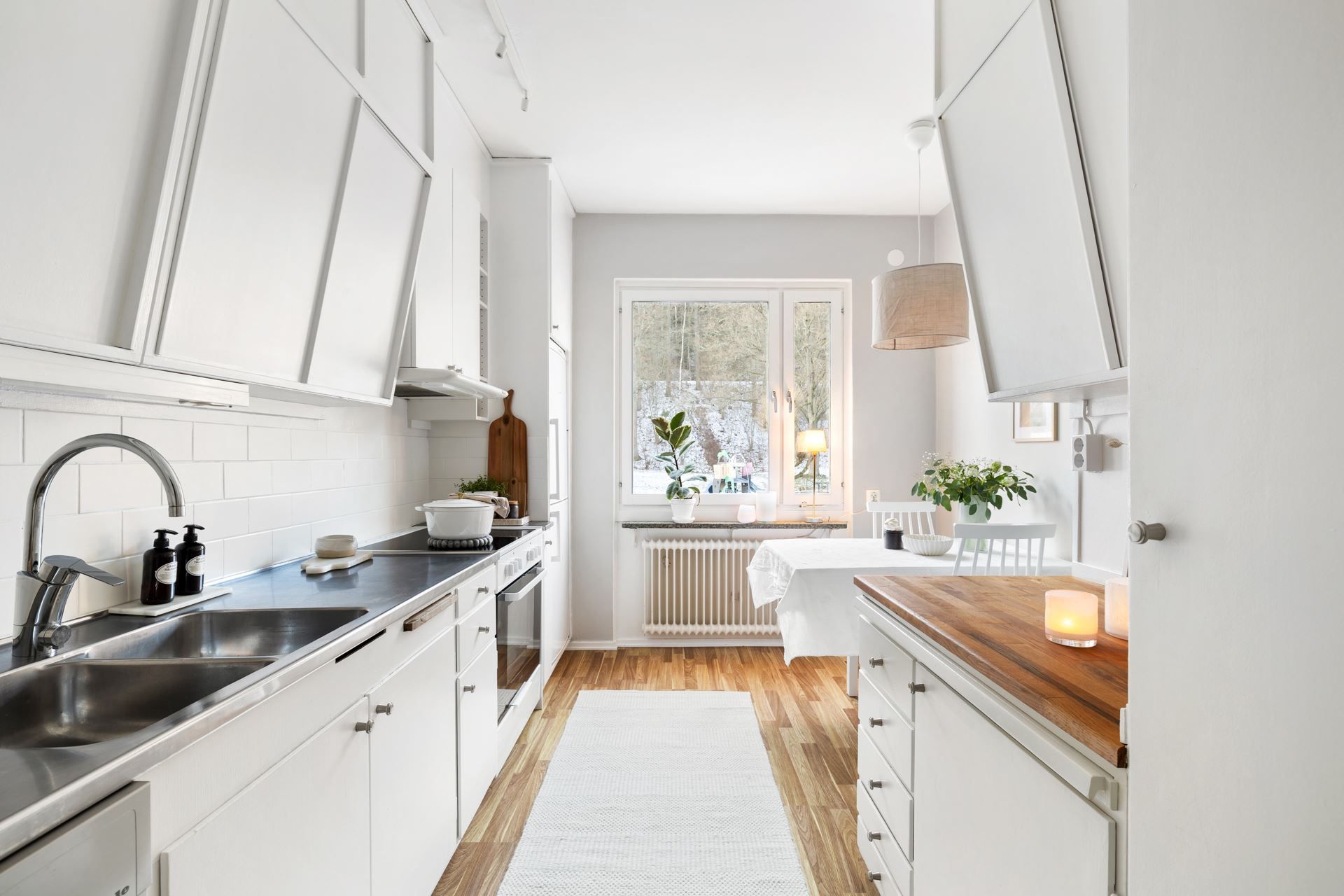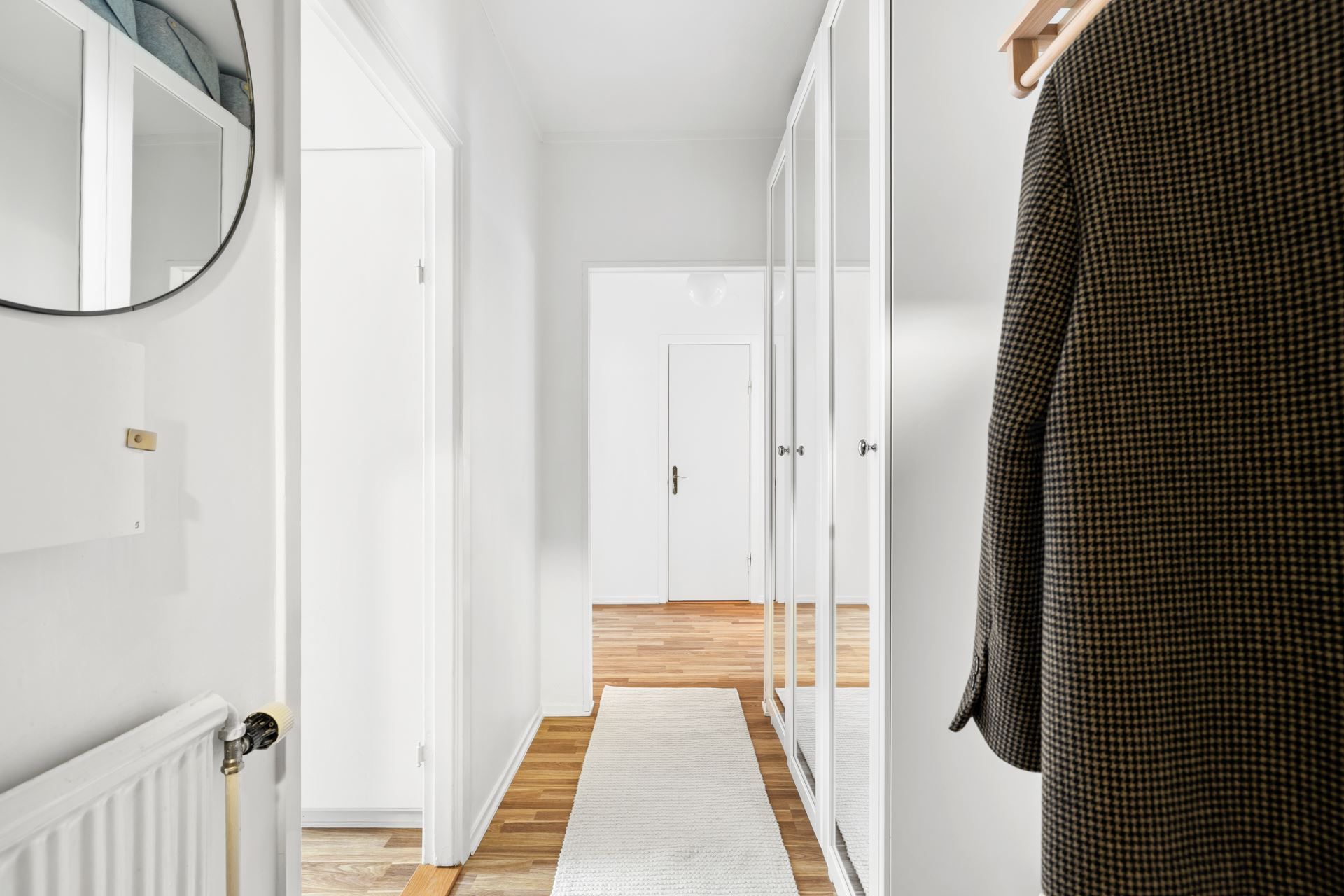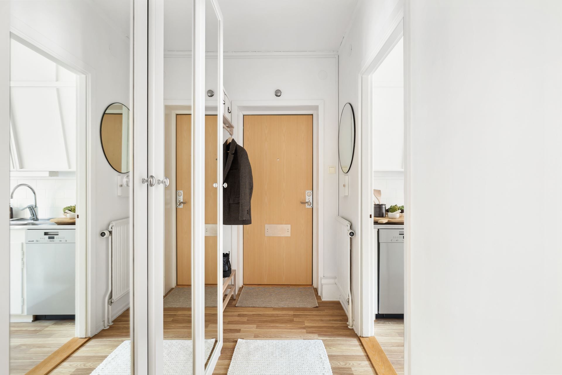 Bostadens 55,5 kvm är smart planerade och placerade en halvtrappa upp, vilket ger ett härligt ljusinsläpp samtidigt som du bor med minimal insyn. Redan i hallen möts du av gott om avhängningsmöjligheter och en välkomnande känsla. Intill ligger det mysiga köket där bevarad charm kombineras med bra arbetsytor och en matplats för fyra.