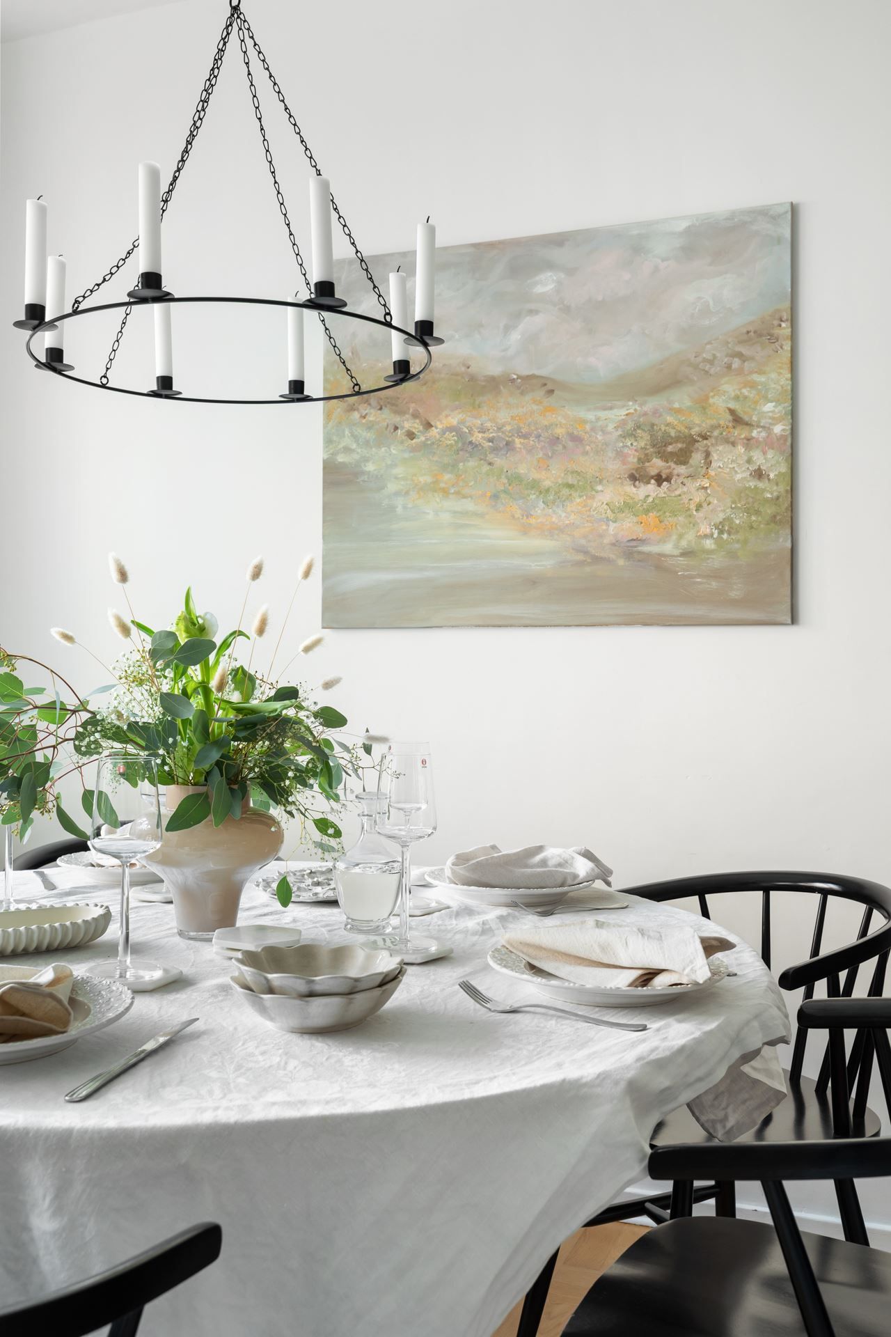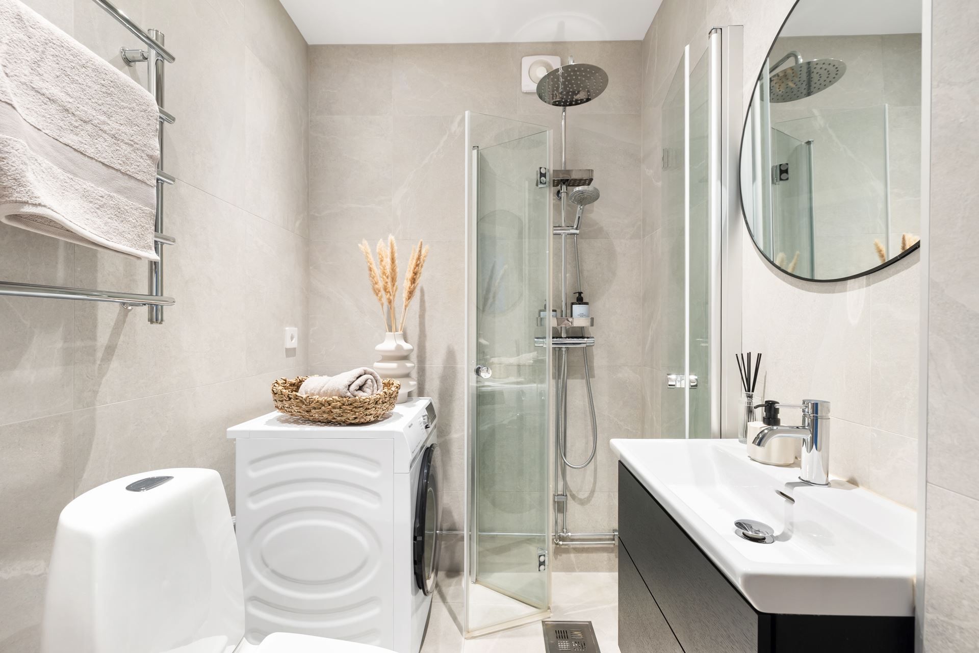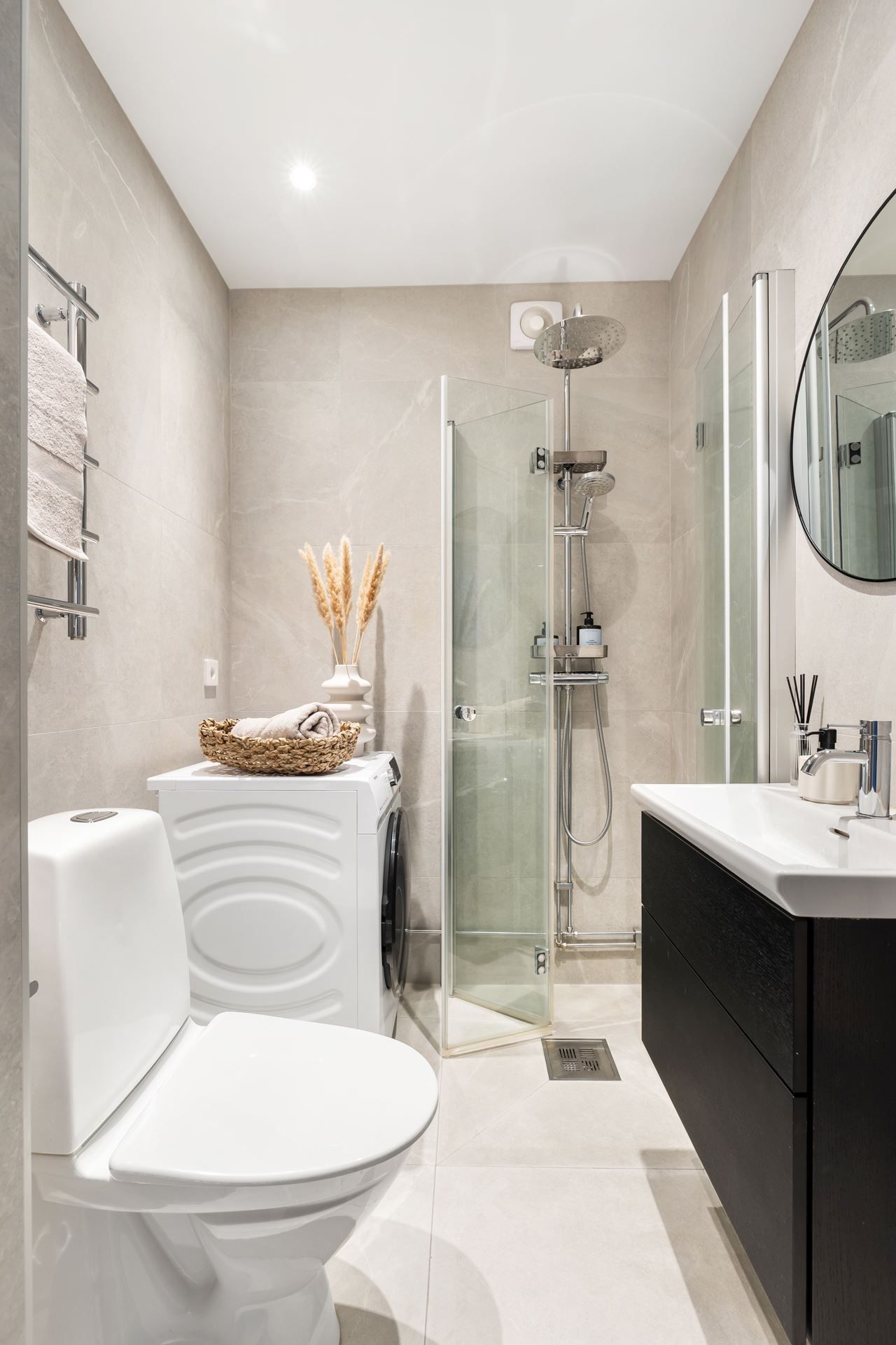 Från hallen når du även det stilfullt helkaklade badrummet som totalrenoverades 2022 — dessutom utrustat med tvättmaskin som förenklar vardagen. Här bjuds också skön golvvärme och handdukstork - lyx!