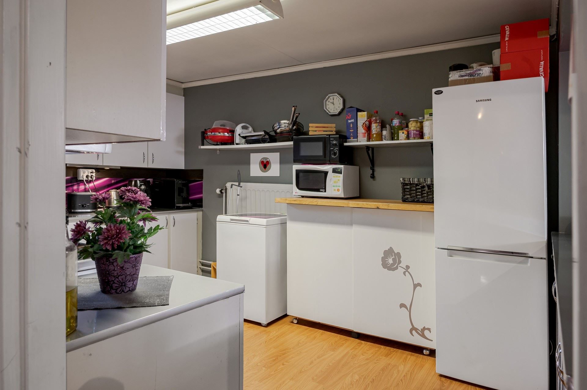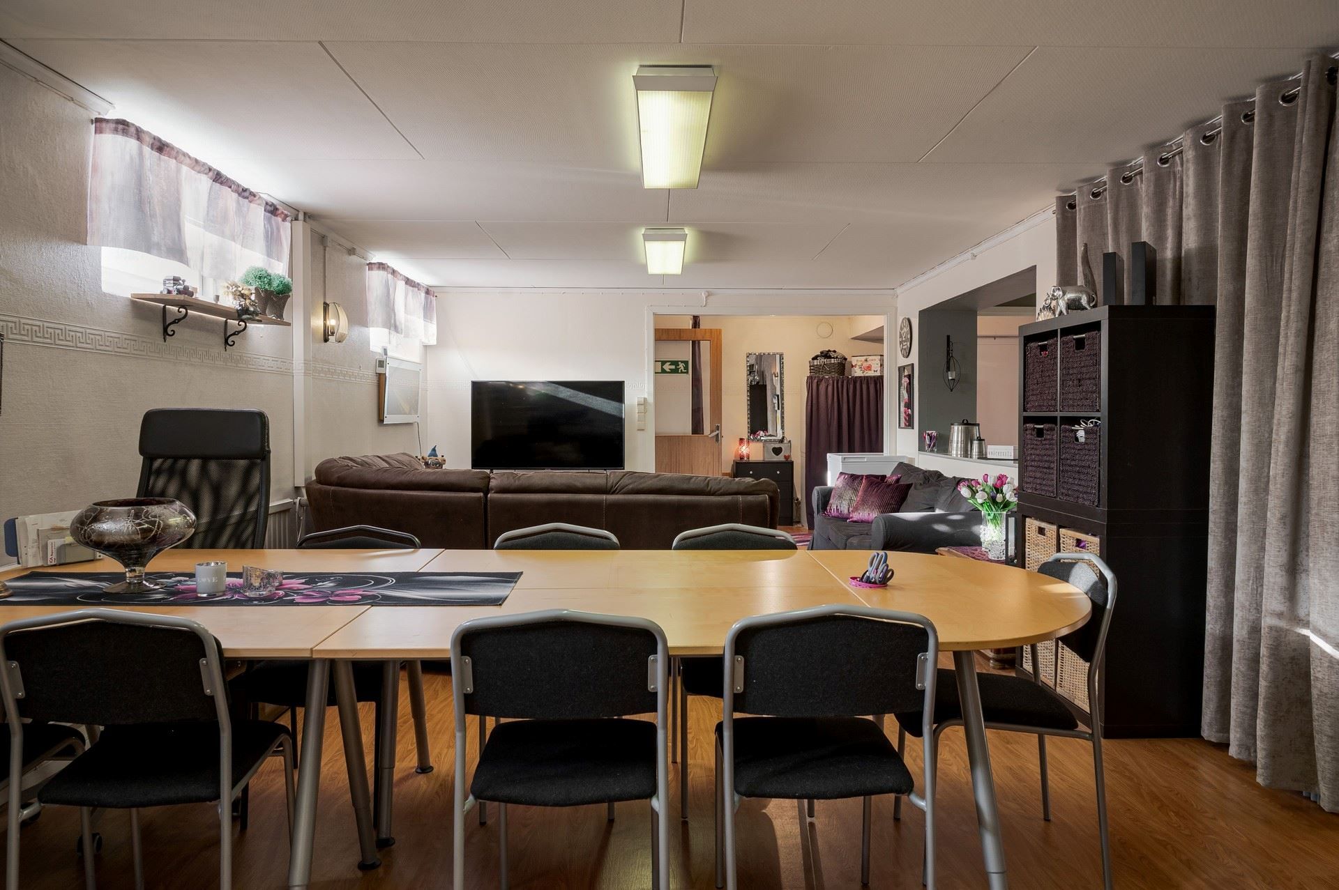 I källarplanet finns en välutrustad personaldel med stort allrum för pauser och samvaro.