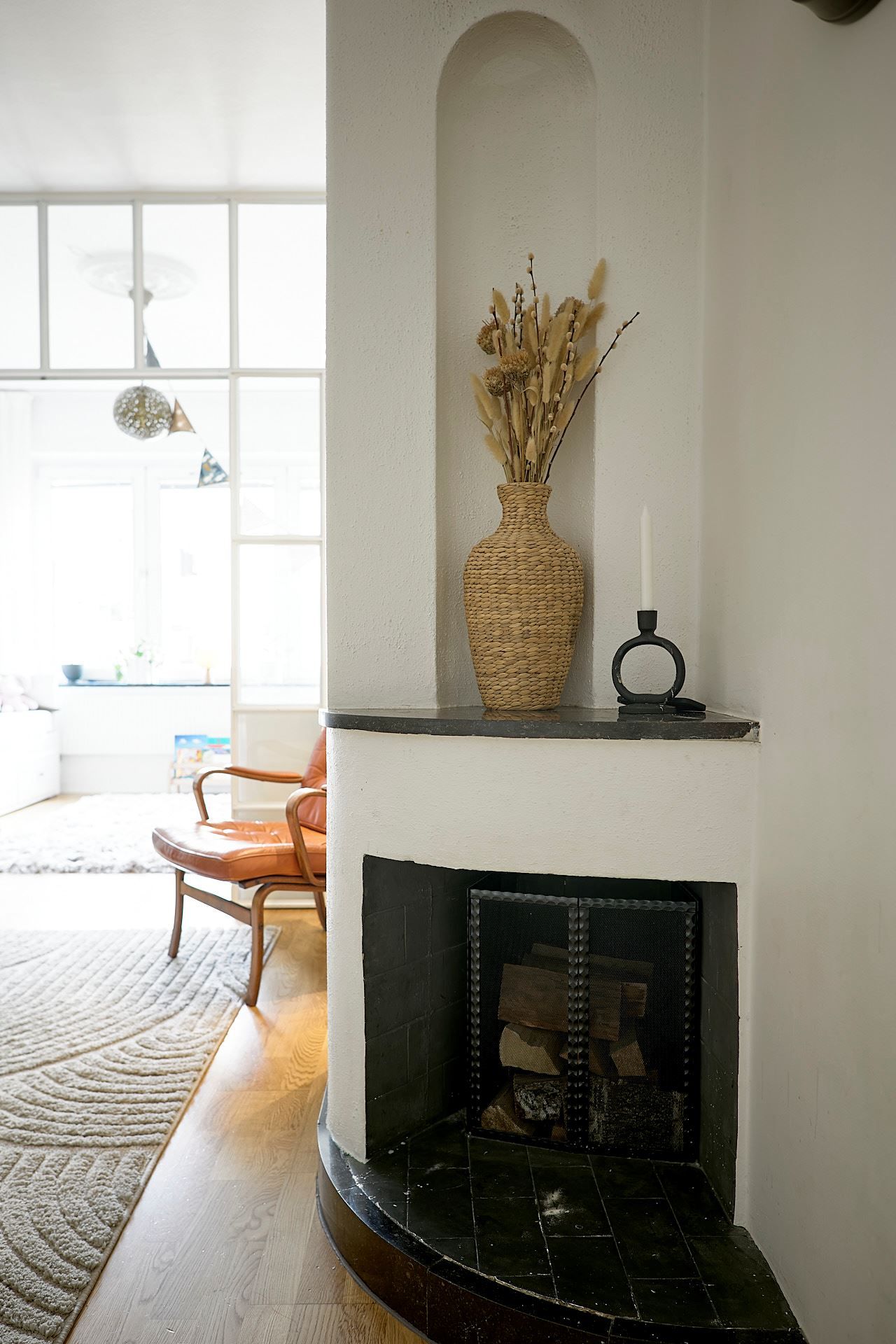 Vardagsrummet är väl tilltaget och har delats av för att skapa de tredje rummet. En härlig öppen spis och ordentlig takhöjd gör detta rummet luftigt och charmigt.
