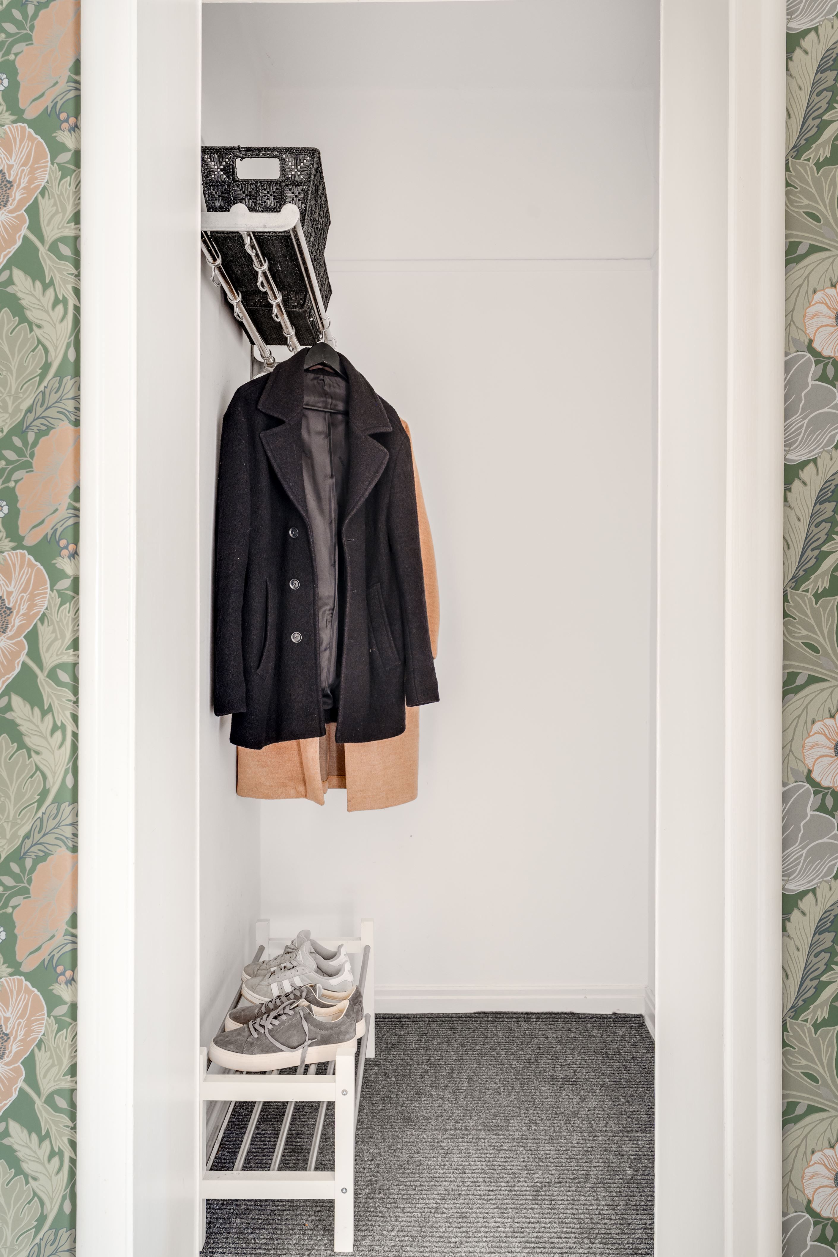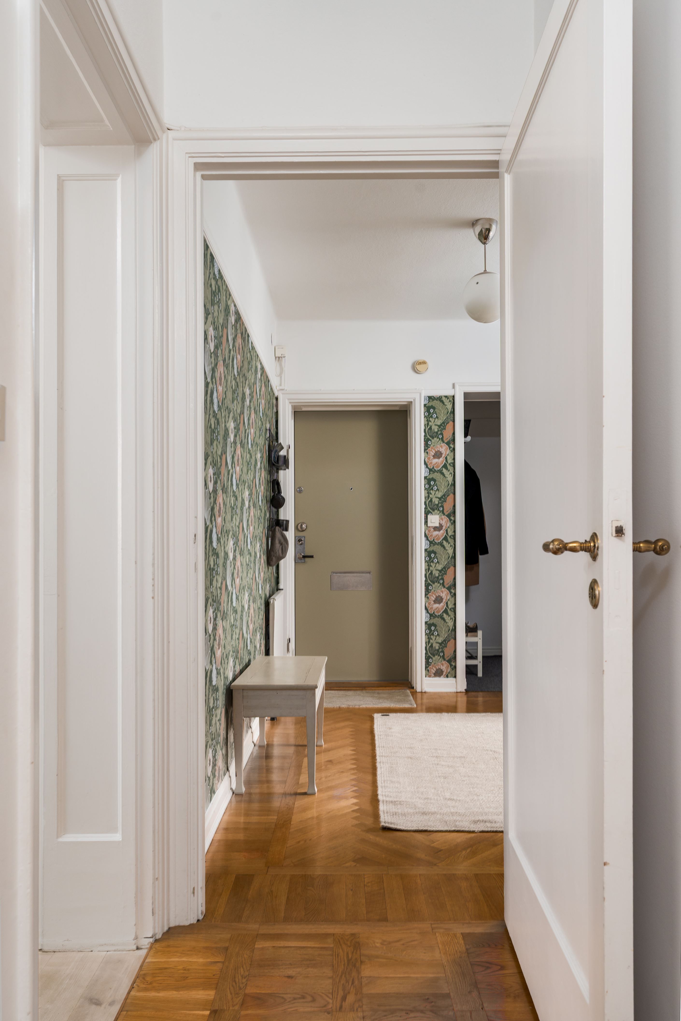 Redan i hallen möts du av ett härligt första intryck med vacker blommig tapet, spegeldörrar och gott om plats för avhängning. Vidare in öppnar sig det ljusa vardagsrummet med stora fönster, fin parkett och en inbjudande atmosfär. Härifrån nås även matsalen, ett perfekt rum för sociala middagar och umgänge.