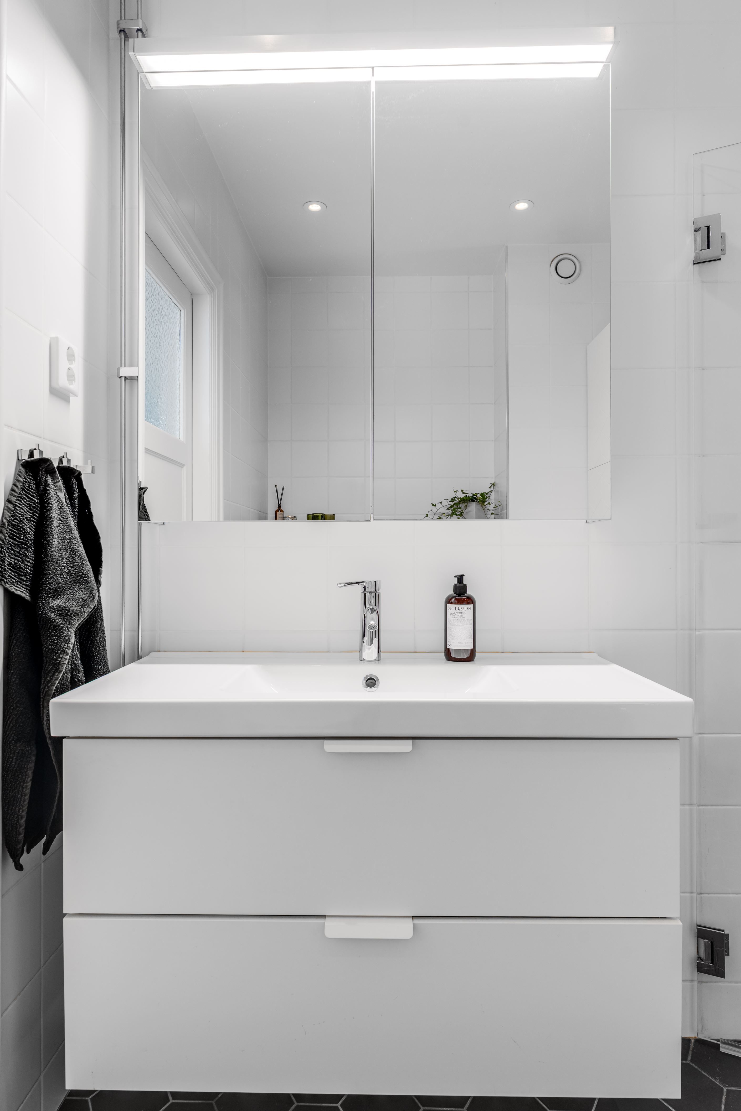 Badrummet är snyggt och fräscht renoverat i modern stil. Utrustat med dusch med glasväggar och smart tvättdel med både maskin och förvaring.