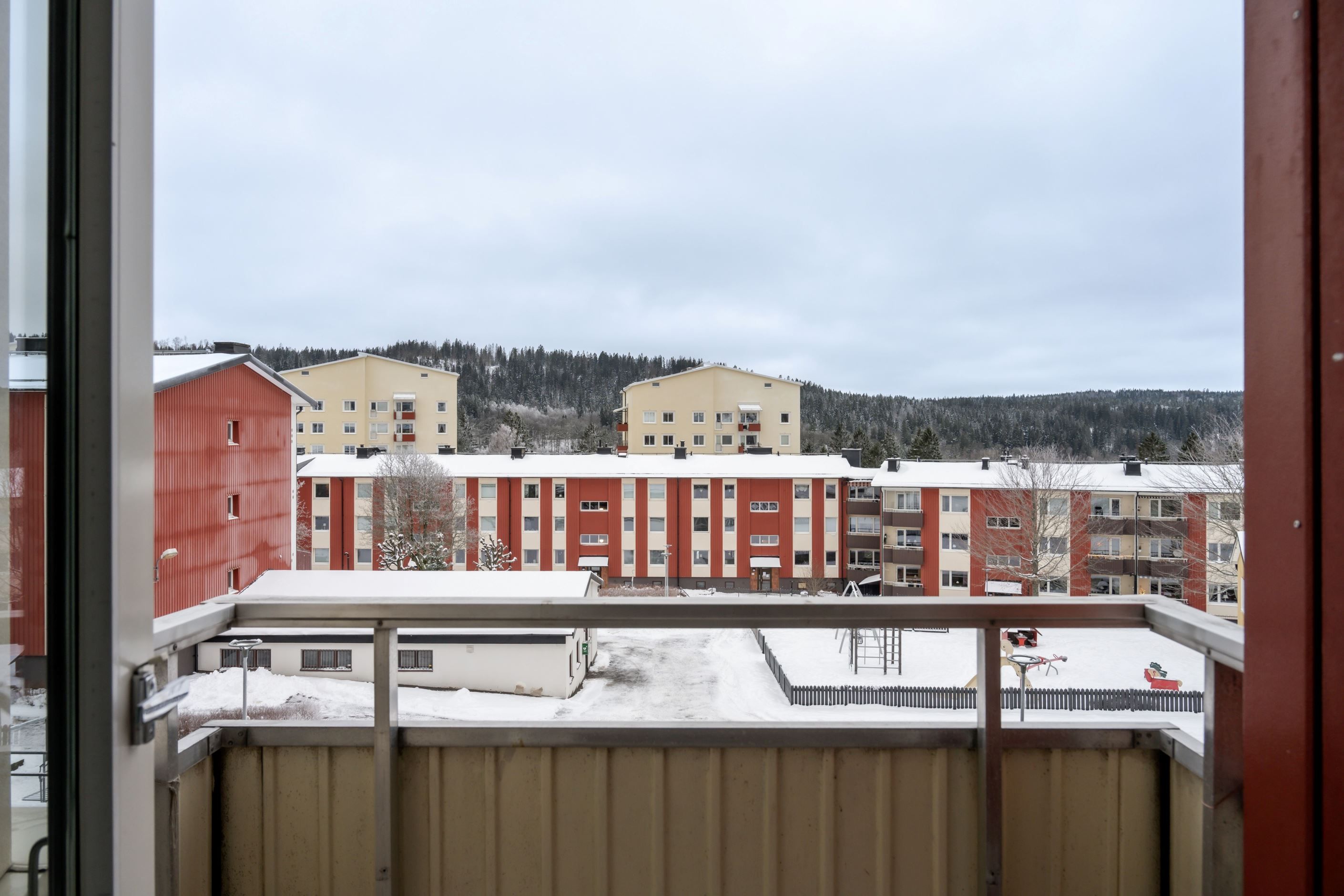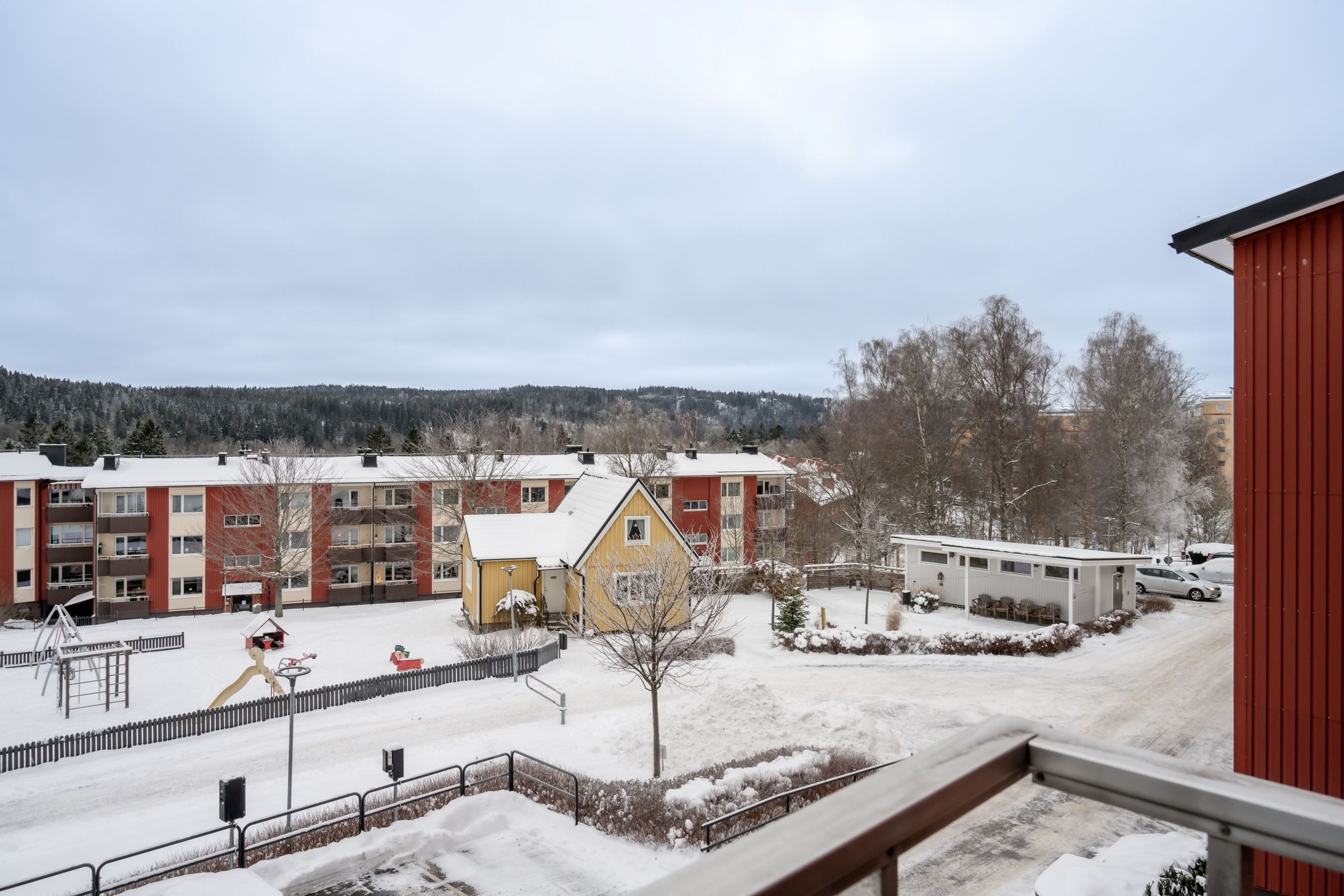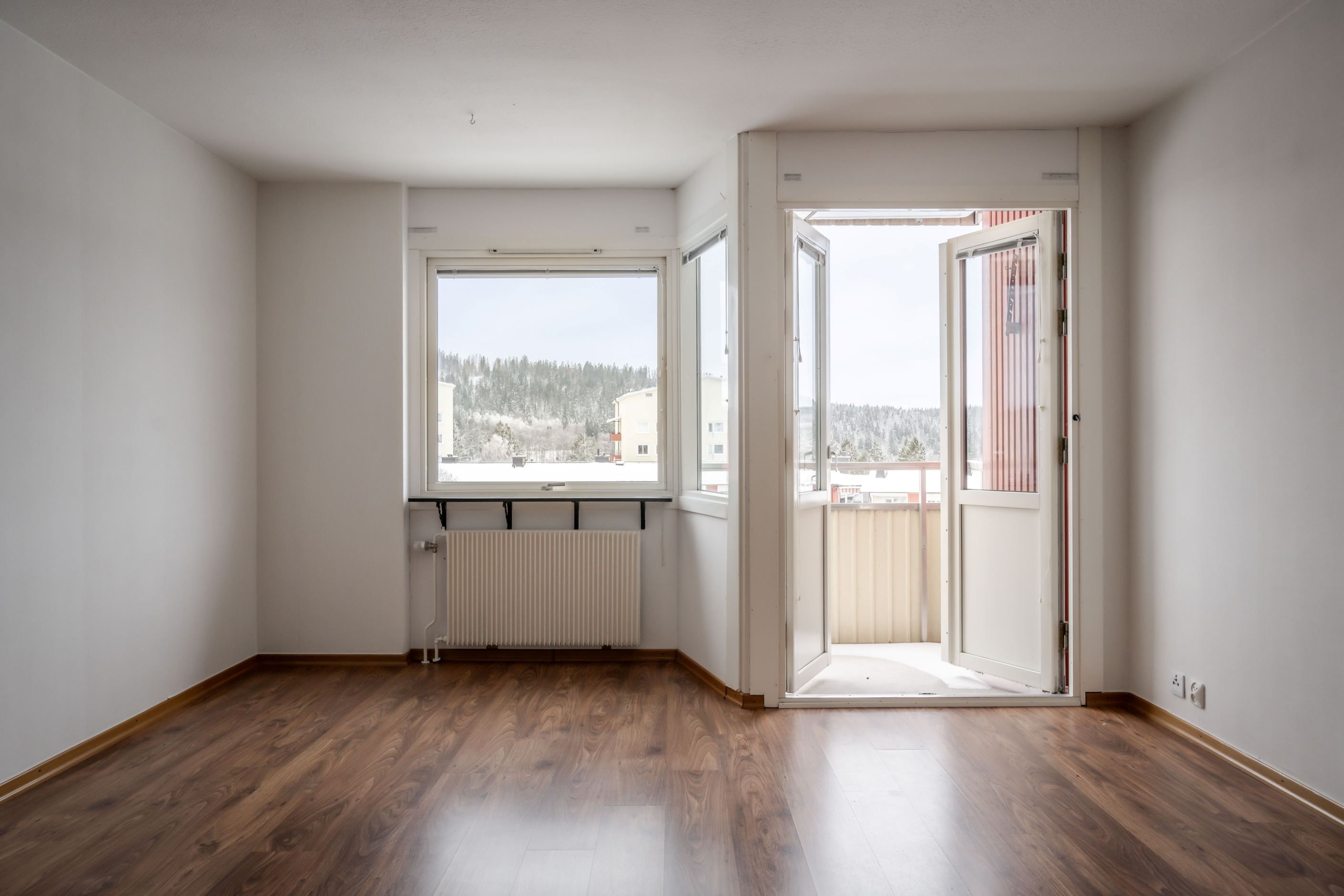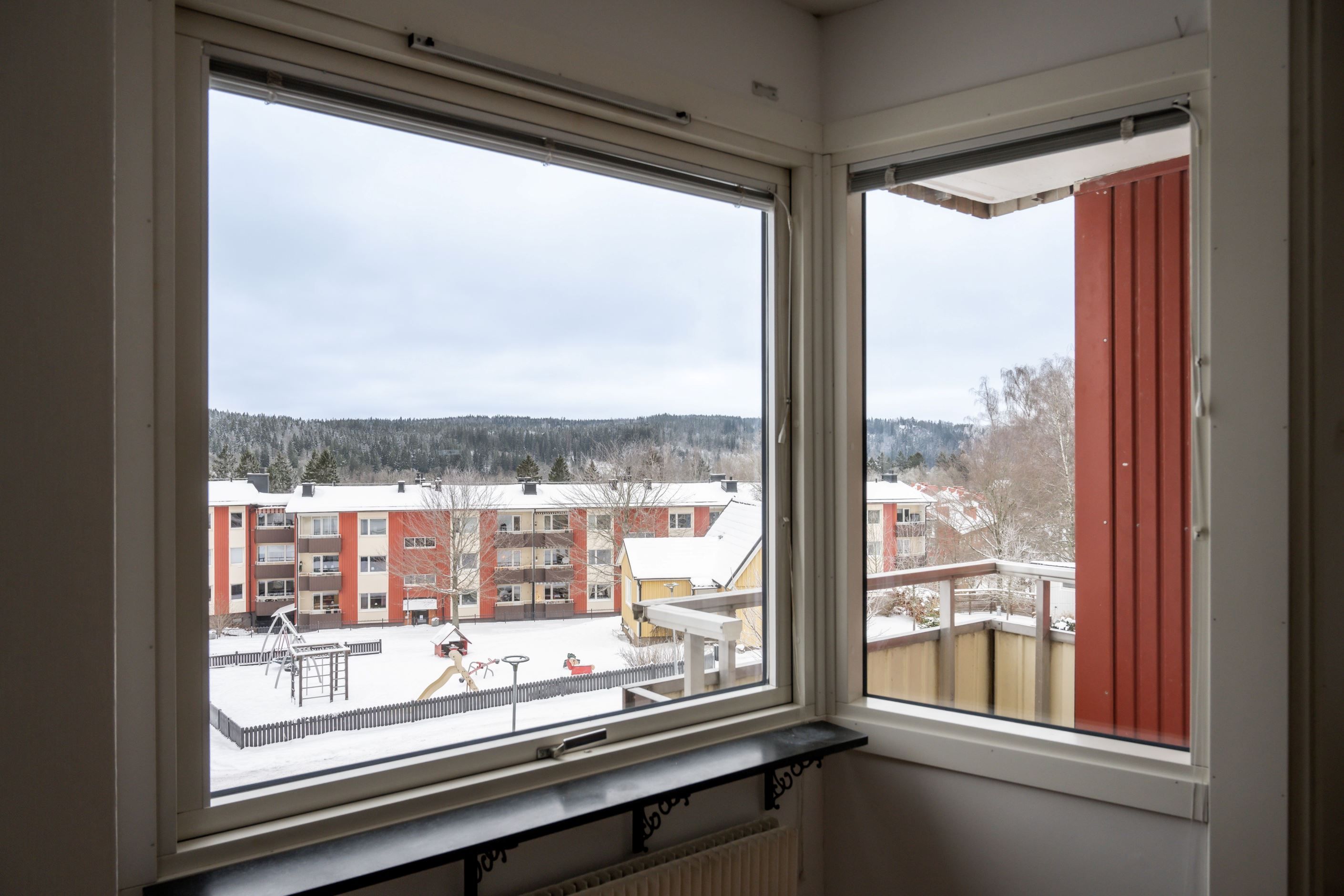 Vardagsrummet erbjuder generösa ytor för möblering och har utgång till balkong med härlig utsikt mot Rya åsar – ett uppskattat inslag som förlänger boendet under årets varmare månader. Sovrummet är lättmöblerat och kompletteras av bra förvaringslösningar i form av en stor skjutdörrsgarderob.