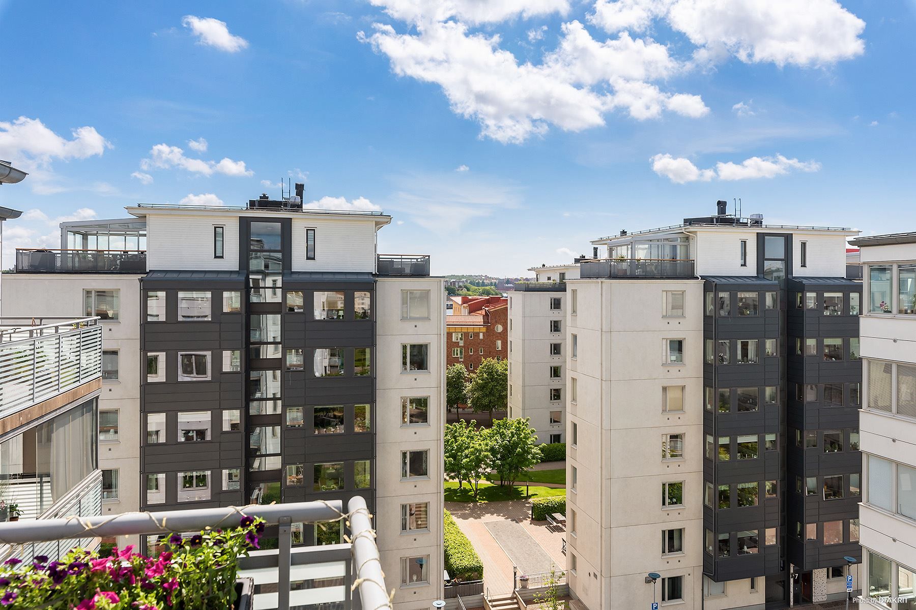 Som översta balkong, näst högst upp i huset kan vi snart erbjuda detta boende för nästa ägare. Här har vi ett magiskt ljusinsläpp tack vare gavelläget med fönster åt alla fyra vädersteck. Från balkongen kan du njuta av solen från lunch till sen kväll. Här skymtas även älvens båttrafik ner mellan husen.