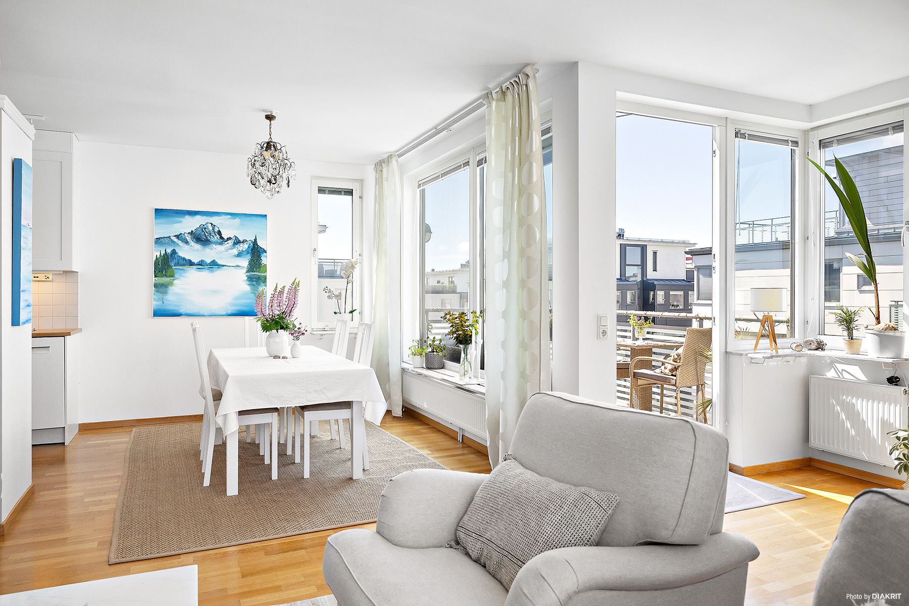 Bostaden erbjuder en härligt öppen planlösning mellan kök och vardagsrum vilket har fint ljusinsläpp från stora fönsterpartier åt tre håll.
