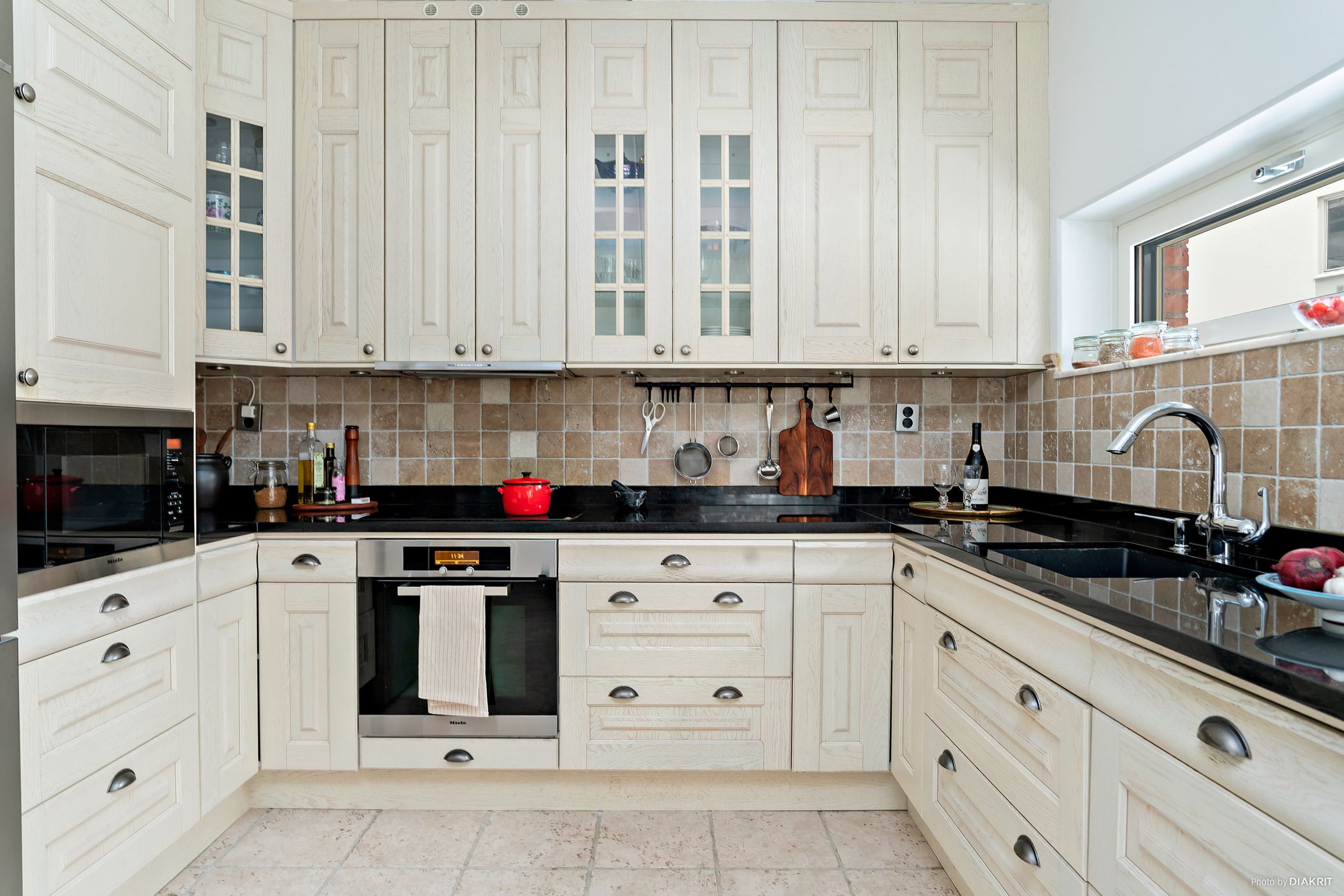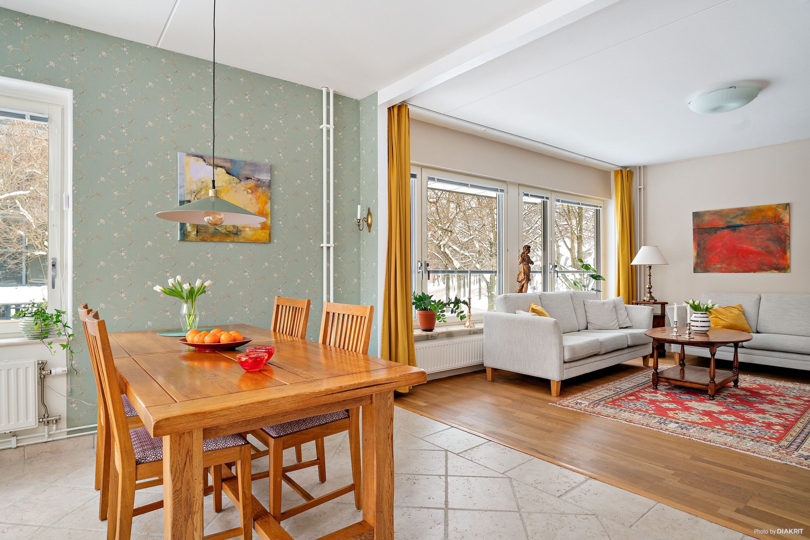 Bostaden erbjuder halvöppet kök från Ballingslöv med vacker bänkskiva i granit och här ryms stor matplats vid fönsterpartierna. Här går att duka för långbord in i vardagsrumsdelen där soffgruppen har sin tydliga plats. Här bor man mitt i trädkronorna vilket ger en tavla i sig. Sovrummen ligger i varsin ända och det stora rymmer dubbelsäng, arbetsplats och bra förvaringsmöjligheter. Det andra lämpar sig väl som barnrum, gästrum eller kontor. En av bostadens stora fördelar är att här finns två toaletter. I hallen finns en gäst-toalett och längre in vid stora sovrummet en toalett med dusch och tvättmöjligheter. Här finns även en rymlig klädkammare.