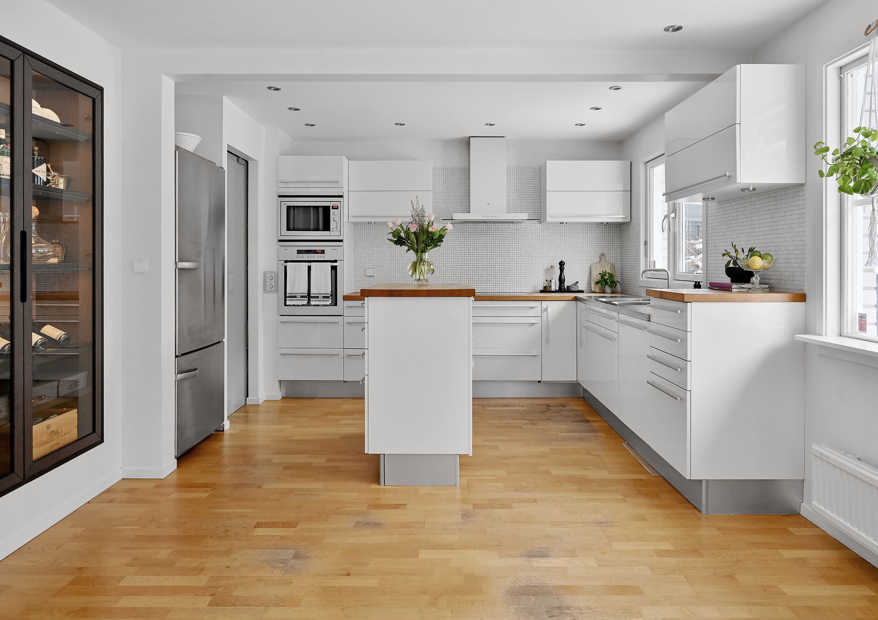 Invändigt möts du av en underbar öppen planlösning där kök och vardagsrum flyter samman i en social och inbjudande atmosfär. Det franska kvalitetskökets stilrena design förstärks av en generös köksö – perfekt för både vardagens snabba frukostar och kvällens mingel med ett glas vin i handen. Här finns även ett praktiskt skafferi med frostad glasdörr och ett elegant inbyggt vitrinskåp som låter dina vackraste glas och vinflaskor komma till sin rätt. Precis intill köket finns gott om plats för en stor matgrupp där middagar med vänner och familj blir minnesvärda. Från matplatsen når du smidigt den stora uteplatsen, vilket suddar ut gränsen mellan inne och ute och skapar en underbar känsla av rymd. På entréplanet finns även ett trivsamt sovrum samt en liten, stilren gästtoalett.