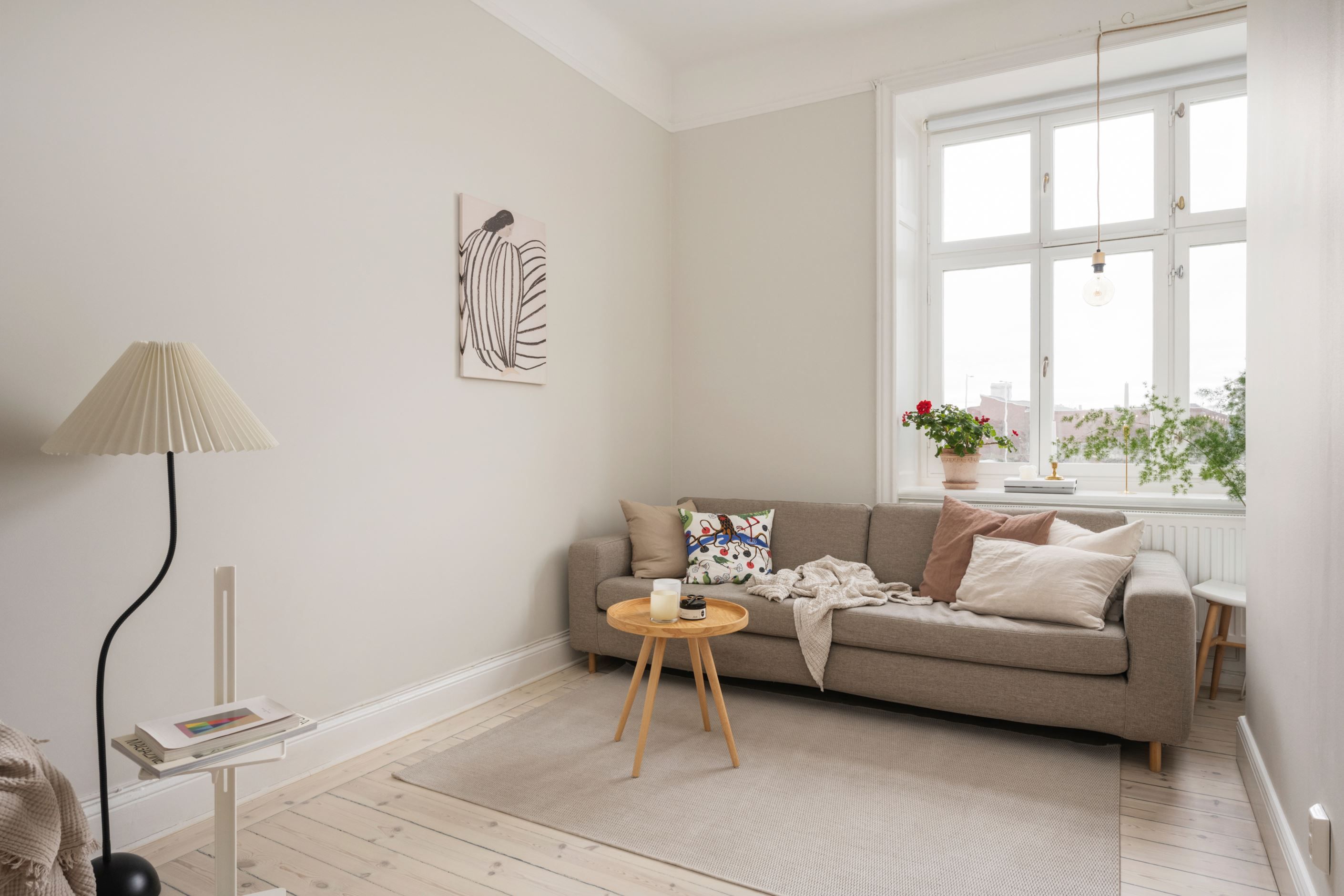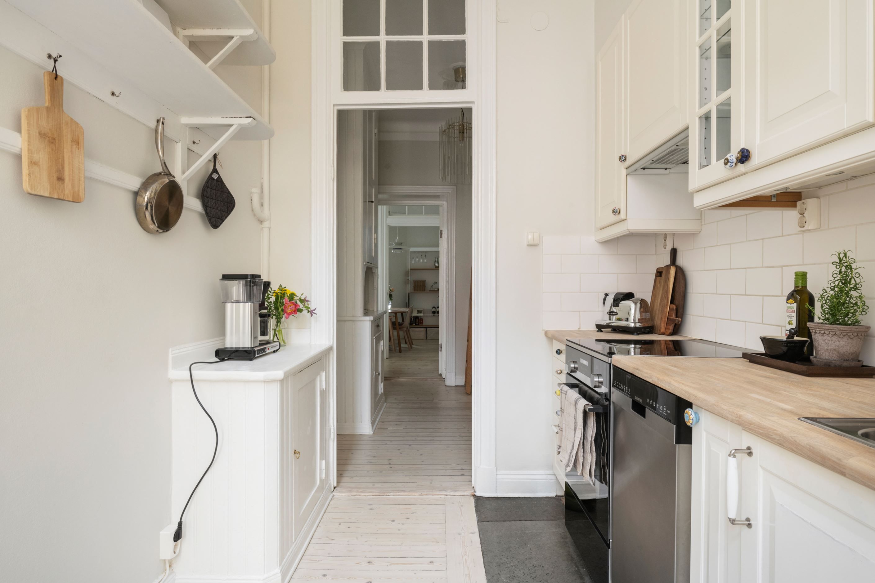 Här möts sekelskiftesatmosfär och modern design i perfekt harmoni. Generös takhöjd, vackra plankgolv och stora fönster ger bostaden ett ljust och luftigt intryck, medan den sobra färgsättningen och de exklusiva materialvalen skapar en stilfull helhet.