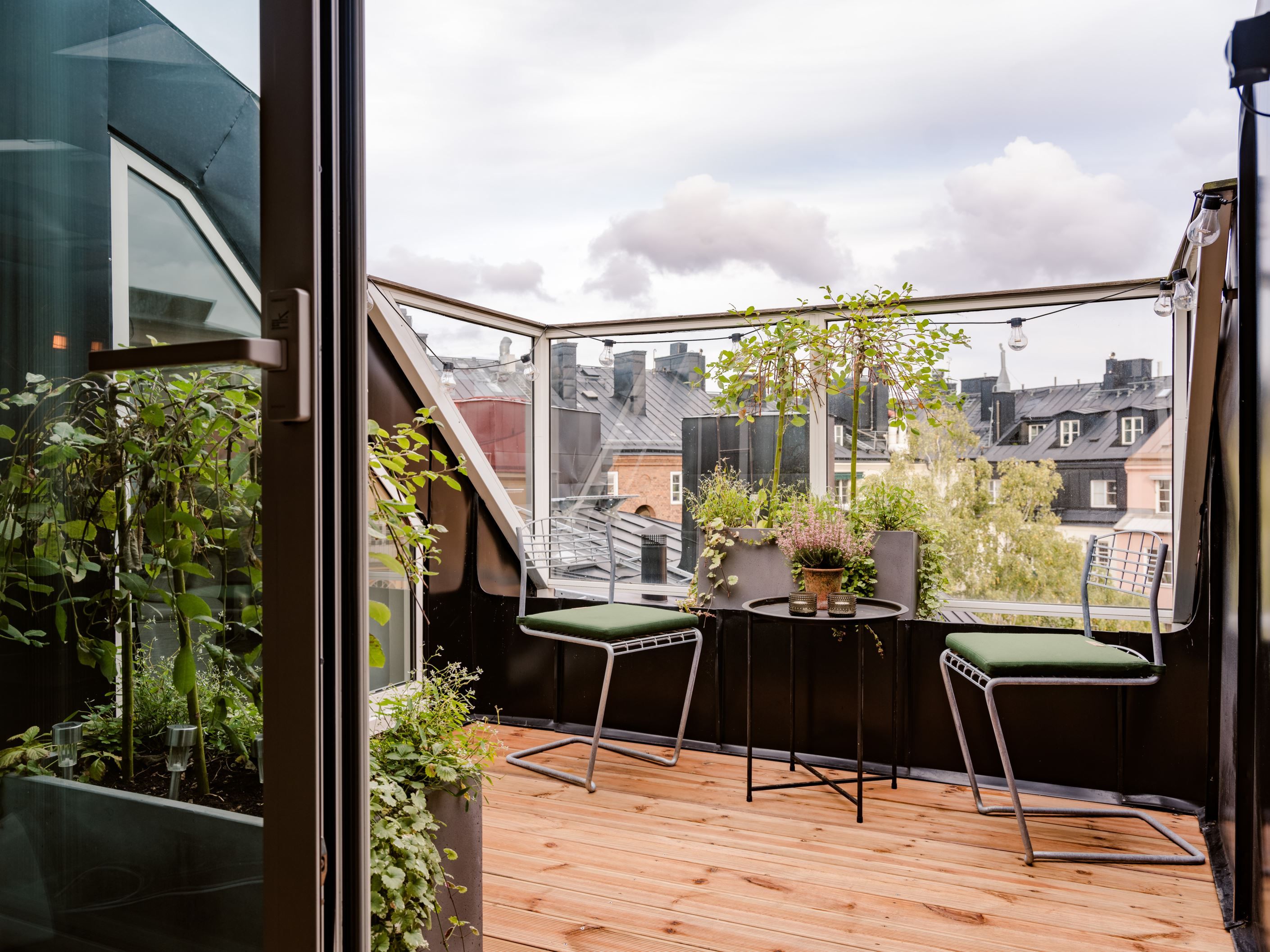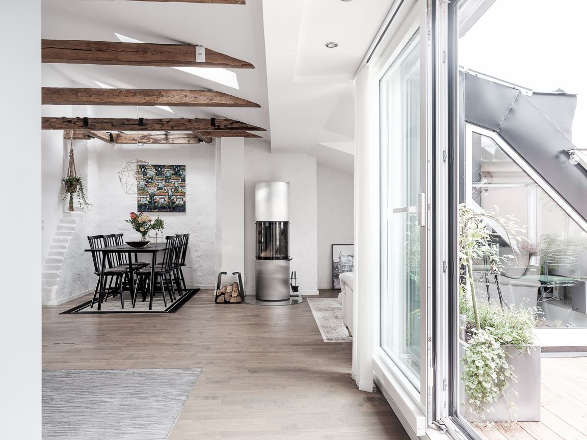 Välkomna till denna enastående och stilrena vindsvåning med en totalyta om 77 kvm och terrass med fri utsikt över takåsar med omnejd!