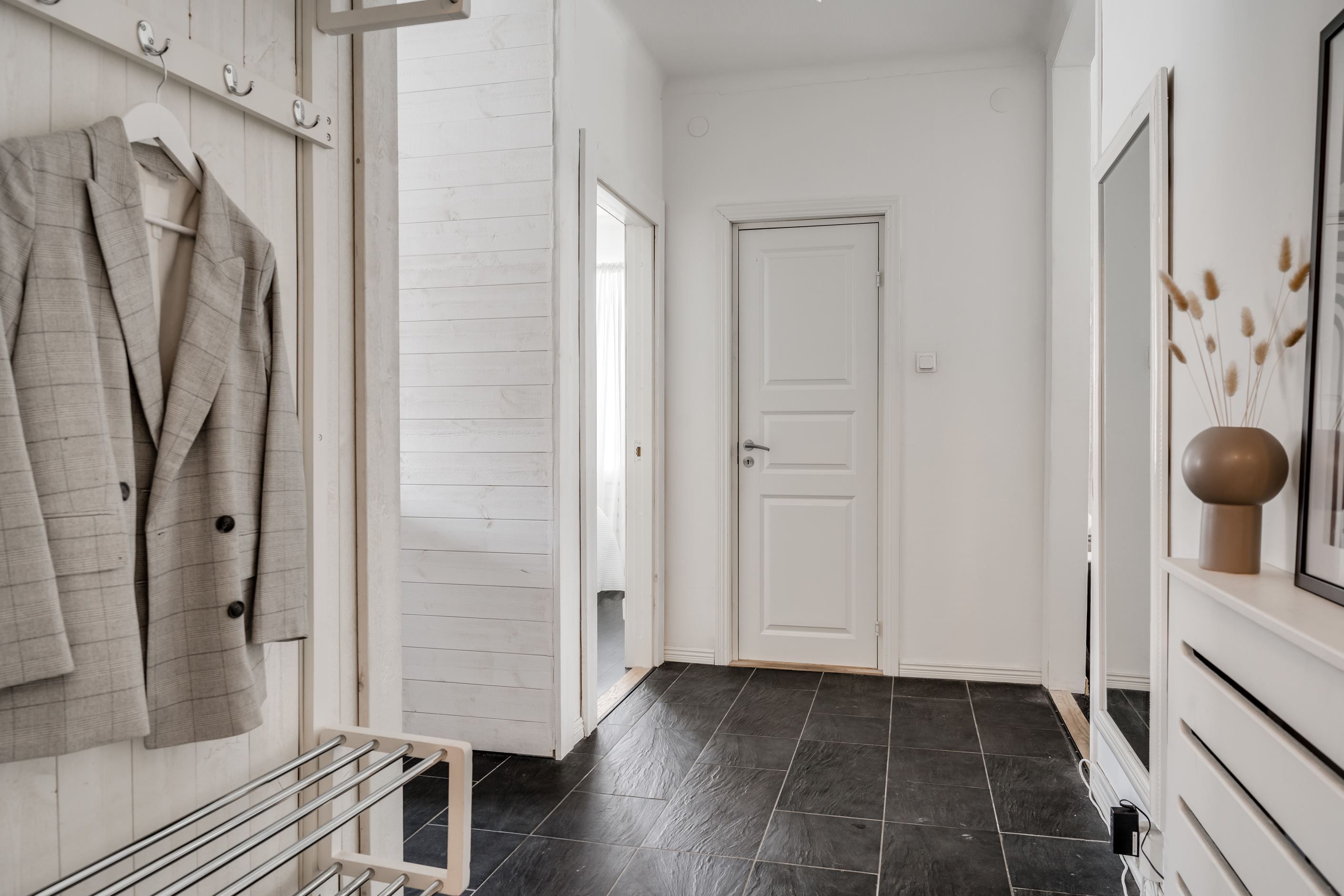 Här finner du också bra förvaringsmöjligheter i form av separat garderob och mindre klädkammare.