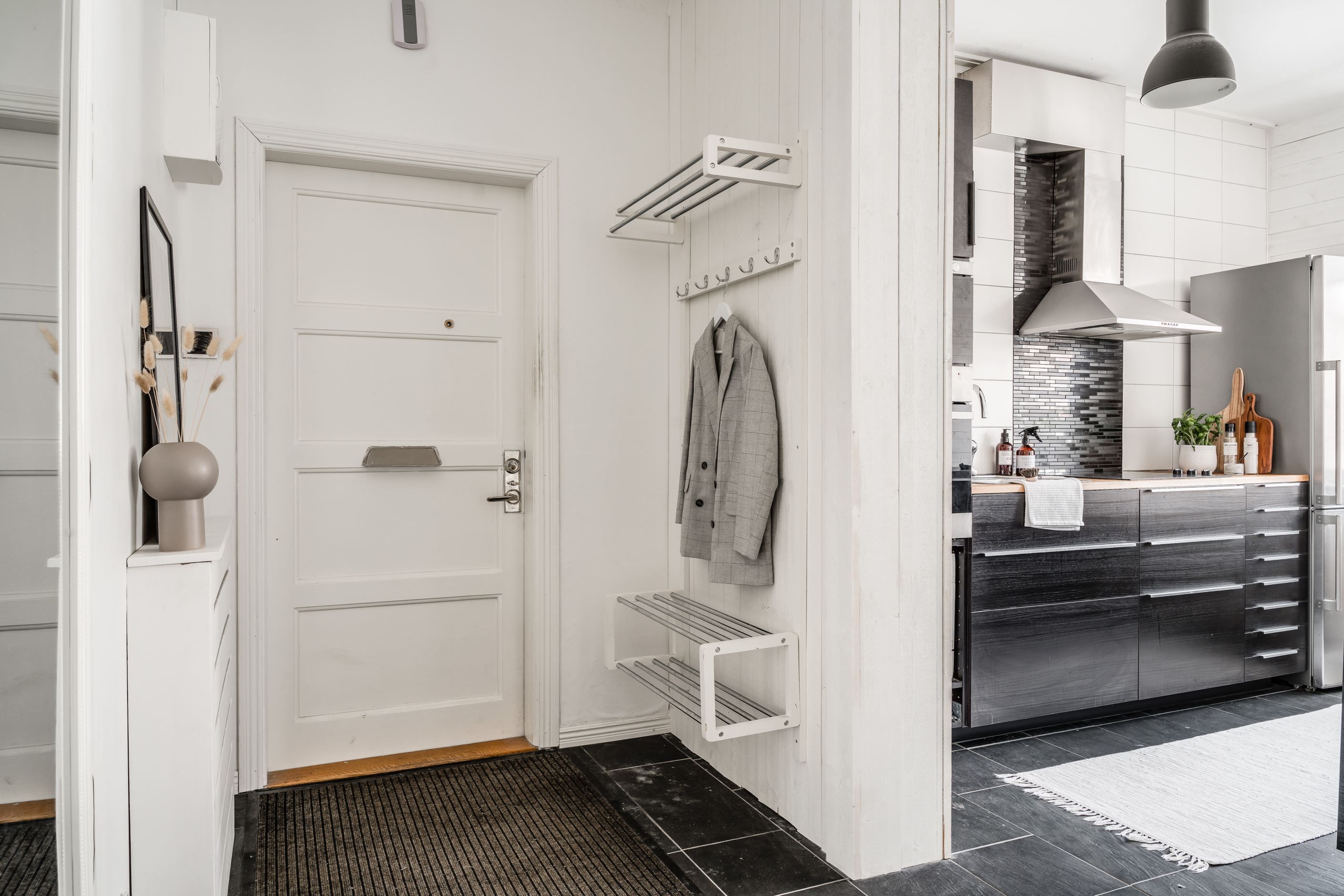 Kliv in och lägg märke till den generösa takhöjden, ljuset och det trendiga, mörka klinkergolvet som möter dig i hallen när du kliver in i denna bostad.