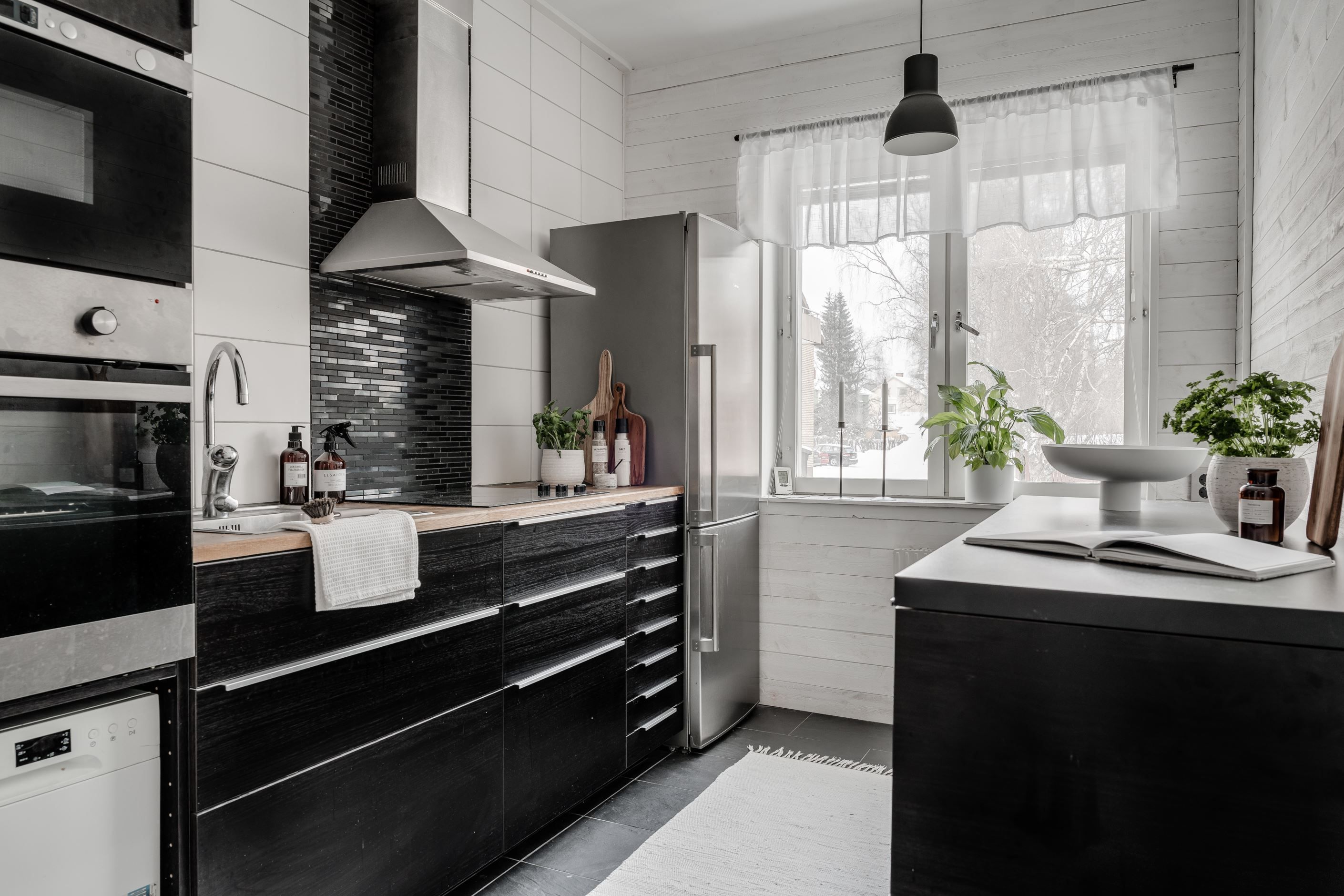Golvet rör sig vidare från hallen in i det renoverade köket med svarta skåpsluckor och beslag i rostfritt stål. Då även maskinparken och fläktkåpan är i samma material skapar det tillsammans en känsla av enlighet.