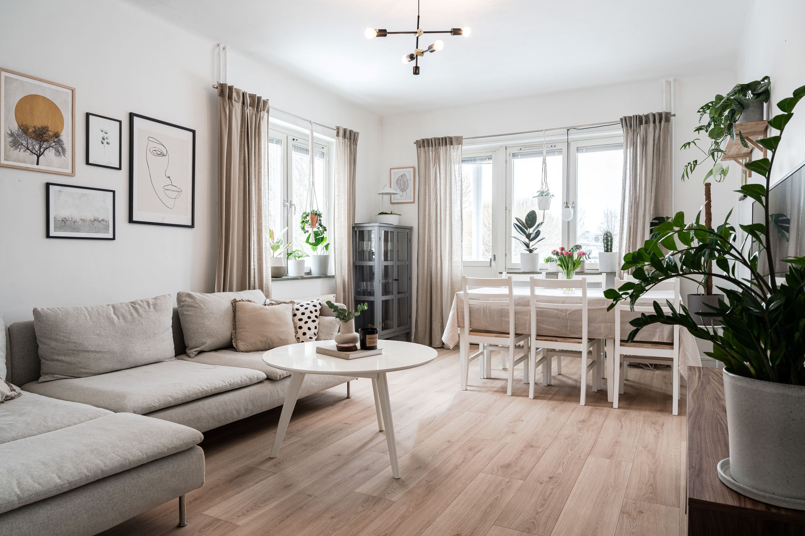 In i vardagsrummet följer samma röda tråd som i övriga lägenheten. Här har det nyligt lagts in ett nytt ljust laminatgolv och väggarna har fått ny färg. Vardagsrummet har också fått nya snygga lister vilket förstärker den där känslan av nytt och fräscht. Det väl tilltagna utrymmet ger dig även möjlighet till en matsalsmöbel invid fönsterparti samtidigt som en soffgrupp med tillhörande soffbord och tv-möbel får plats. Från vardagsrummet når du också bostadens härliga balkong i direkt söderläge! Här kan du med enkelhet tillbringa många timmar i solen avnjutandes en god måltid eller med kompishäng i en skön lounge-grupp.