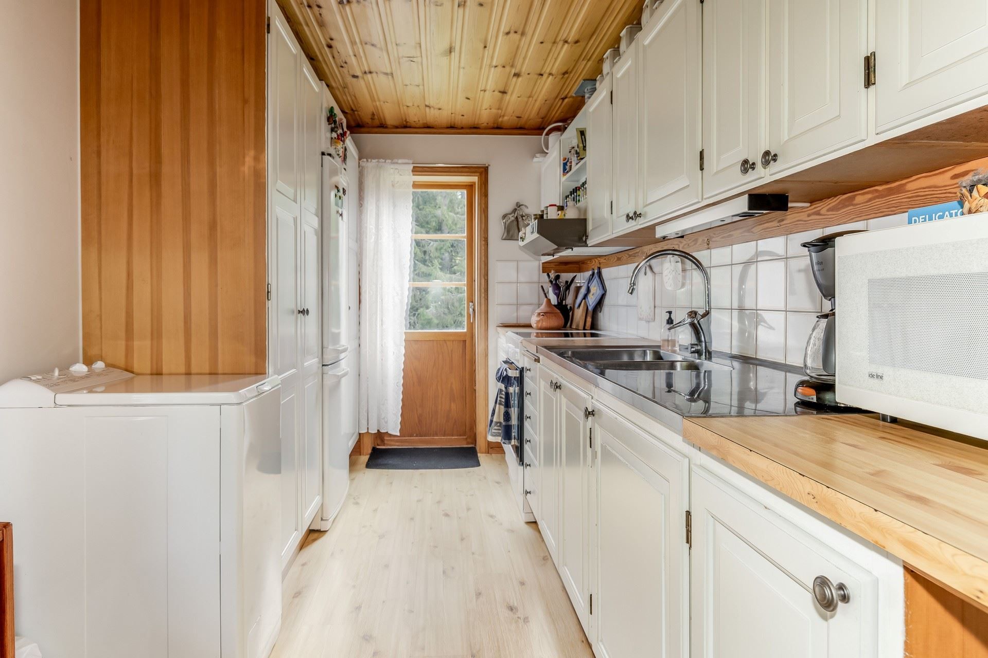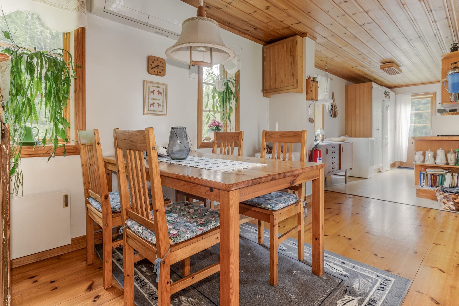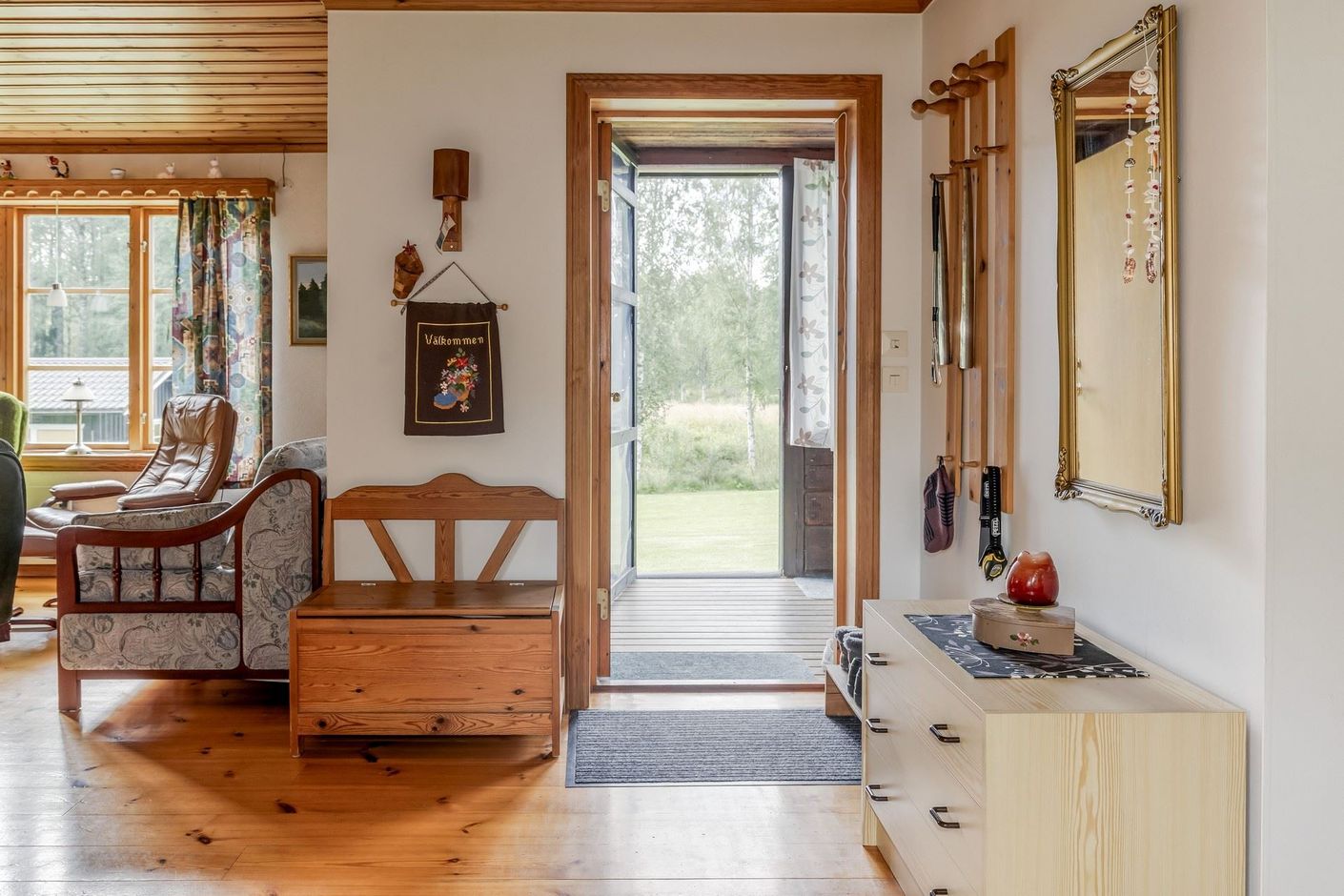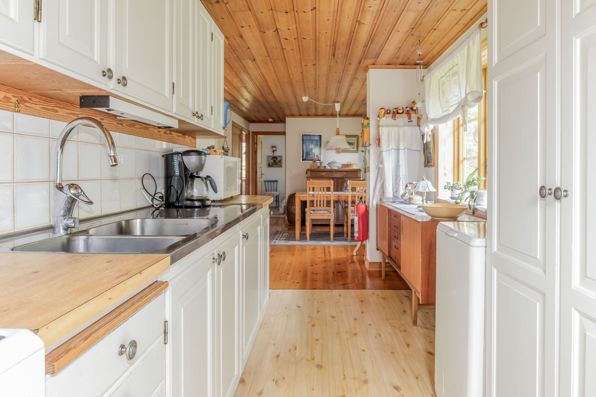 Huset en ombonad känsla med trädetaljer och en tidlös stil som passar väl för både fritidsboende och längre vistelser.