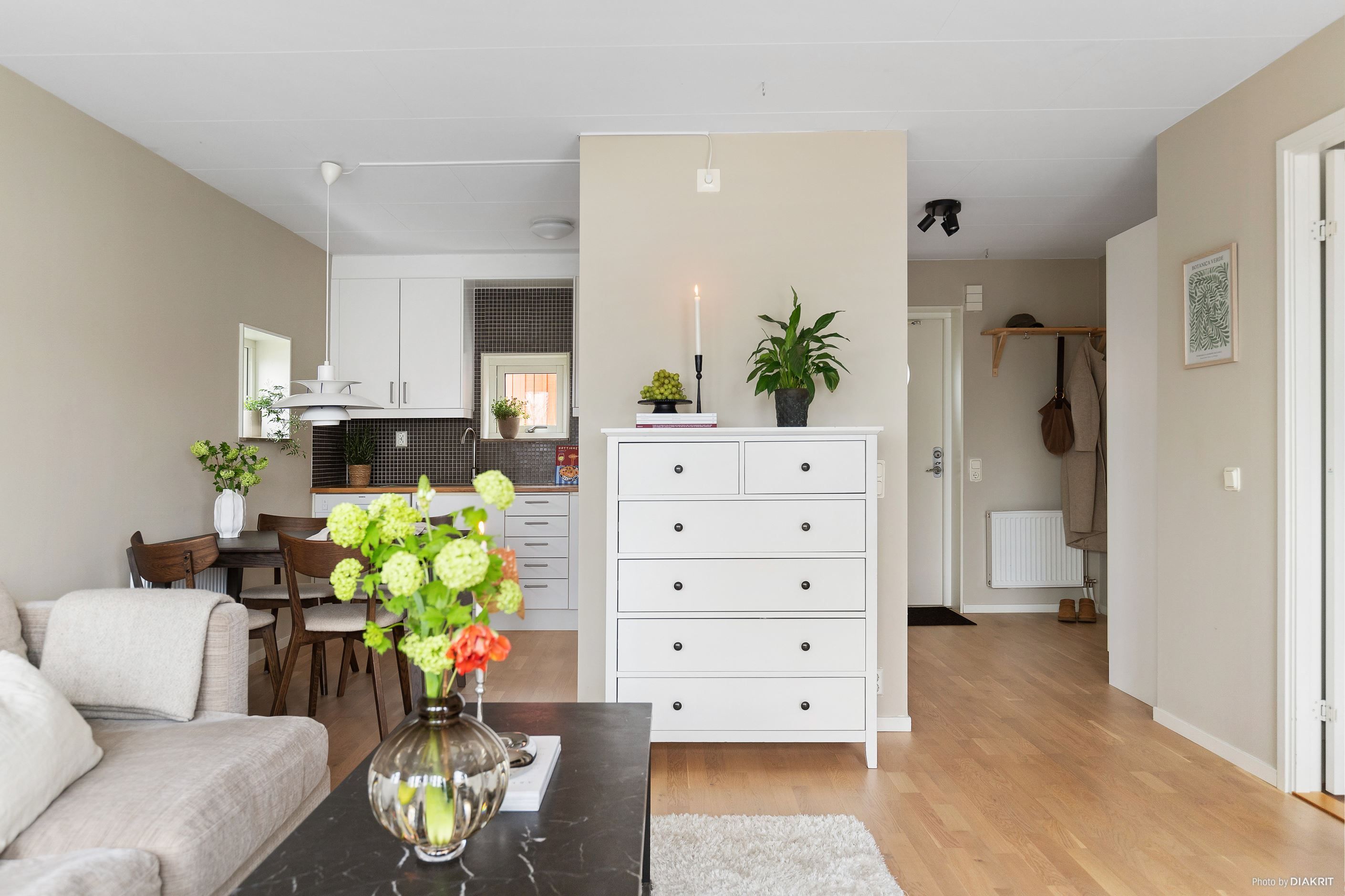 Bostaden erbjuder en öppen och social planlösning mellan kök och vardagsrum där ljusinsläppet från stora fönsterpartier skapar en luftig och inbjudande känsla. Köket är stilrent med goda arbetsytor och plats för matbord intill fönster. Vardagsrummet rymmer både soffgrupp och övrigt möblemang och härifrån nås även bostadens balkong.