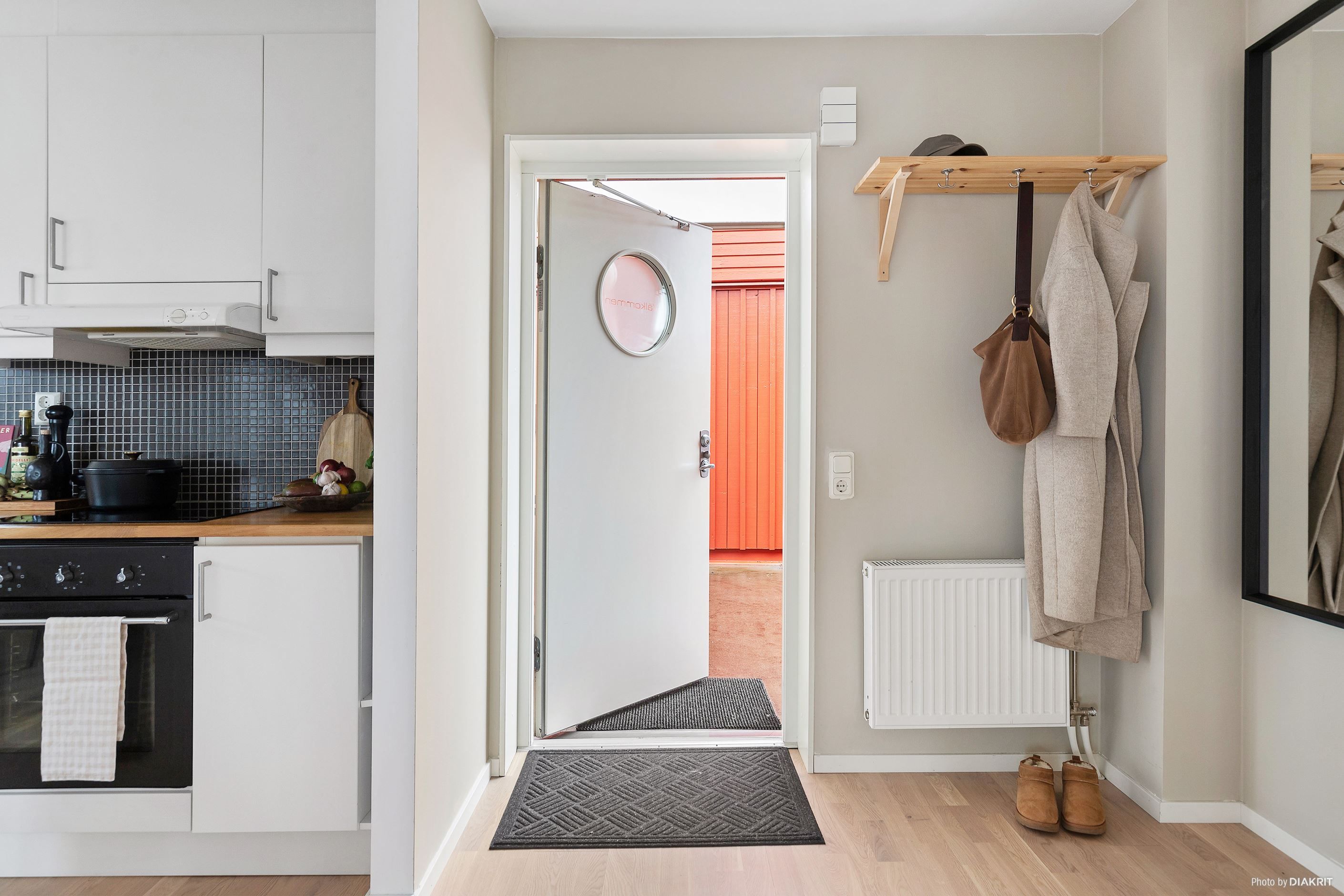 Sovrummet är rogivande med plats för dubbelsäng och förvaring, och badrummet är fräscht utrustat med dusch samt egen tvättmaskin och torktumlare för extra bekvämlighet. I hallen finns bra förvaringsmöjligheter som underlättar vardagen.