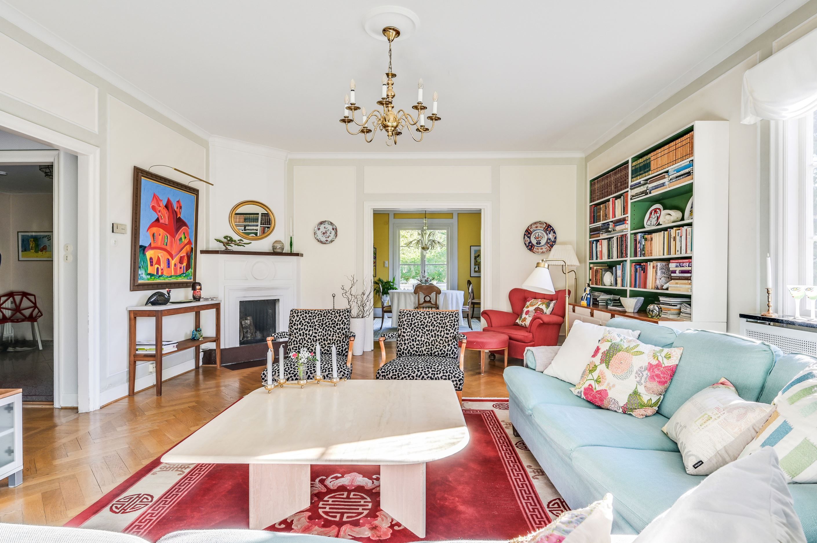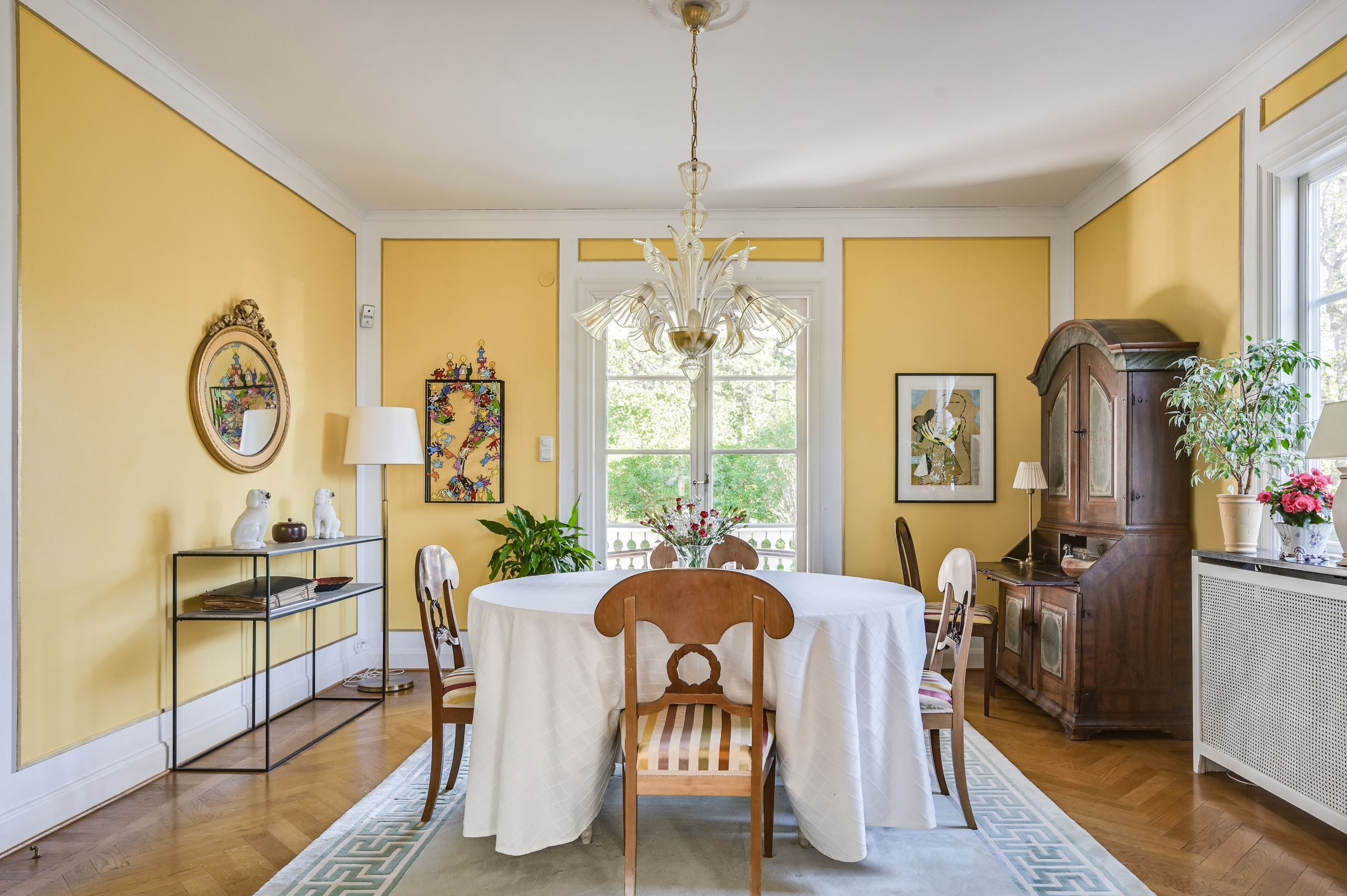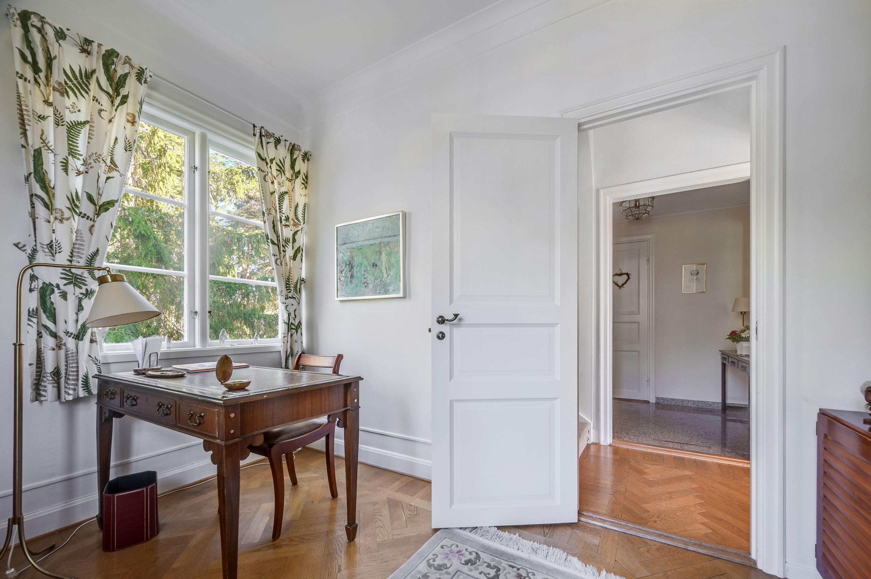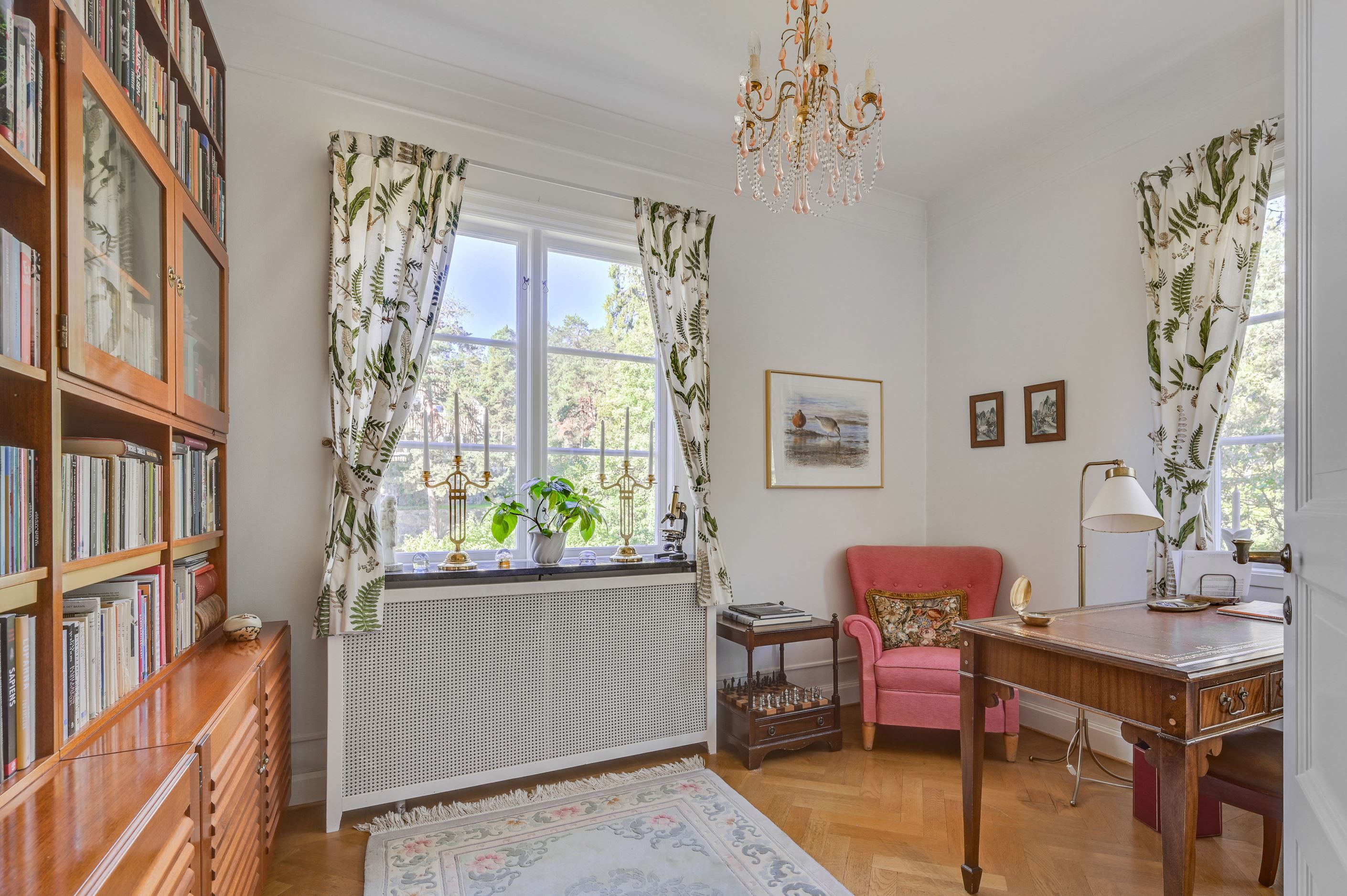 Vackra och väl tilltagna SÄLLSKAPSYTOR, matsal och vardagsrum i fil med underbart ljusflöde och härlig rymd. Vilsam vy mot vackert grönskande tomt. Trivsamt planerat med VARDAGSRUM som ger plats för soffgruppen och dylikt. Här njuter man även av den öppna spisen. MATSAL bakom skjutdörrar i original. Här ryms det stora sällskapet runt bordet. Ett tilltalande rum, från vilken man har utgång till generös ALTAN och vidare ner till TRÄDGÅRD.