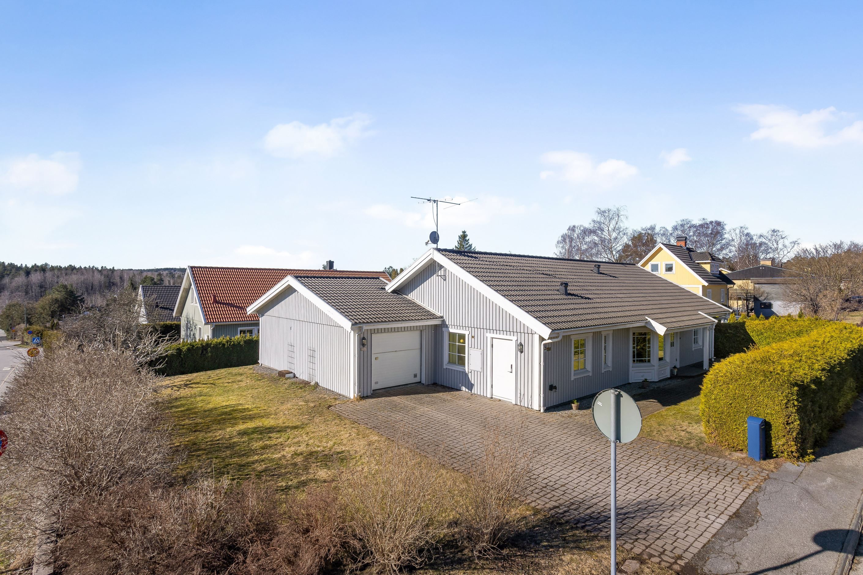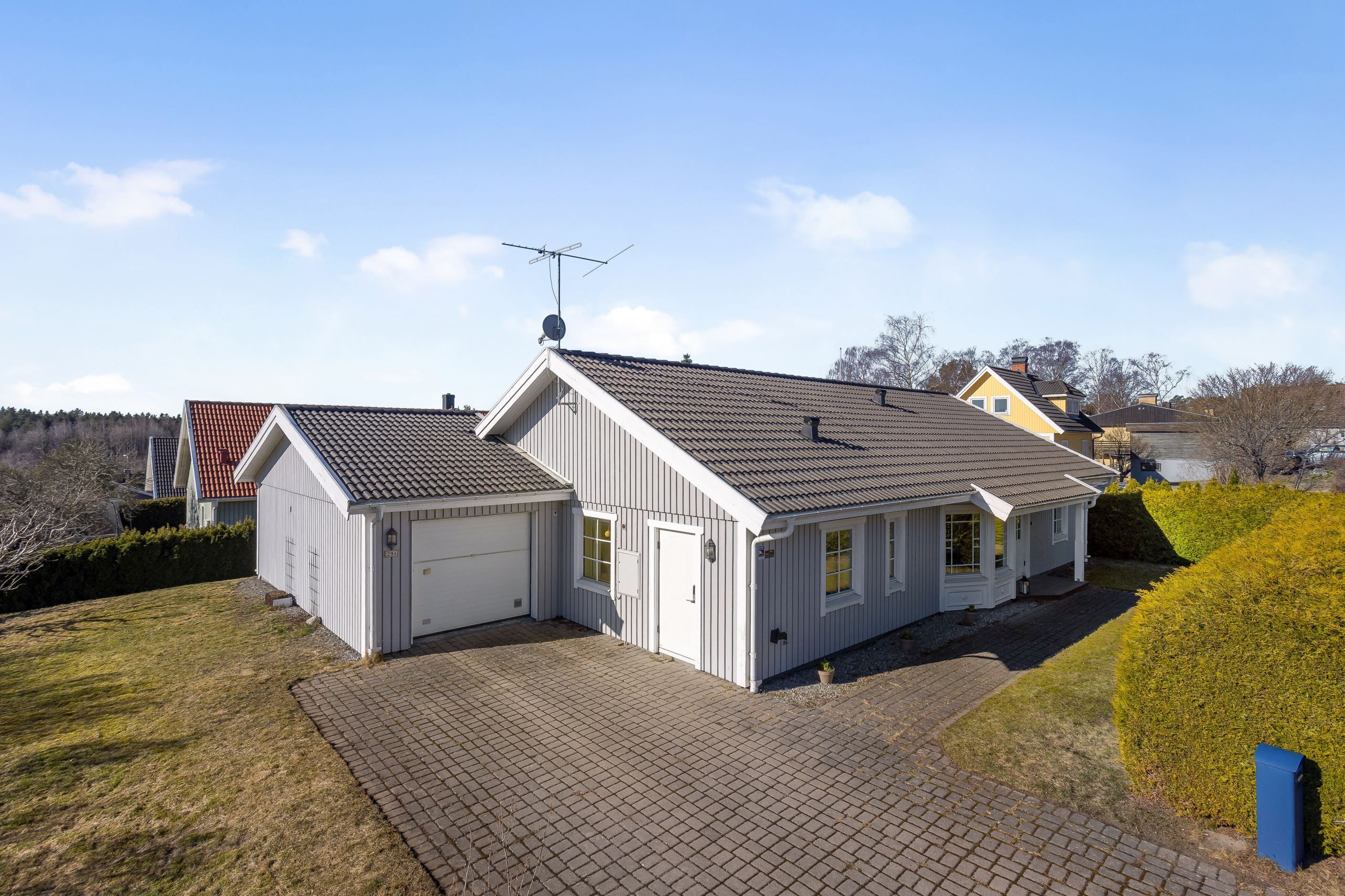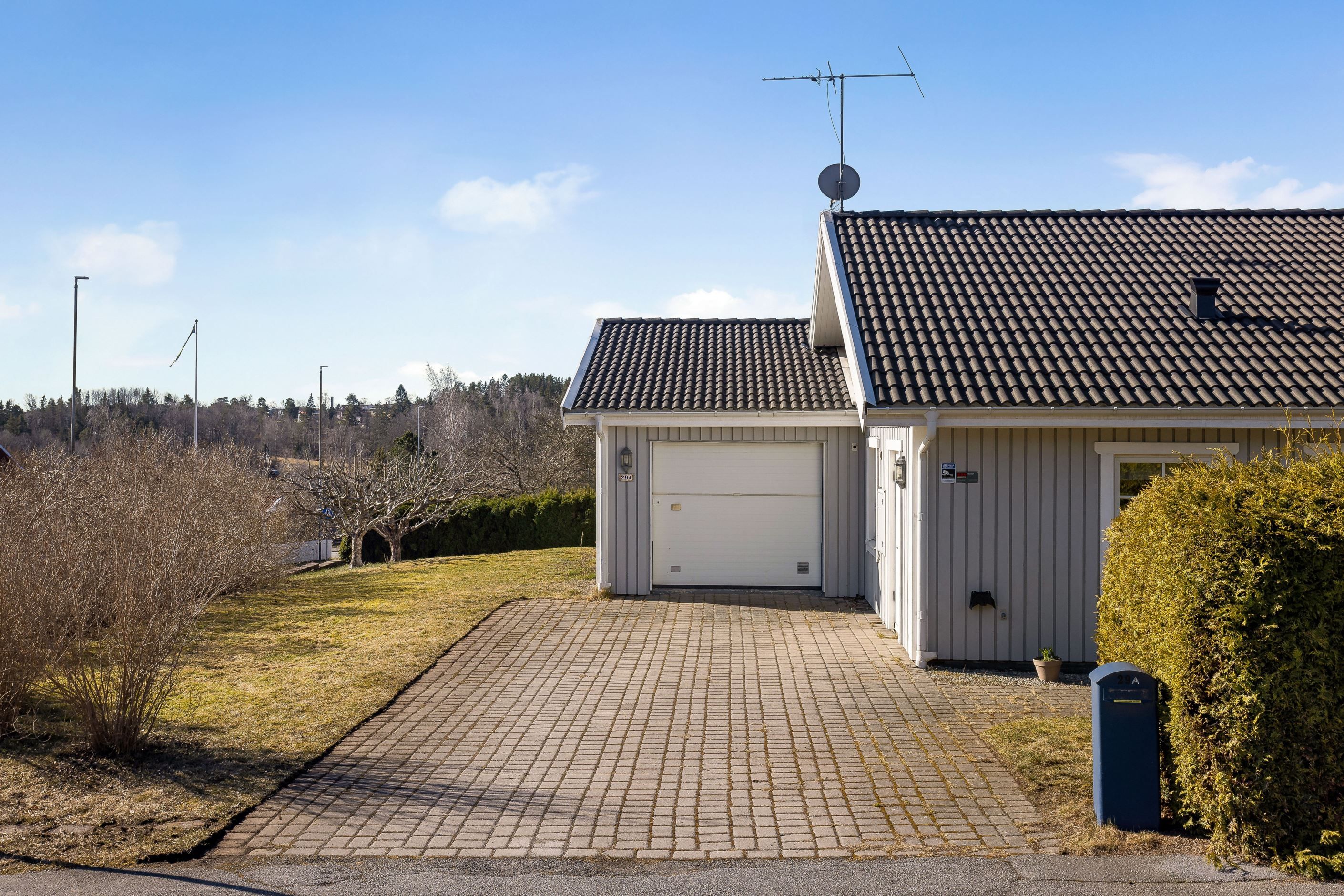 På framsidan finns en stenbelagd uppfart med plats för cirka två bilar samt garage med tillhörande förråd och egen ingång. På södersidan av taket sitter solcellsanläggningen – ett energieffektivt tillskott som bidrar till lägre driftkostnader.