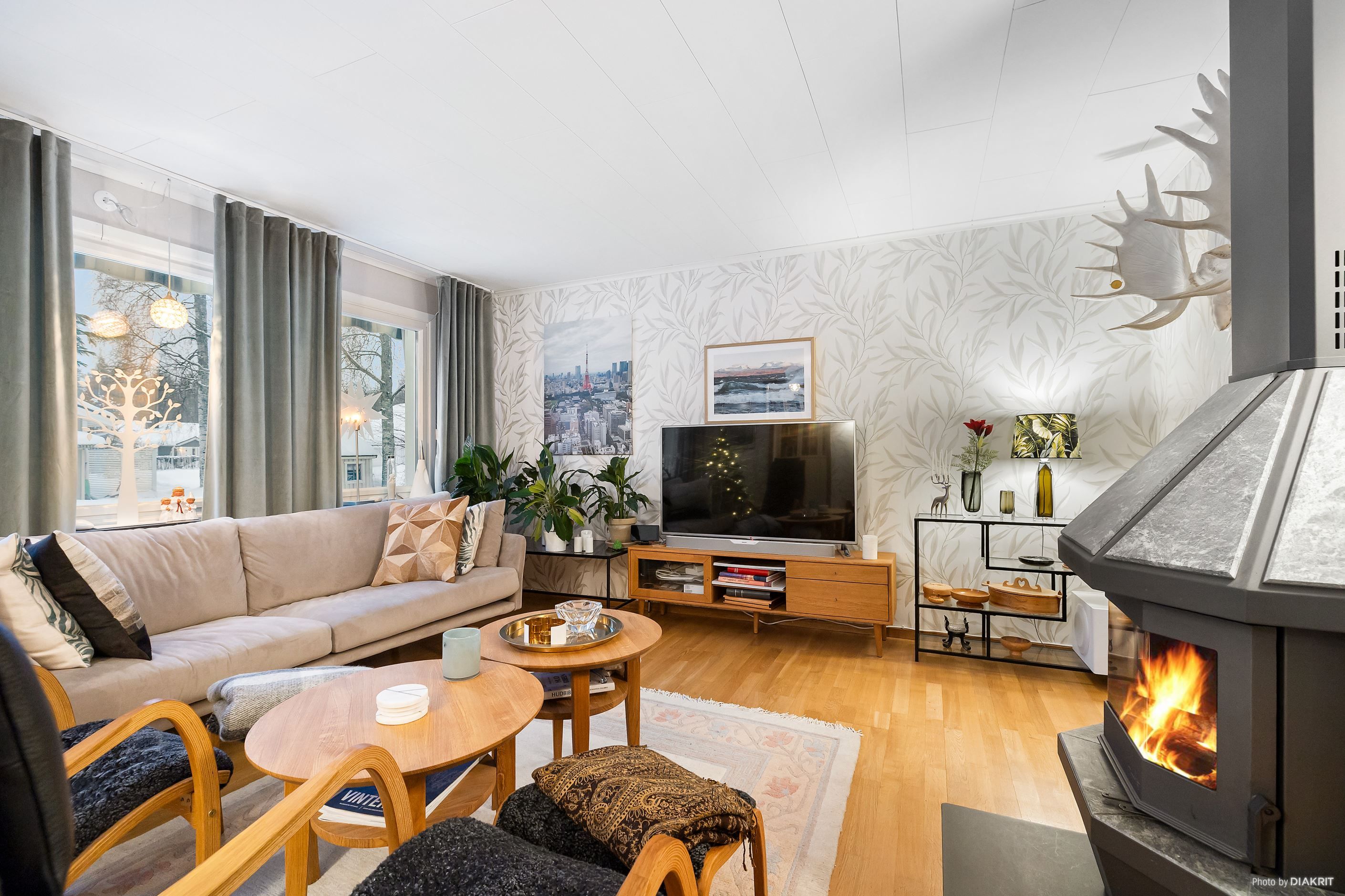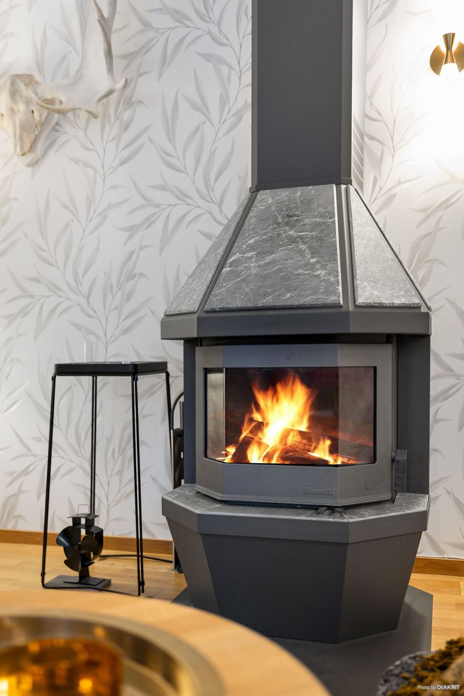 Huset värms upp via fjärrvärme, luftvärmepump och extra värme av en braskamin.