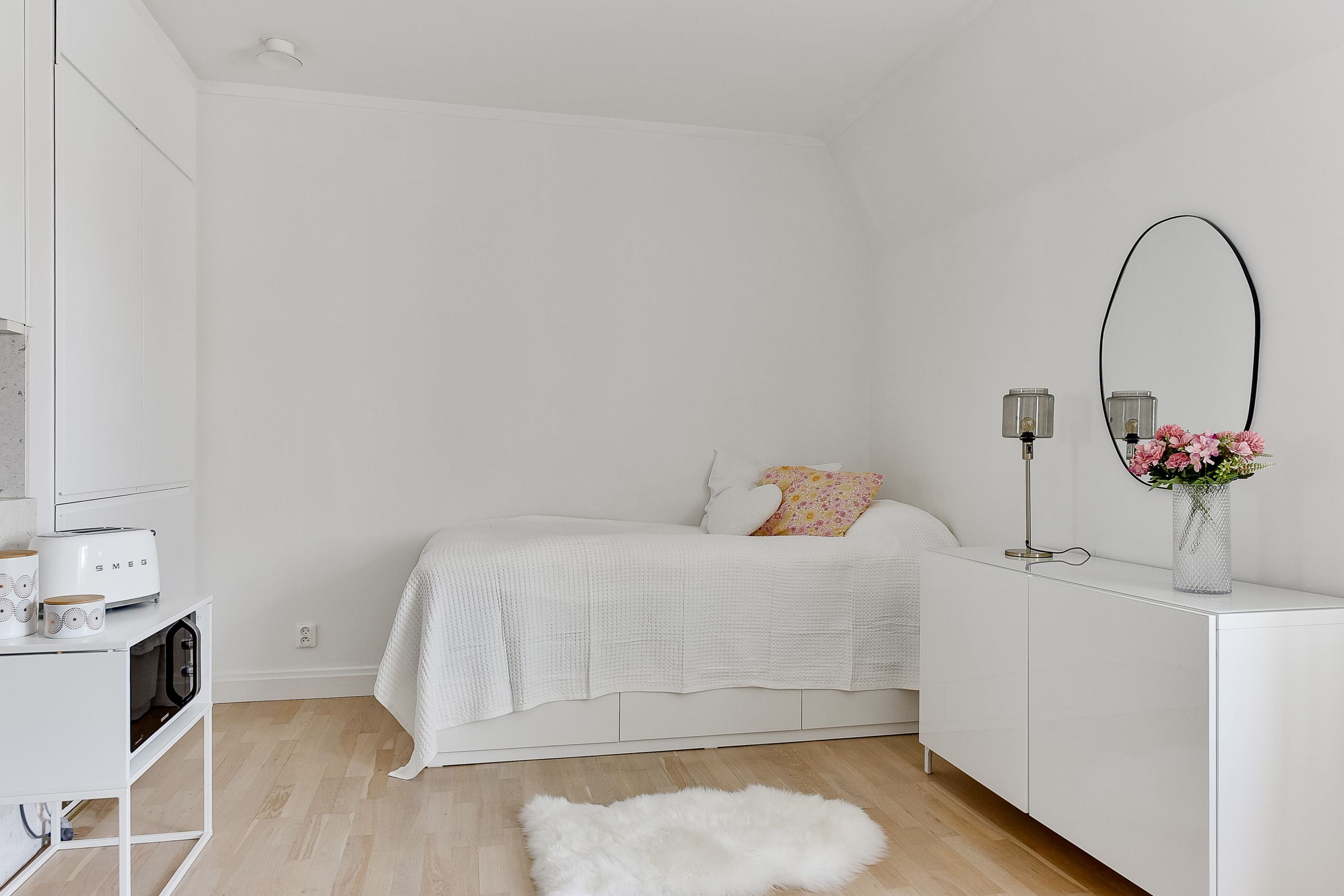 Allrummet är ljust och rymligt med plats för både större säng, soffgrupp och matplats – ett perfekt utrymme för såväl vardag som umgänge. Den ljusa parketten och den imponerande takhöjden förstärker känslan av rymd och exklusivitet.