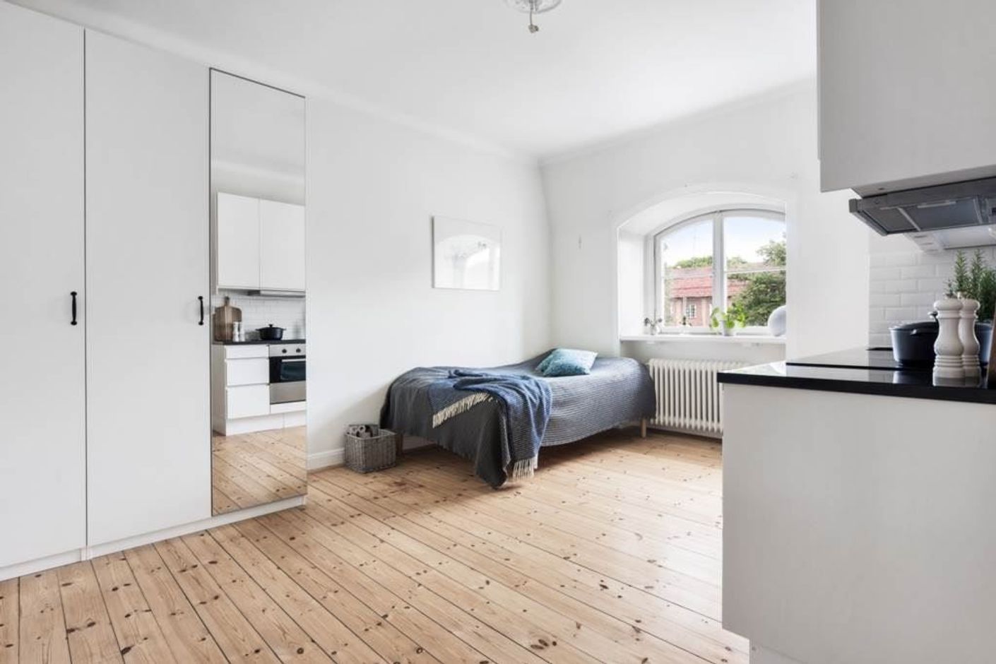 I lägenheten finns ett välutrustat kök med en hög standard och komplett maskinell utrustning, duschrum och toalett är båda kaklade i en stilren färgsättning. Med lite kreativ möblering får både säng, matbord, förvaring och annat passande möblemang plats.
