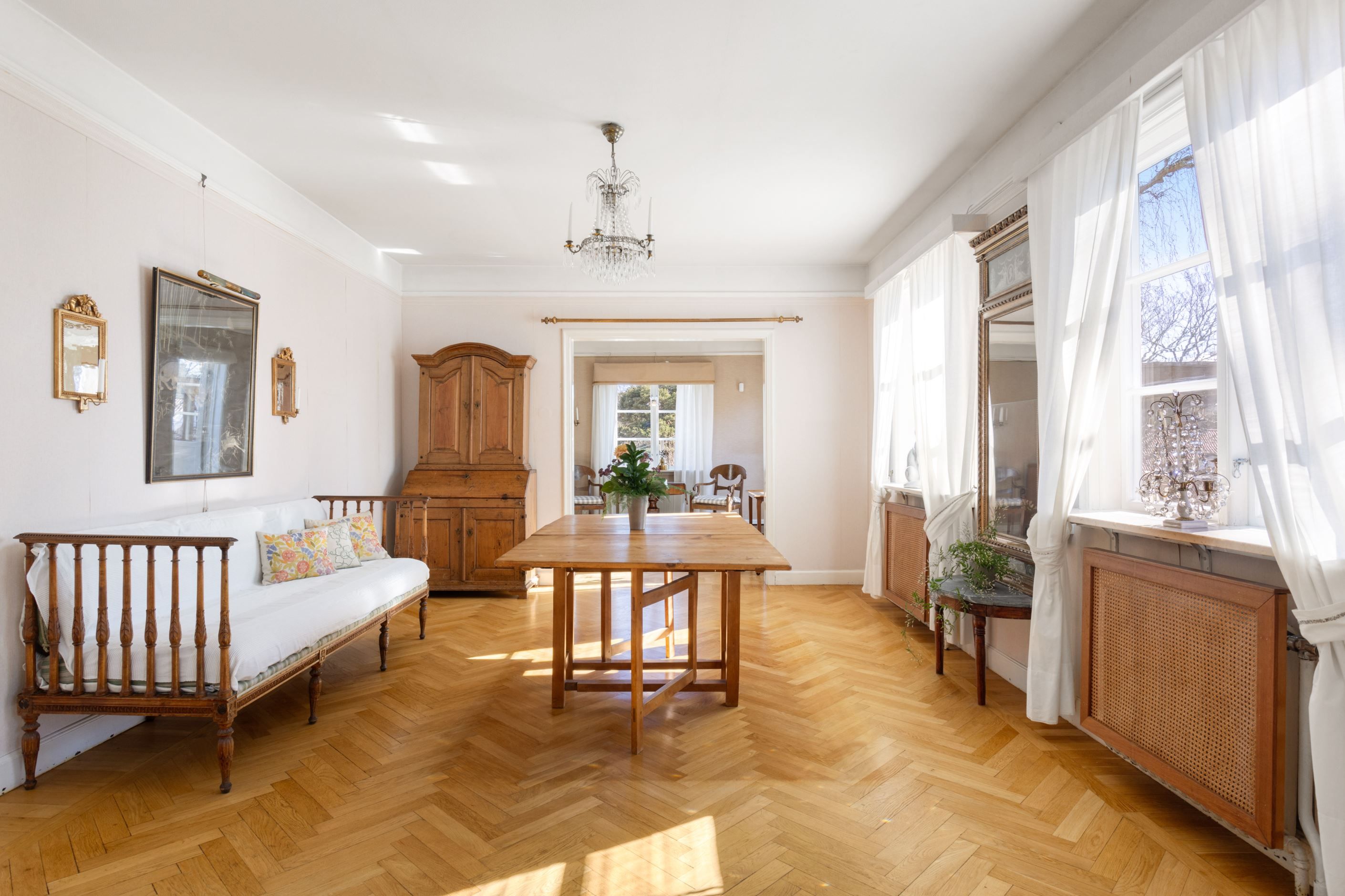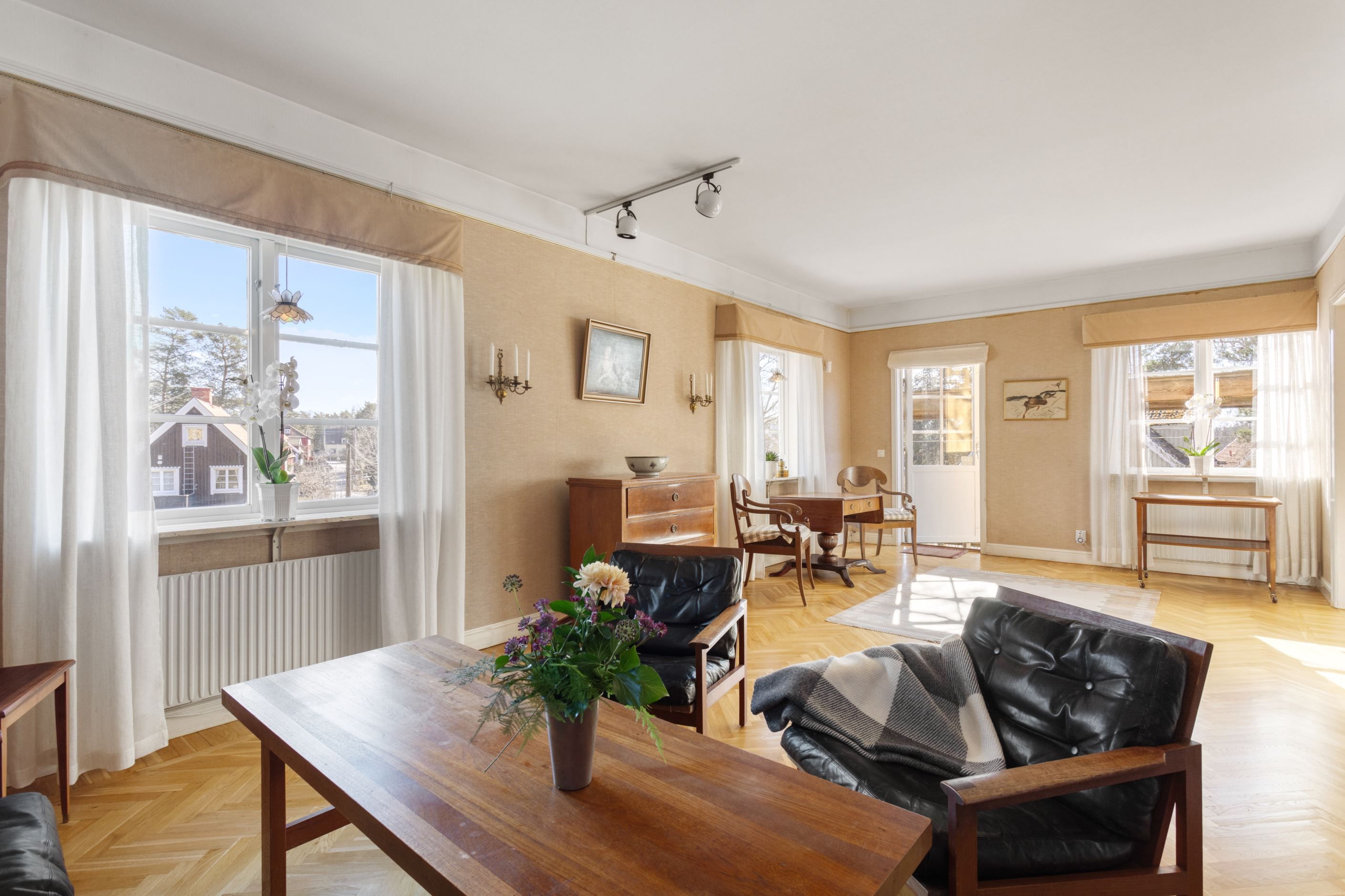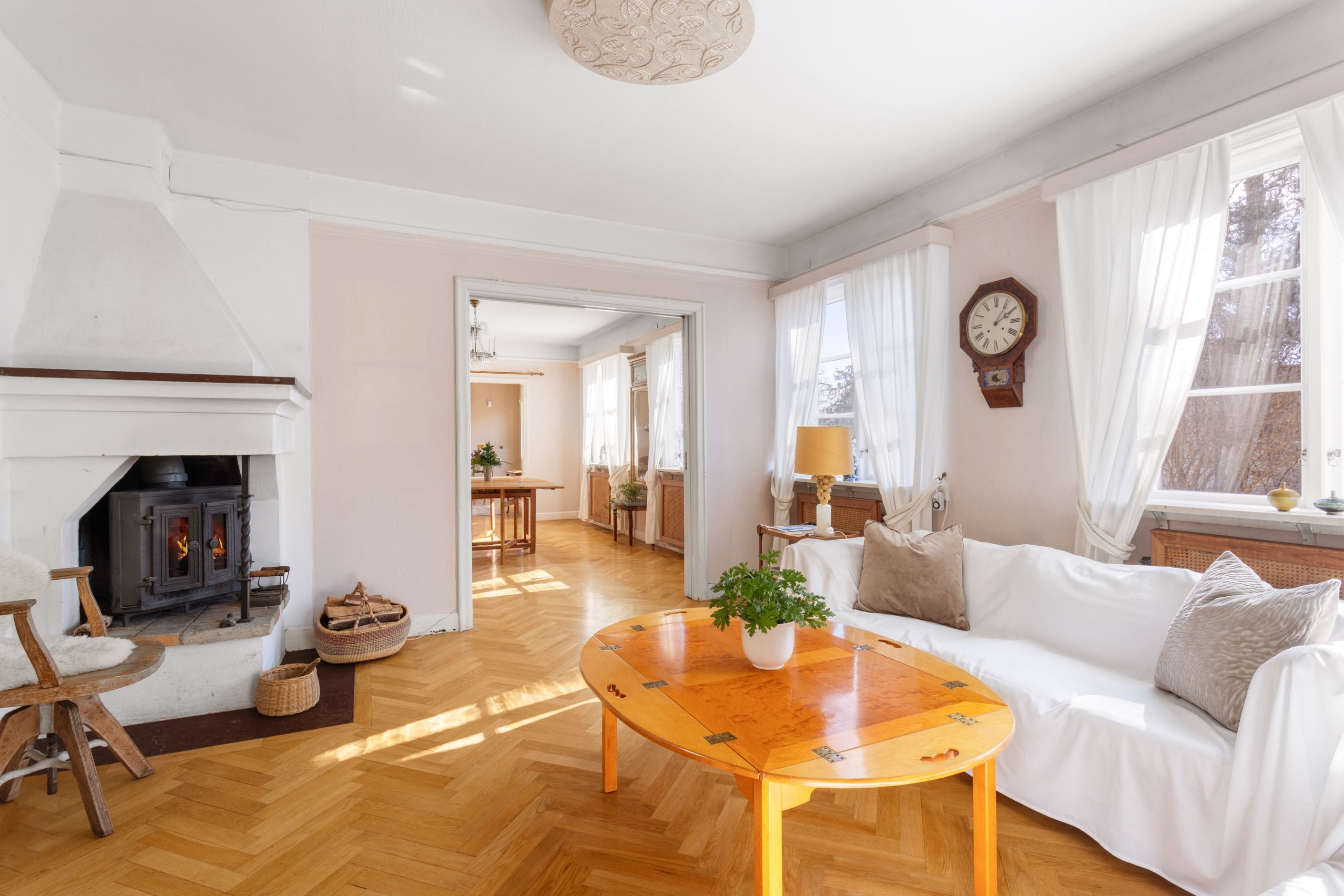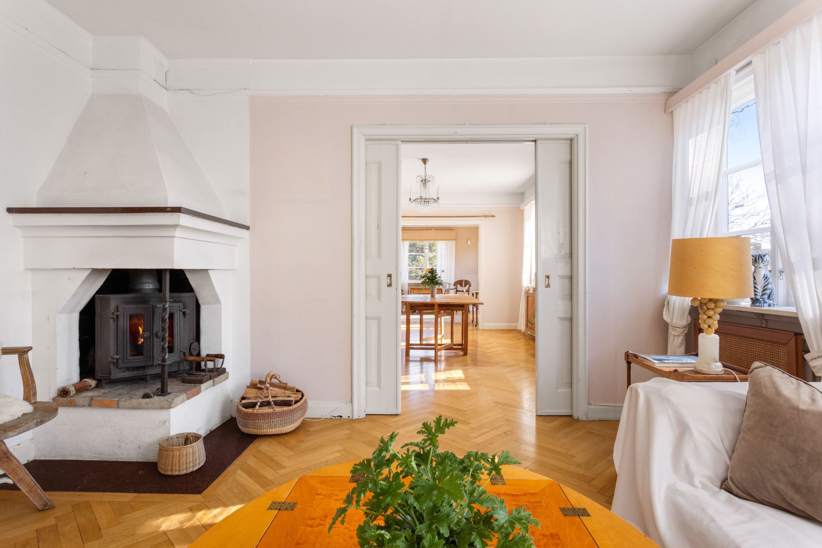 ENTRÉPLAN – Ingång via vacker glasad veranda till möblerbar HALL med gott om plats för ytterkläder samt en praktisk GÄST-WC med dusch. Vackra och väl tilltagna SÄLLSKAPSYTOR med underbart ljusflöde och härlig rymd - hela tre rum i fil. Rummen badar i ljus genom höga spröjsade fönster i tre väderstreck, med vy mot vackert grönskande tomt. Öppen spis samt stavlagd ekparkett vilket trivsamt binder samman rummen. Här ryms det stora sällskapet för härliga lugna hemmakvällar eller ytor för representation på högsta nivå. Altandörr öppnar upp mot uteplats under tak.