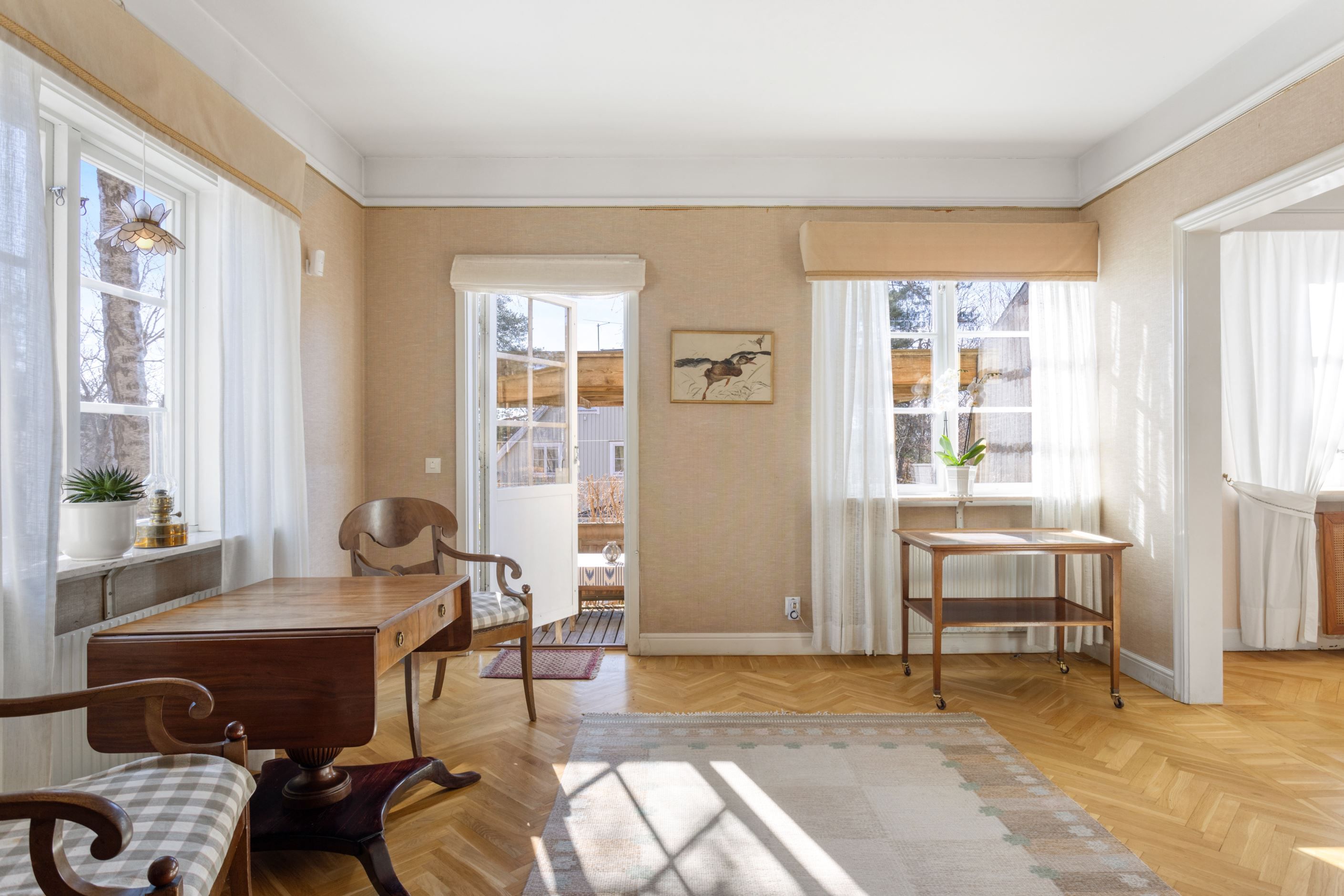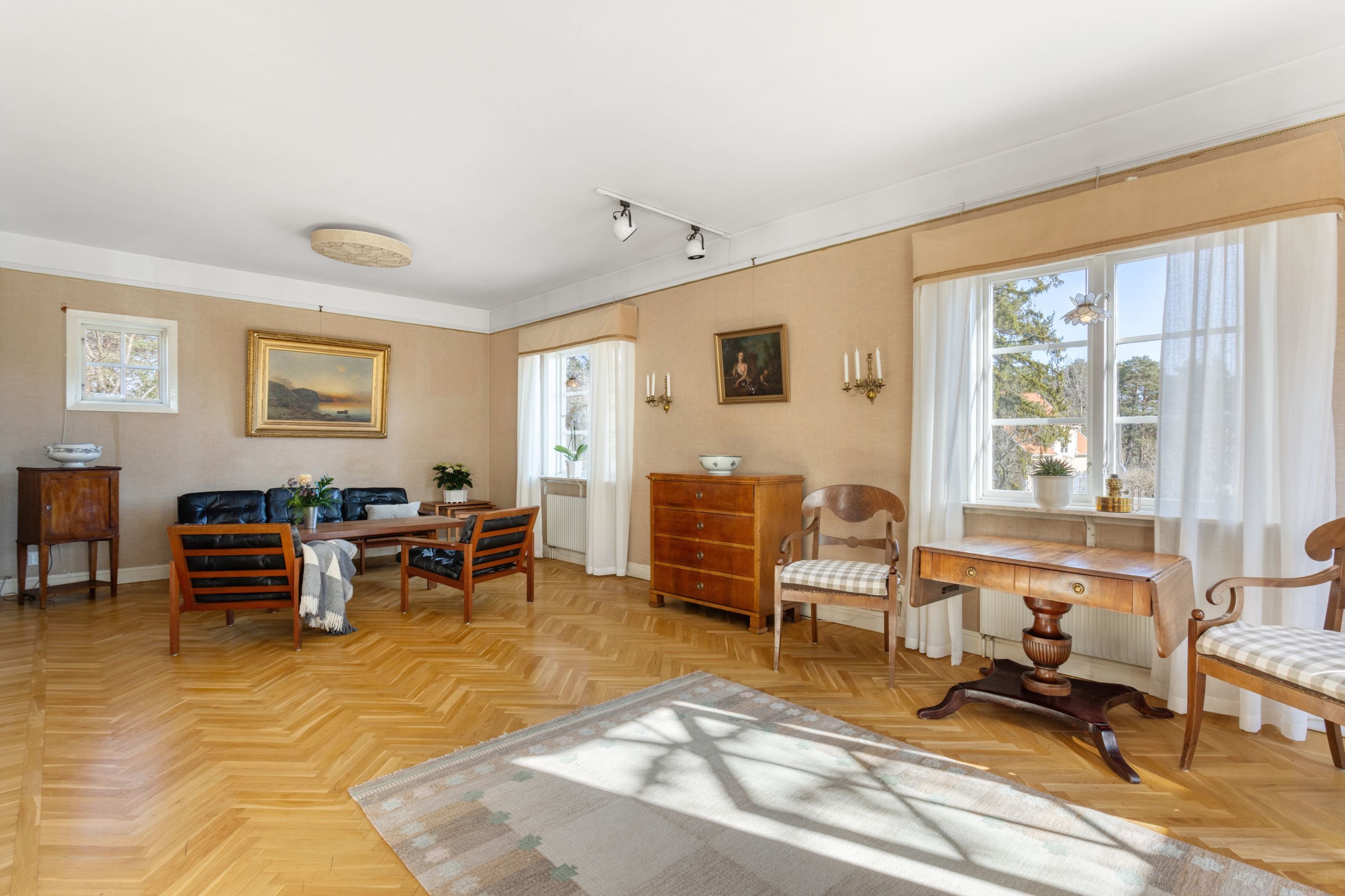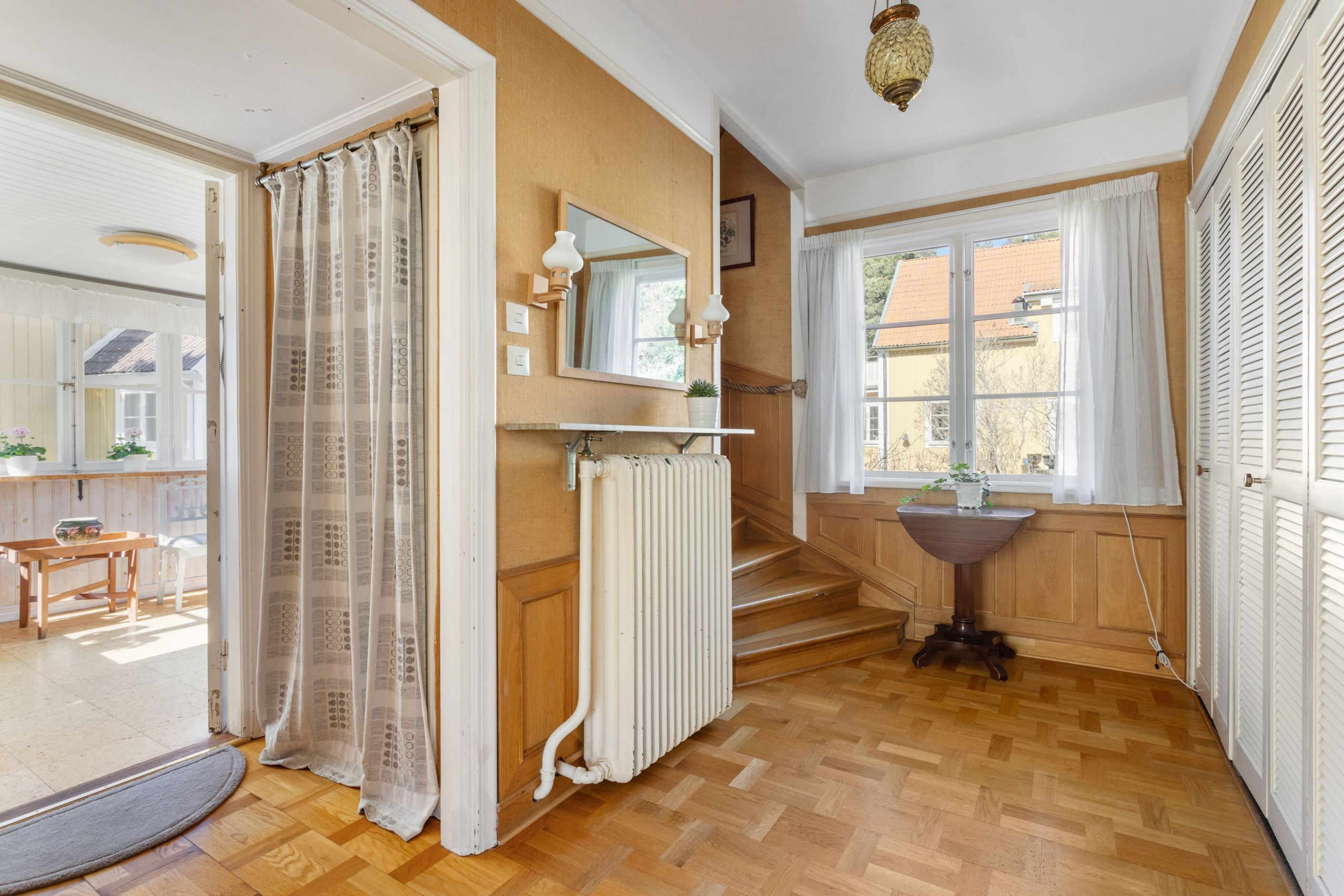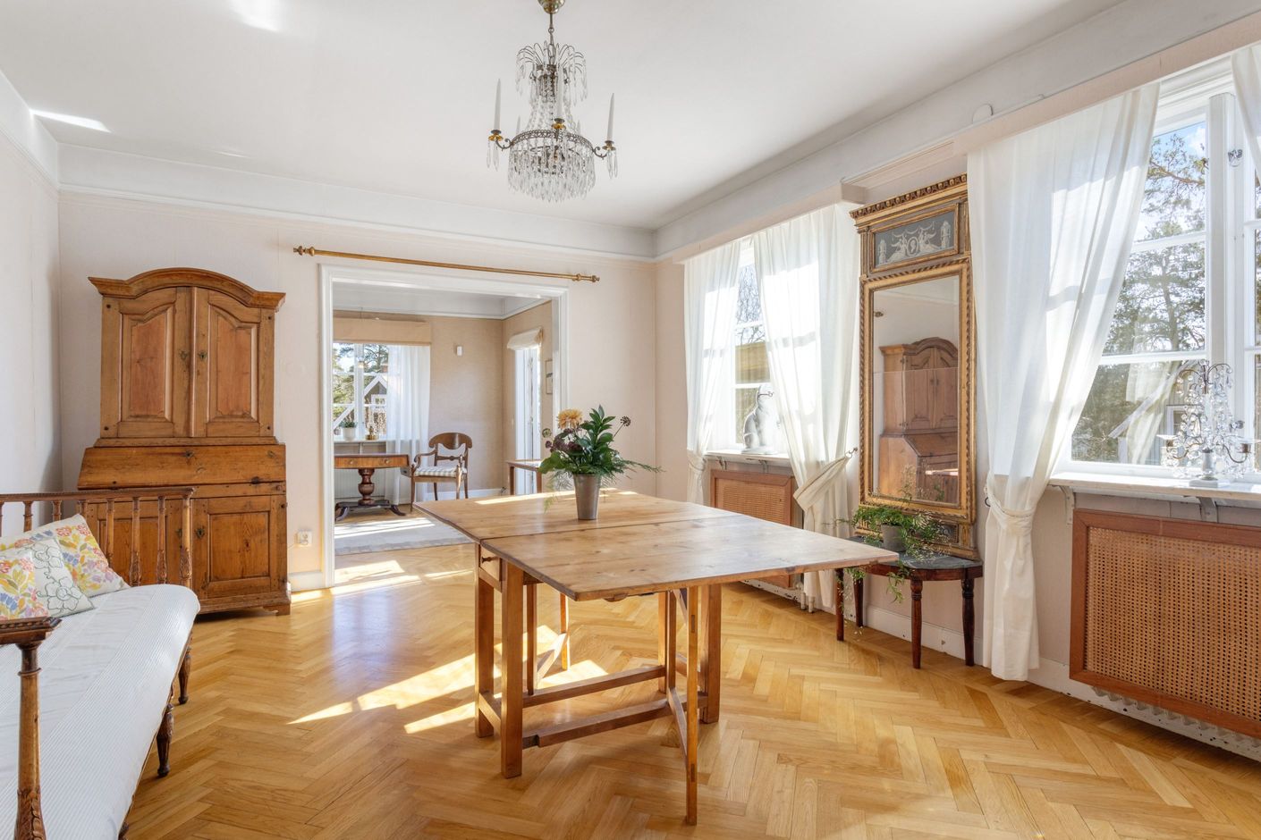 ENTRÉPLAN – Ingång via vacker glasad veranda till möblerbar HALL med gott om plats för ytterkläder samt en praktisk GÄST-WC med dusch. Vackra och väl tilltagna SÄLLSKAPSYTOR med underbart ljusflöde och härlig rymd - hela tre rum i fil. Rummen badar i ljus genom höga spröjsade fönster i tre väderstreck, med vy mot vackert grönskande tomt. Öppen spis samt stavlagd ekparkett vilket trivsamt binder samman rummen. Här ryms det stora sällskapet för härliga lugna hemmakvällar eller ytor för representation på högsta nivå. Altandörr öppnar upp mot uteplats under tak.