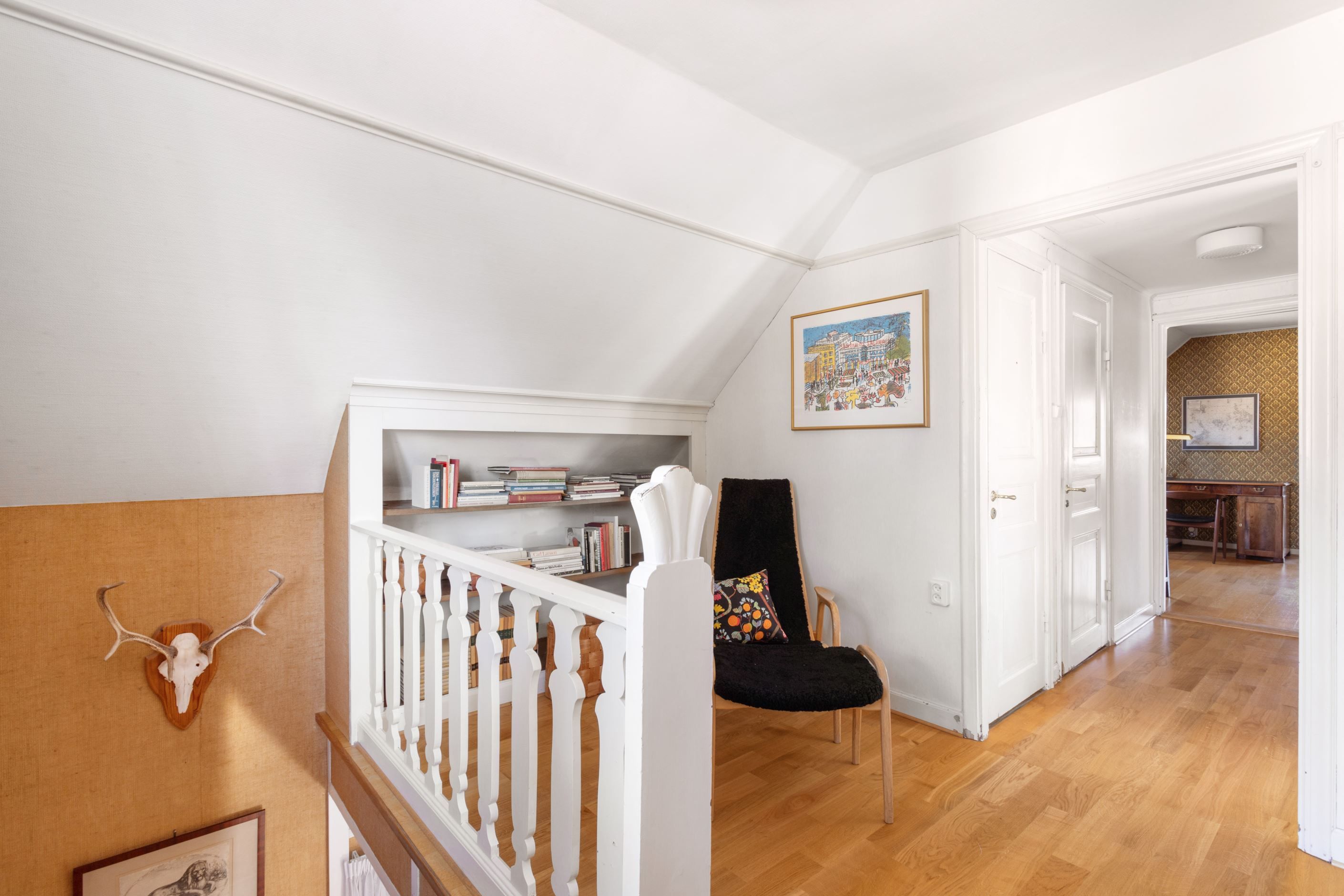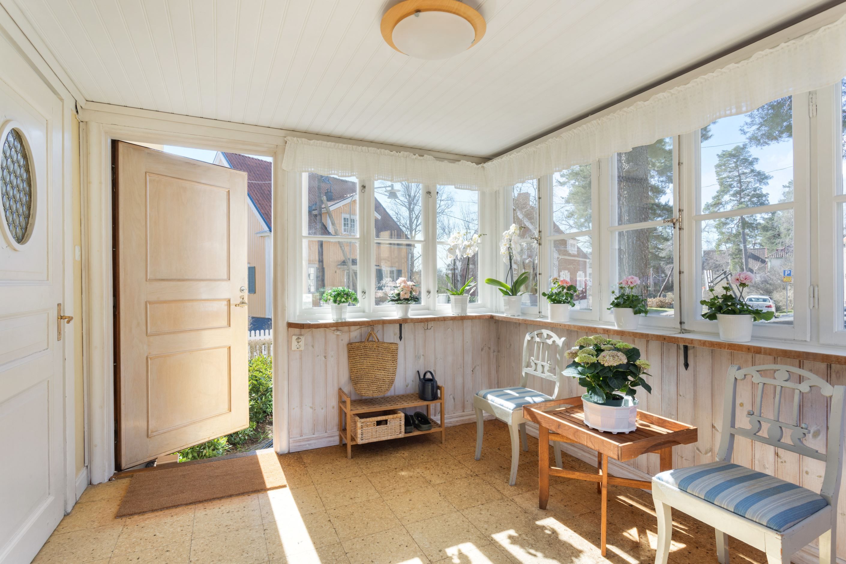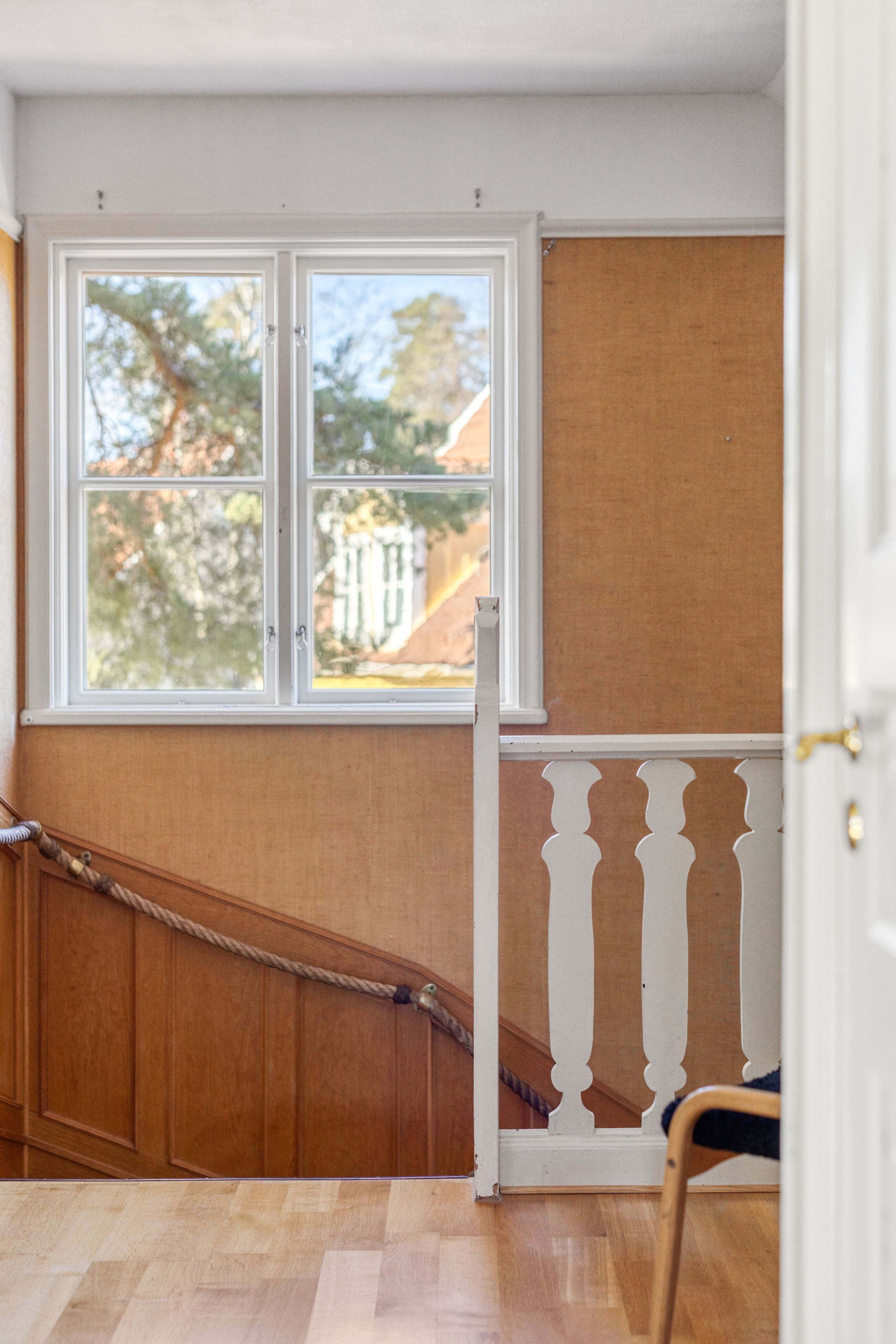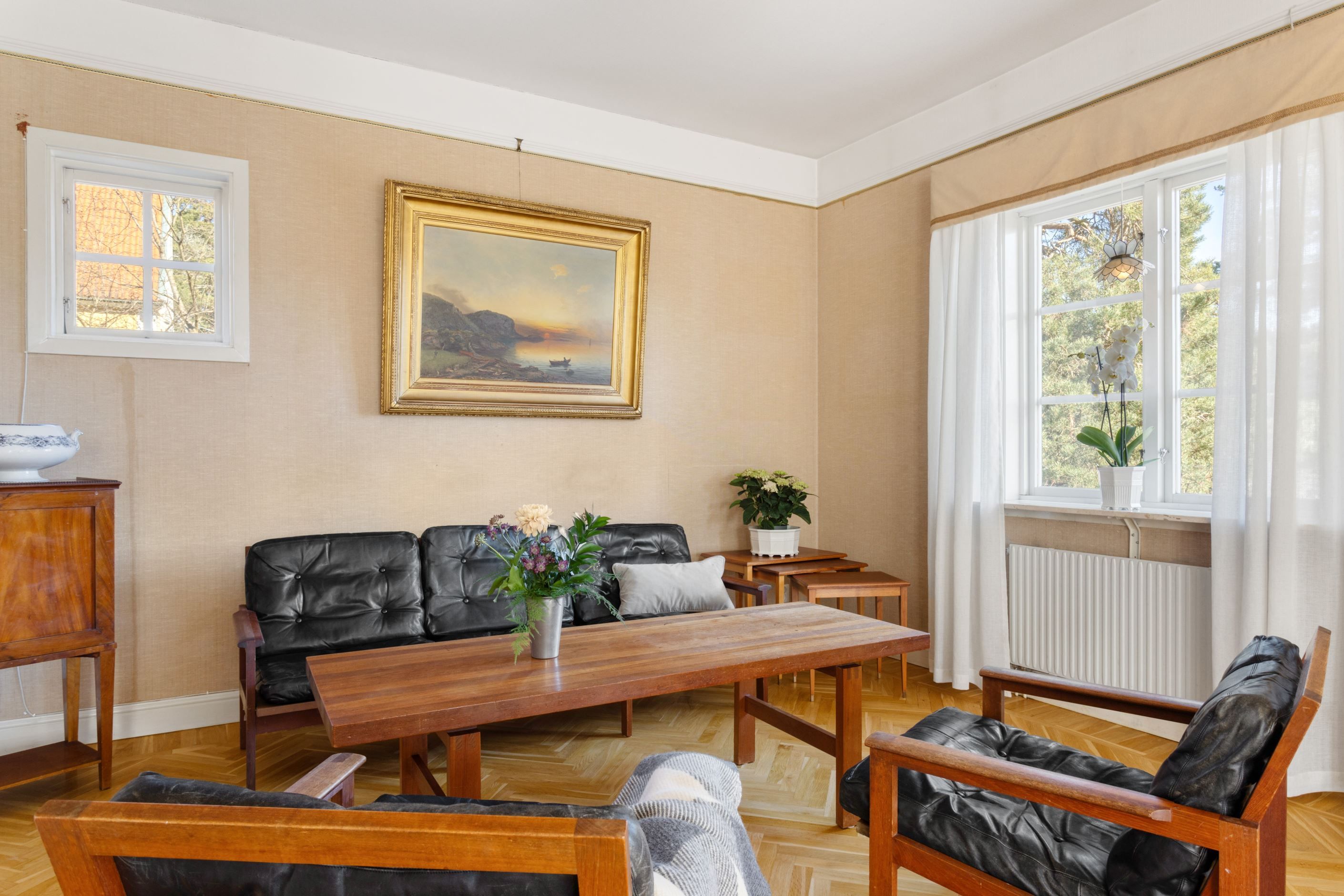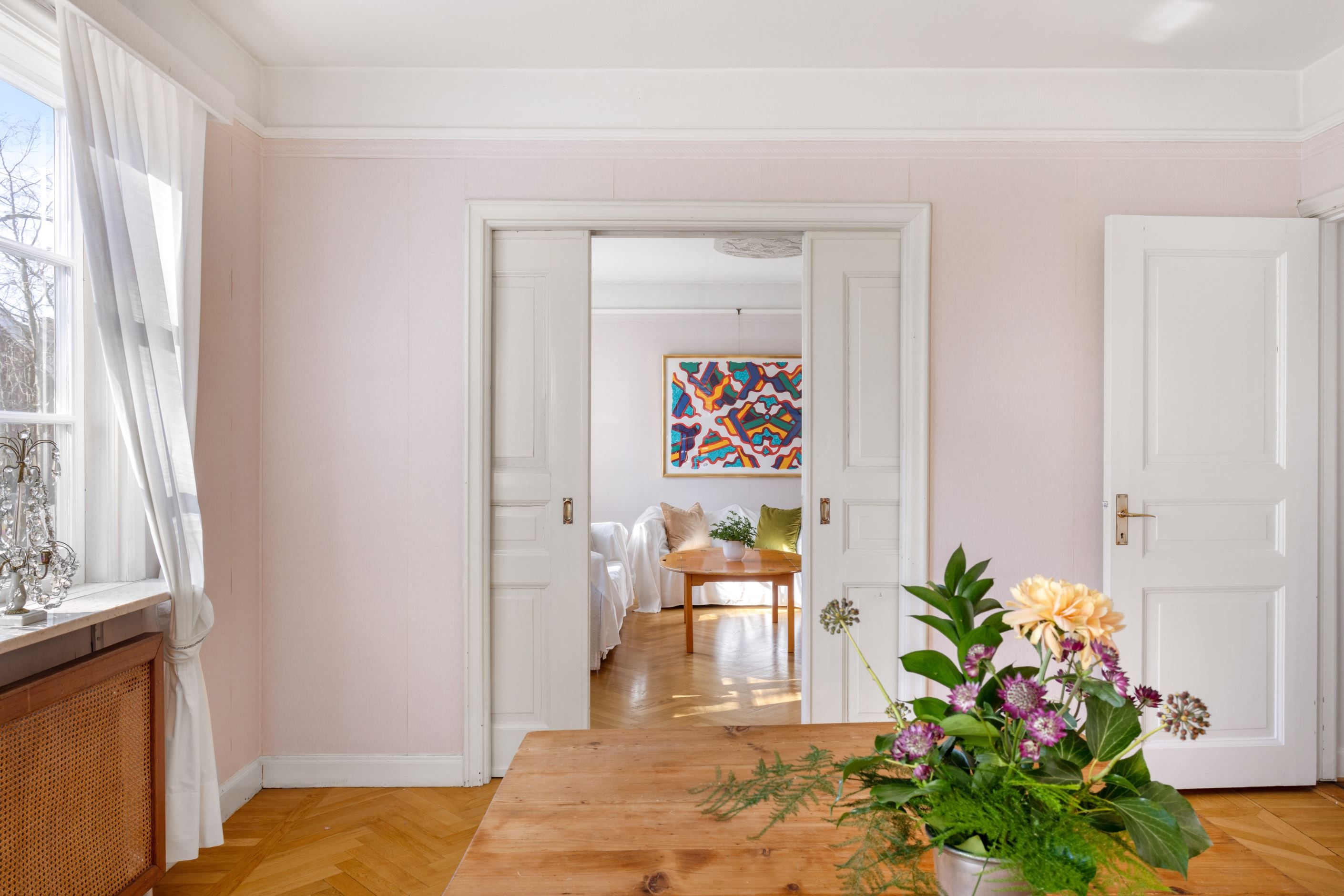 ENTRÉPLAN – Ingång via vacker glasad veranda till möblerbar HALL med gott om plats för ytterkläder samt en praktisk GÄST-WC med dusch. Vackra och väl tilltagna SÄLLSKAPSYTOR med underbart ljusflöde och härlig rymd - hela tre rum i fil. Rummen badar i ljus genom höga spröjsade fönster i tre väderstreck, med vy mot vackert grönskande tomt. Öppen spis samt stavlagd ekparkett vilket trivsamt binder samman rummen. Här ryms det stora sällskapet för härliga lugna hemmakvällar eller ytor för representation på högsta nivå. Altandörr öppnar upp mot uteplats under tak.