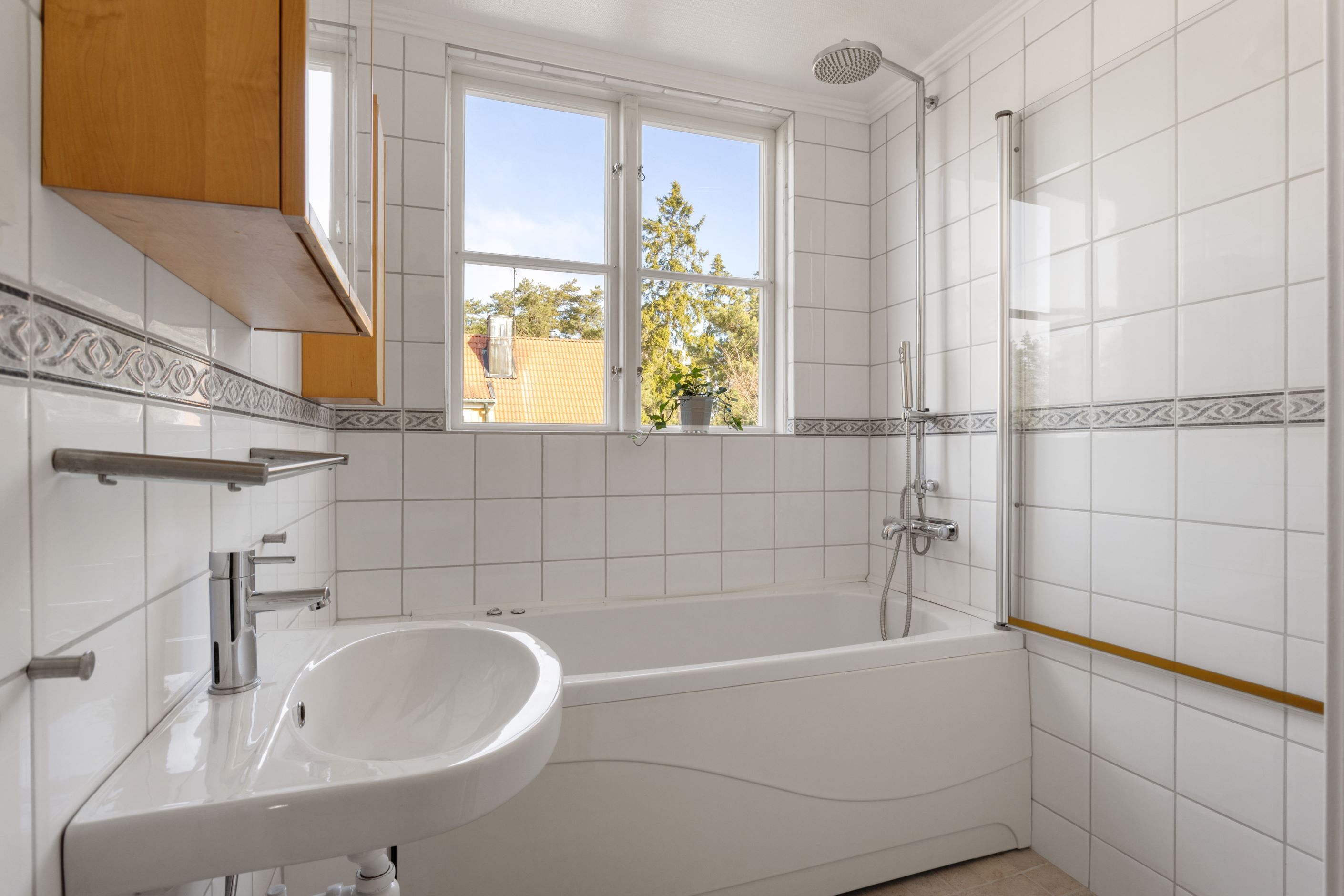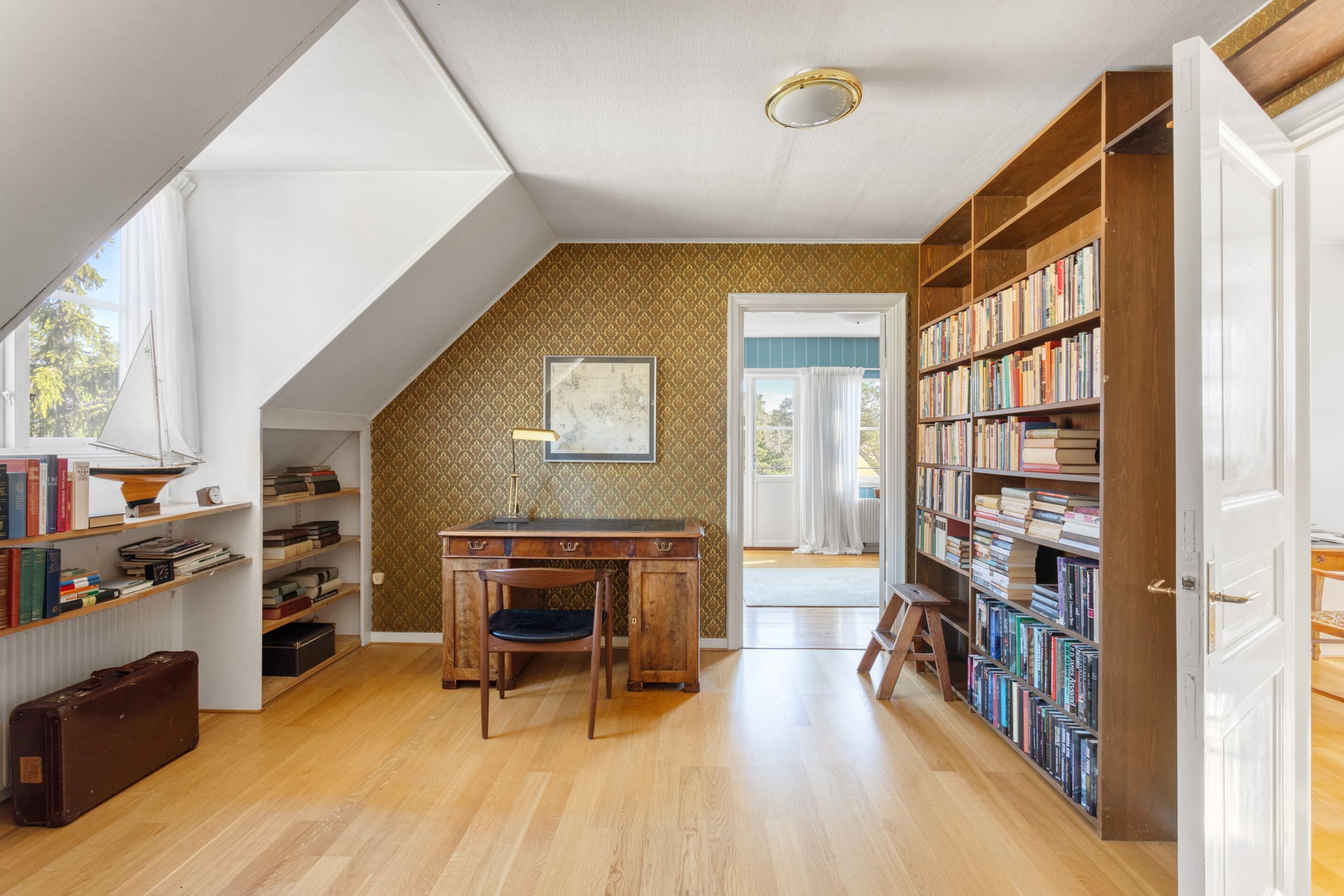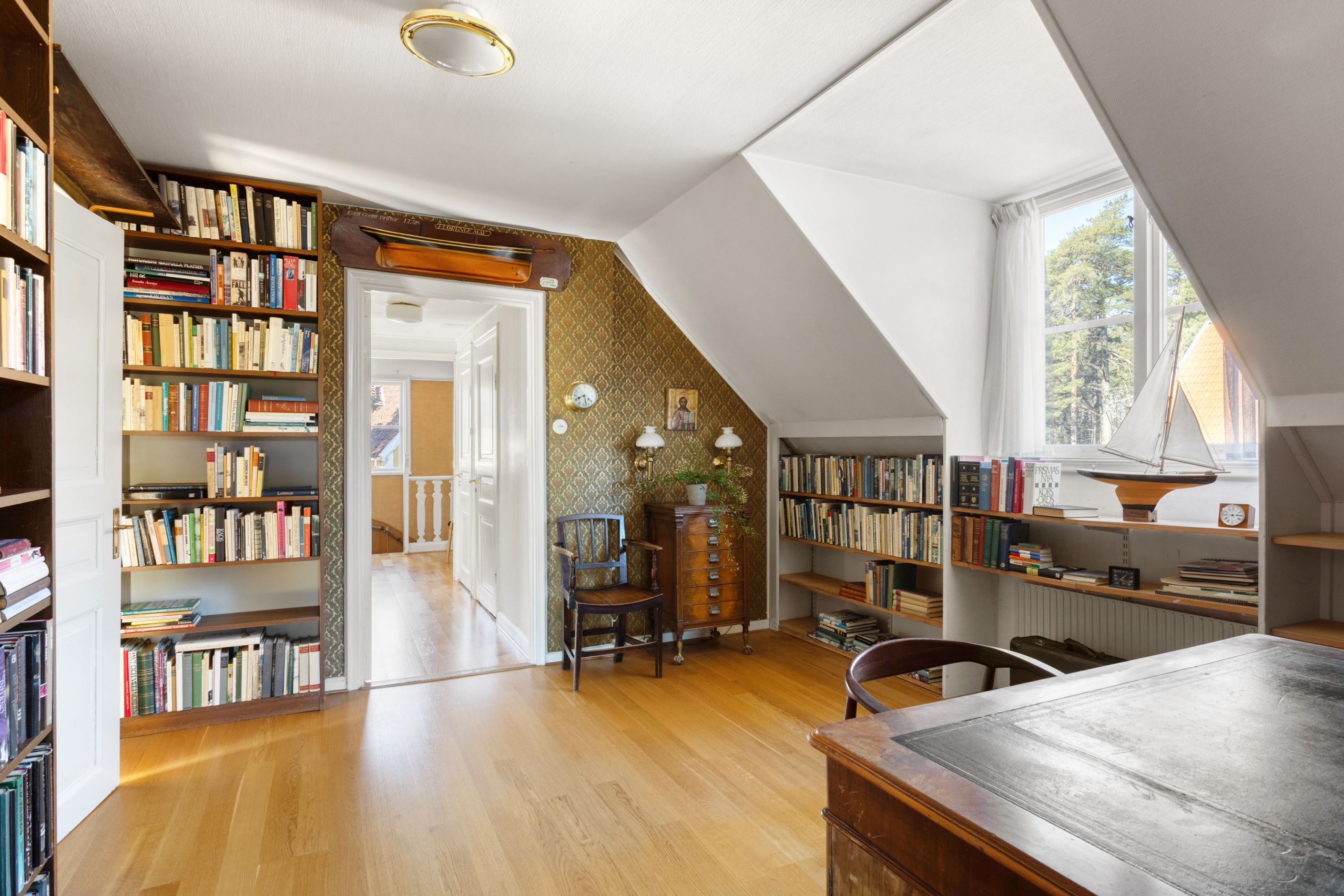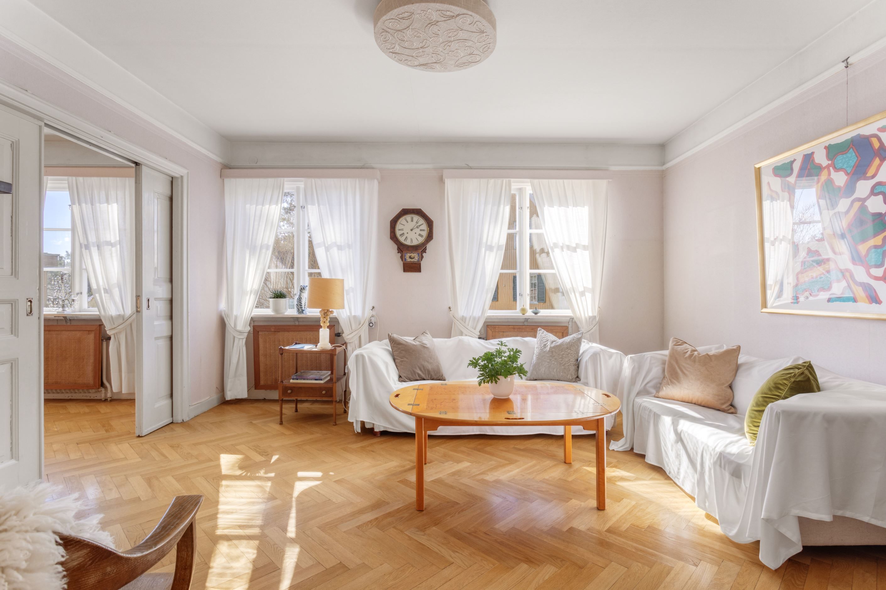 ENTRÉPLAN – Ingång via vacker glasad veranda till möblerbar HALL med gott om plats för ytterkläder samt en praktisk GÄST-WC med dusch. Vackra och väl tilltagna SÄLLSKAPSYTOR med underbart ljusflöde och härlig rymd - hela tre rum i fil. Rummen badar i ljus genom höga spröjsade fönster i tre väderstreck, med vy mot vackert grönskande tomt. Öppen spis samt stavlagd ekparkett vilket trivsamt binder samman rummen. Här ryms det stora sällskapet för härliga lugna hemmakvällar eller ytor för representation på högsta nivå. Altandörr öppnar upp mot uteplats under tak.