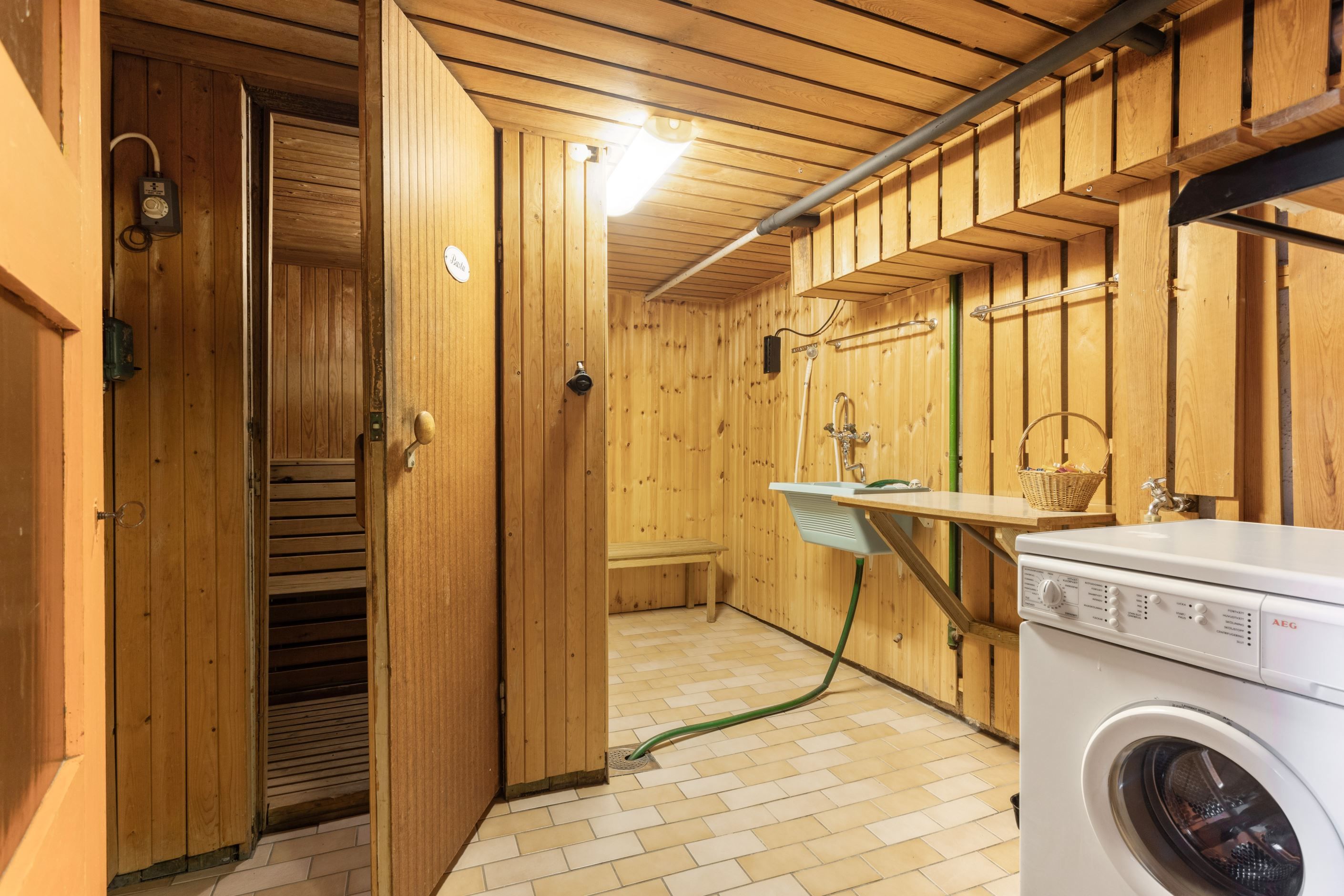 NEDRE PLAN – På källarplan återfinns TVÄTTSTUGA samt BASTU. Därtill PANNRUM och gott om FÖRRÅDSYTA. GARAGE om 28 kvm, som för dagen inte nås från huset. Här finns tillfälle att inreda ytterligare boytor, om behov finns.