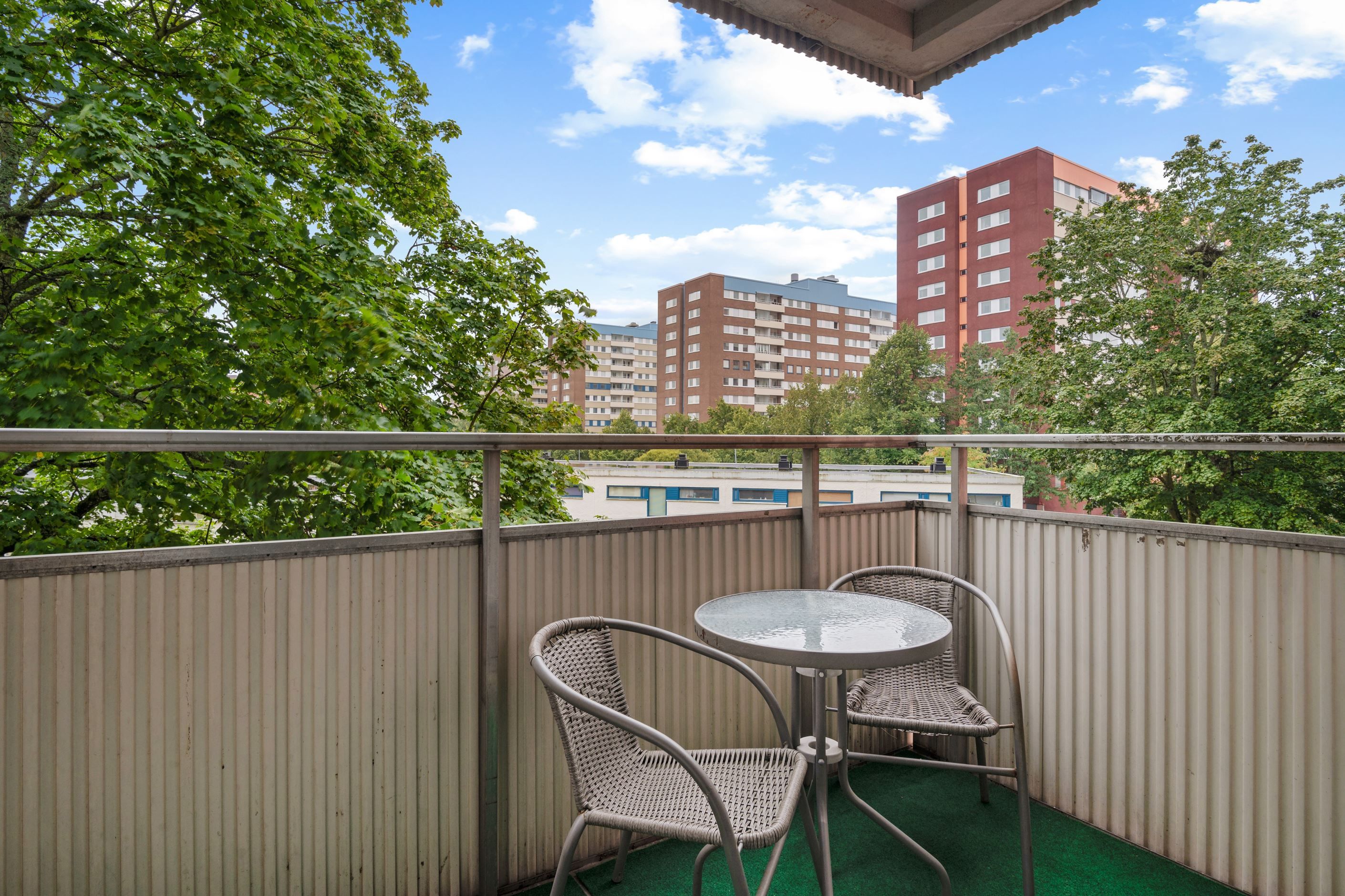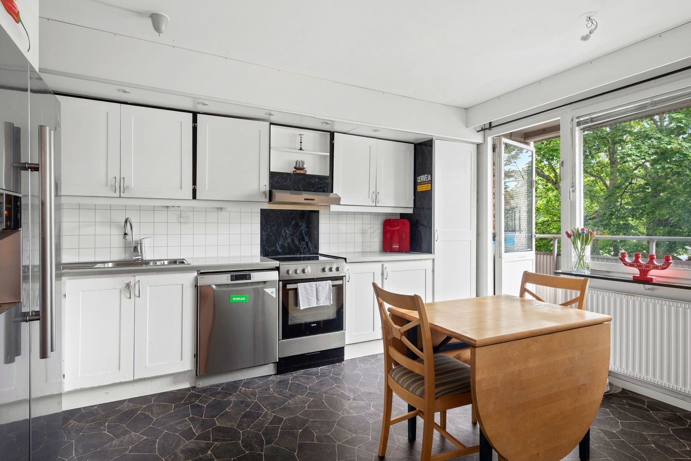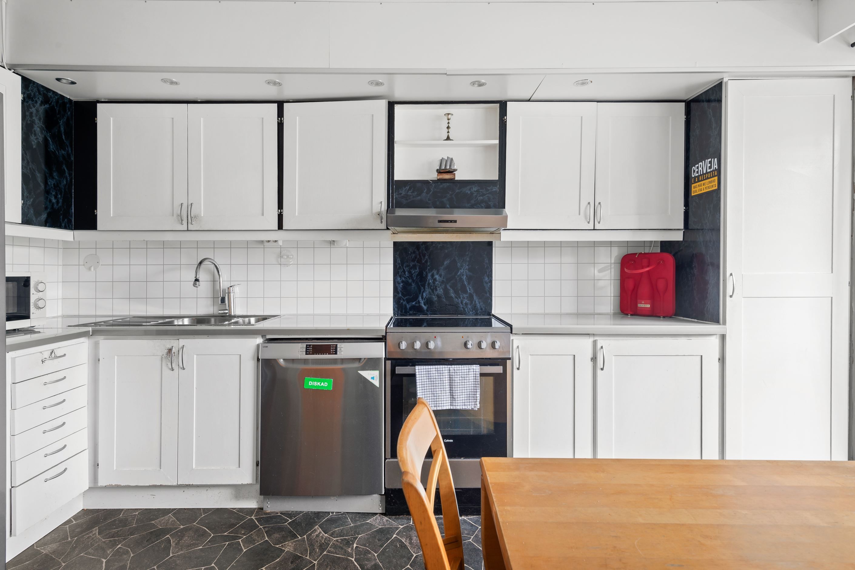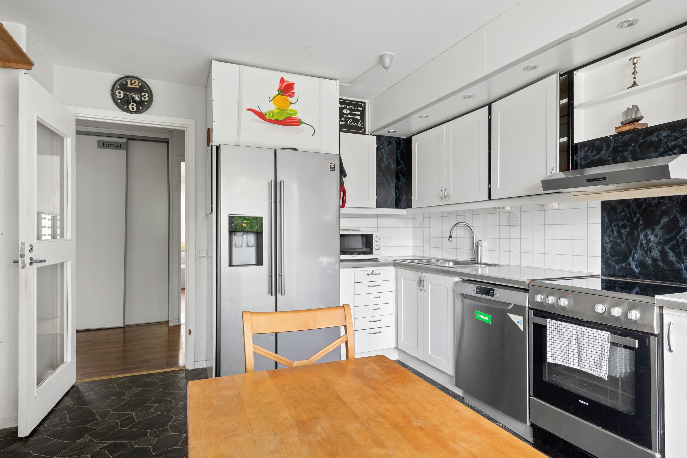 Det rymliga köket erbjuder gott om plats för hela familjen, med en matplats som rymmer 4–6 personer. Här finns allt du behöver i form av kyl, frys, spis med ugn – och dessutom direkt utgång till en härlig balkong i fint läge där morgonkaffet smakar lite extra gott.