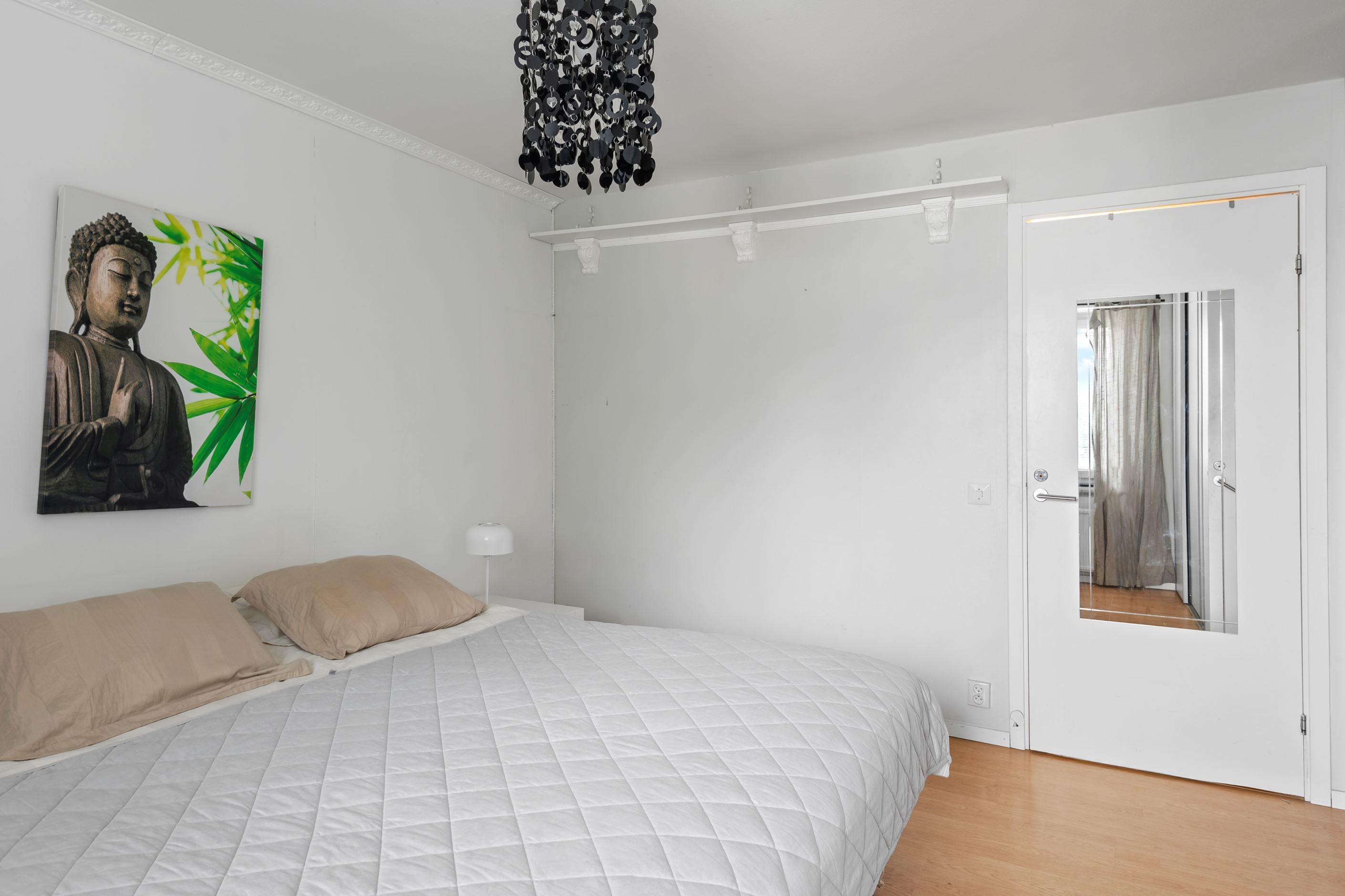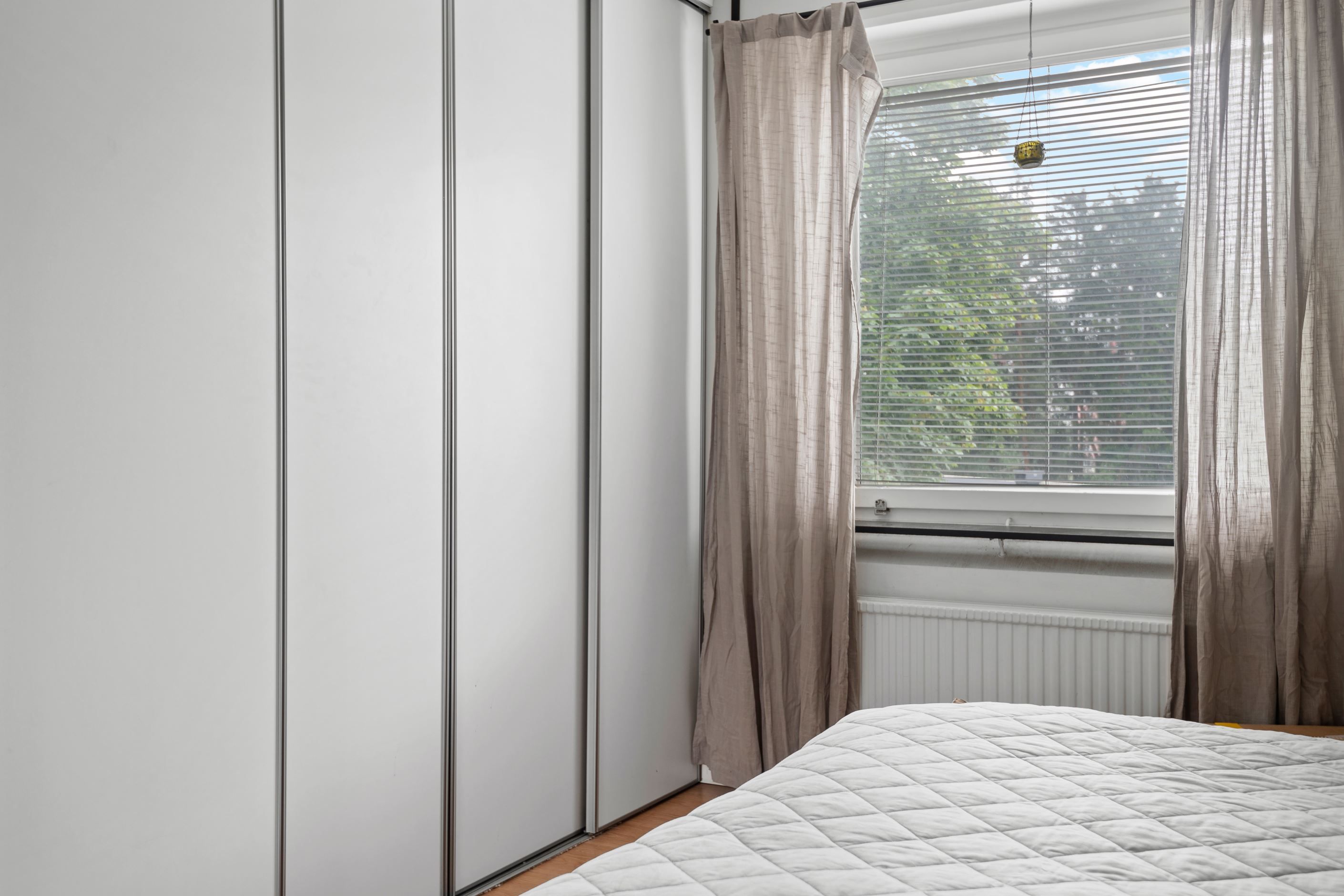 Master bedroom har plats för dubbelsäng och en hel garderobsvägg för smart förvaring.
