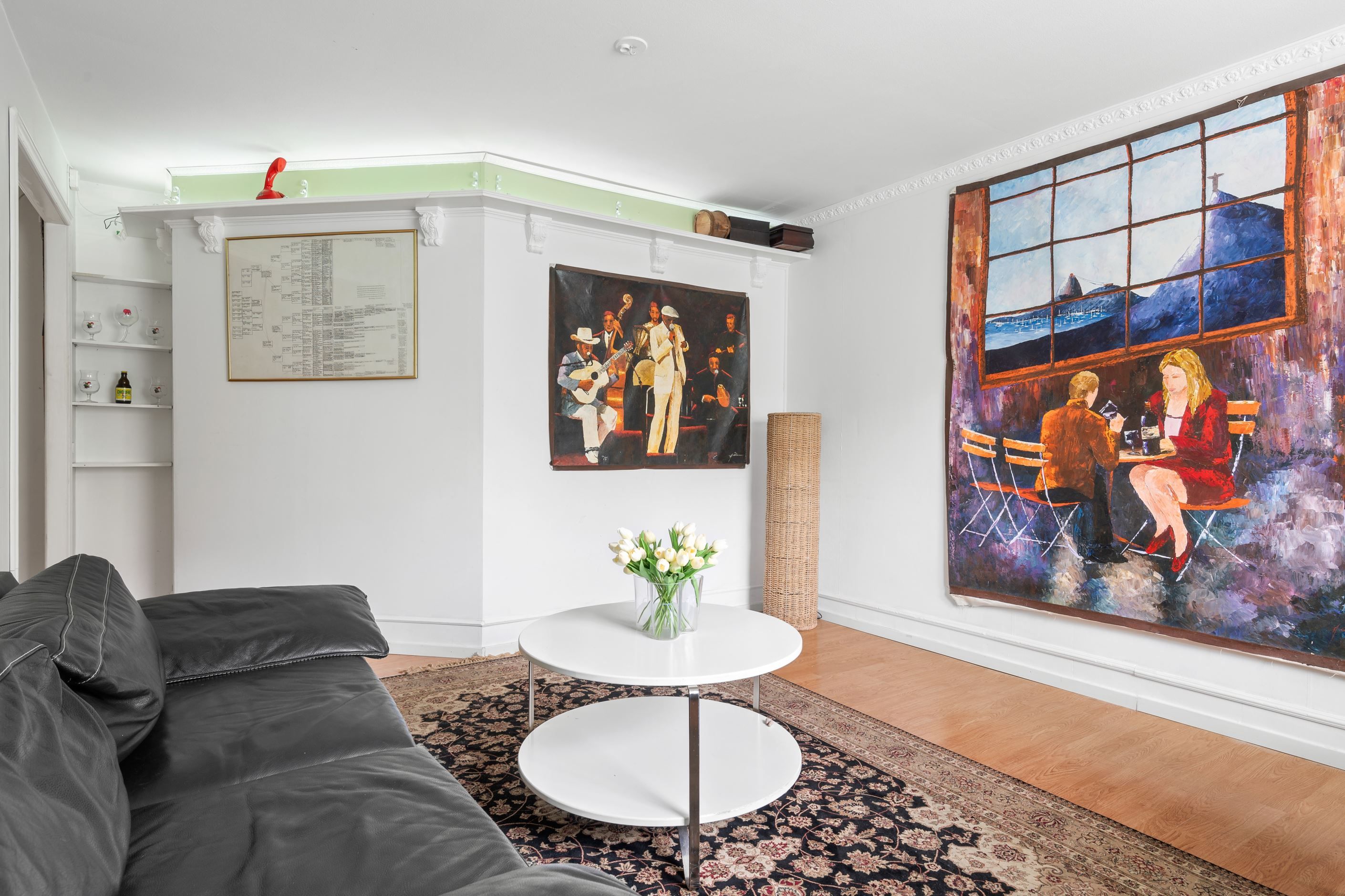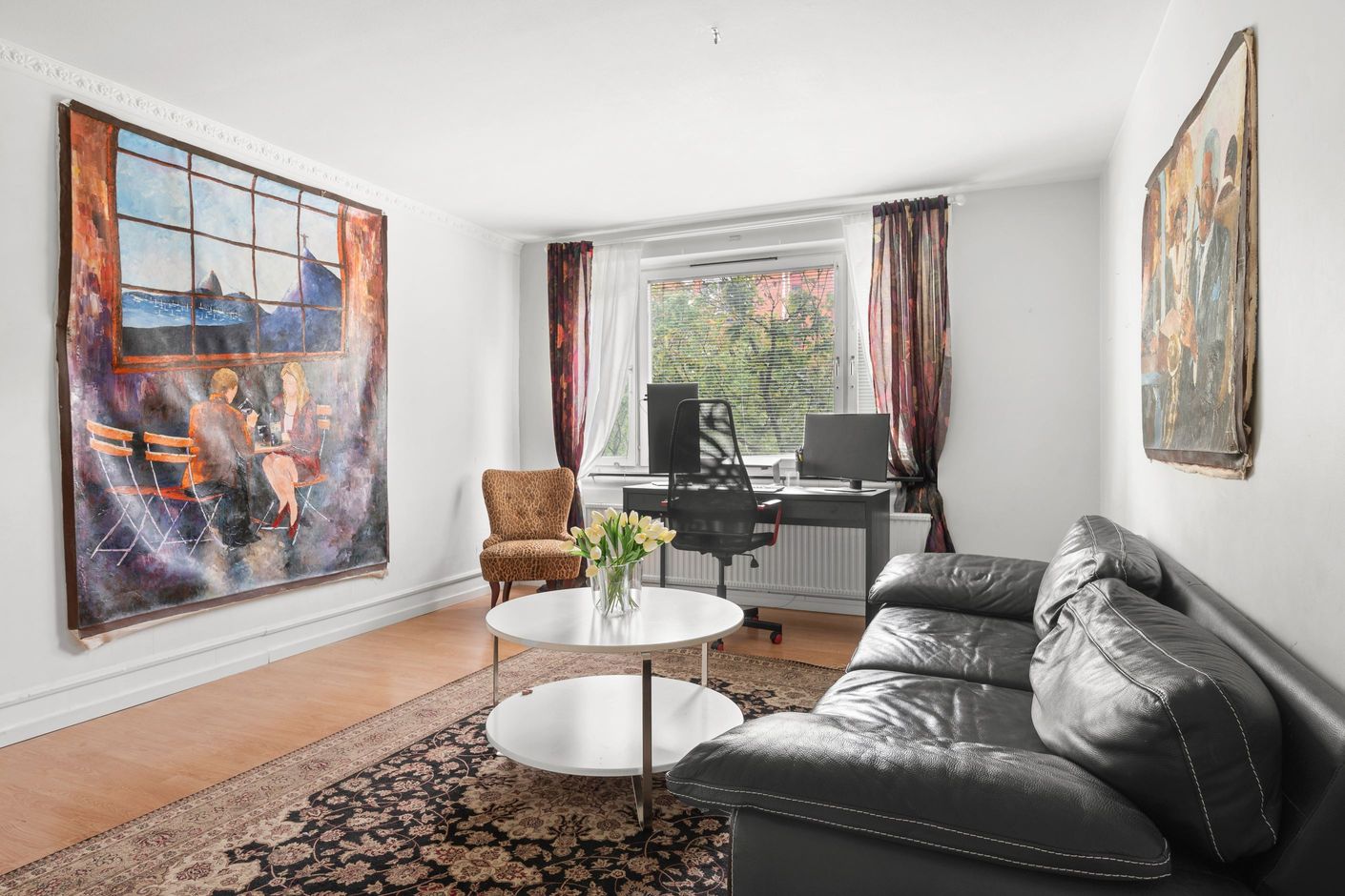 Vardagsrummet bjuder på generösa ytor som rymmer både soffgrupp, tv-hörna och extra matplats – perfekt för mysiga hemmakvällar eller middagar med vänner.