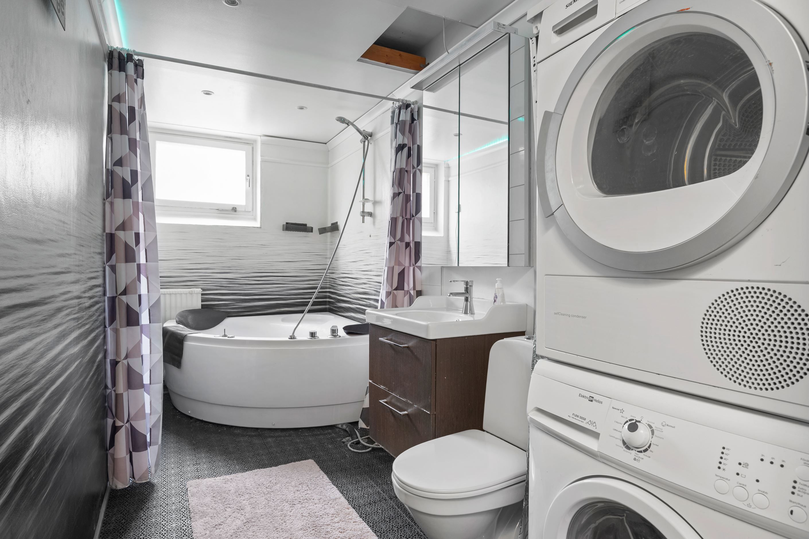 Badrummet är stort och funktionellt med badkar med jacuzzi, wc, handfat samt med tvättmaskin – praktiskt för vardagens behov.